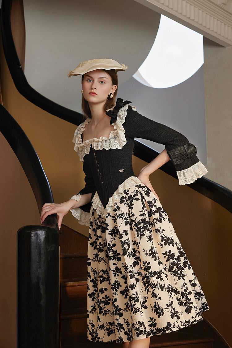 The corset top is crafted from a textured boucle tweed woven entirely with matte yarns – giving all the nostalgic charm of antique silhouettes without the heavy sheen. Fully lined in glossy stretch satin with a soft silk-like finish, it’s structured yet smooth on the skin – comfy enough to wear from day to night.