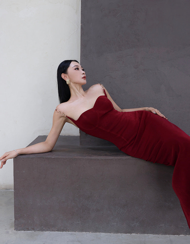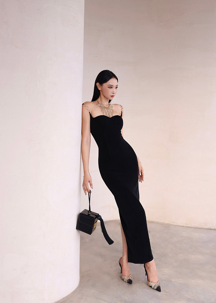 The elastic shoulder straps connect with a sleek metal ring, bringing comfort and edge in one effortless touch. And that open back? It brings all the drama in the most elegant way.