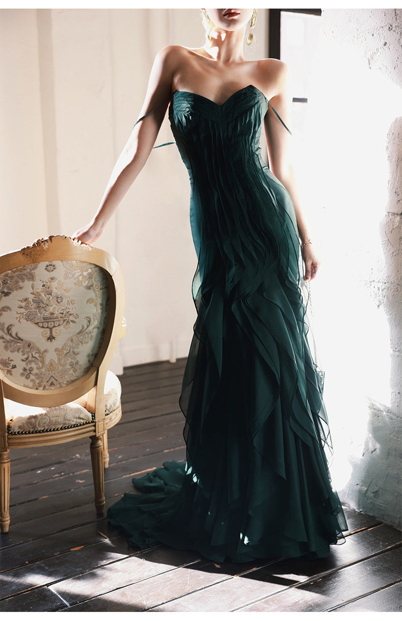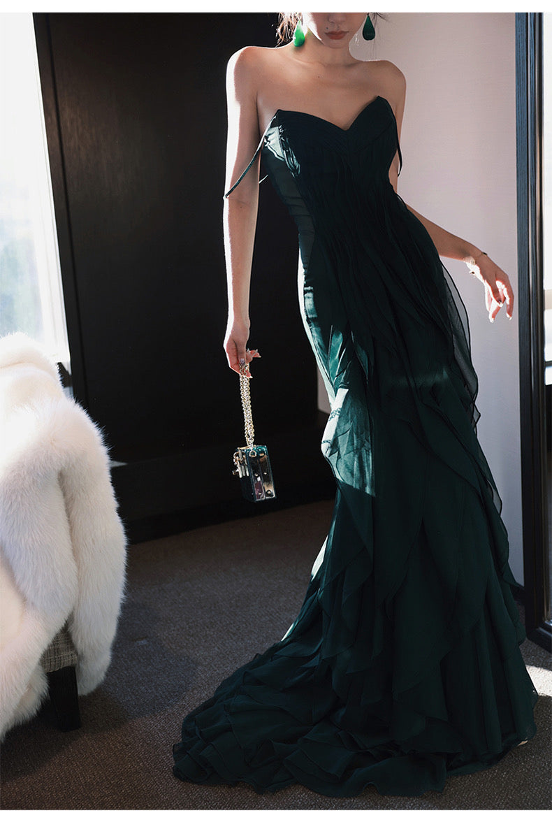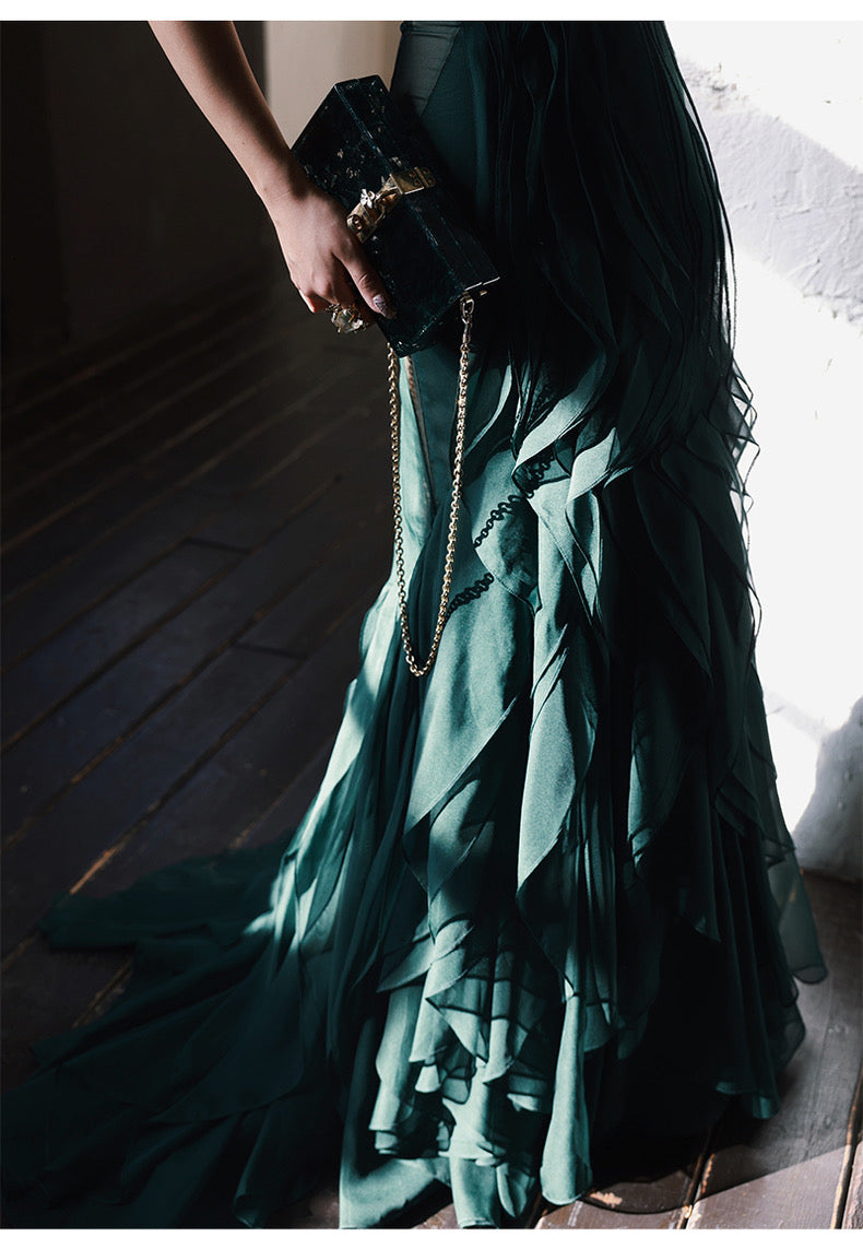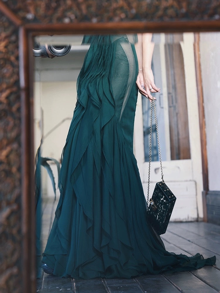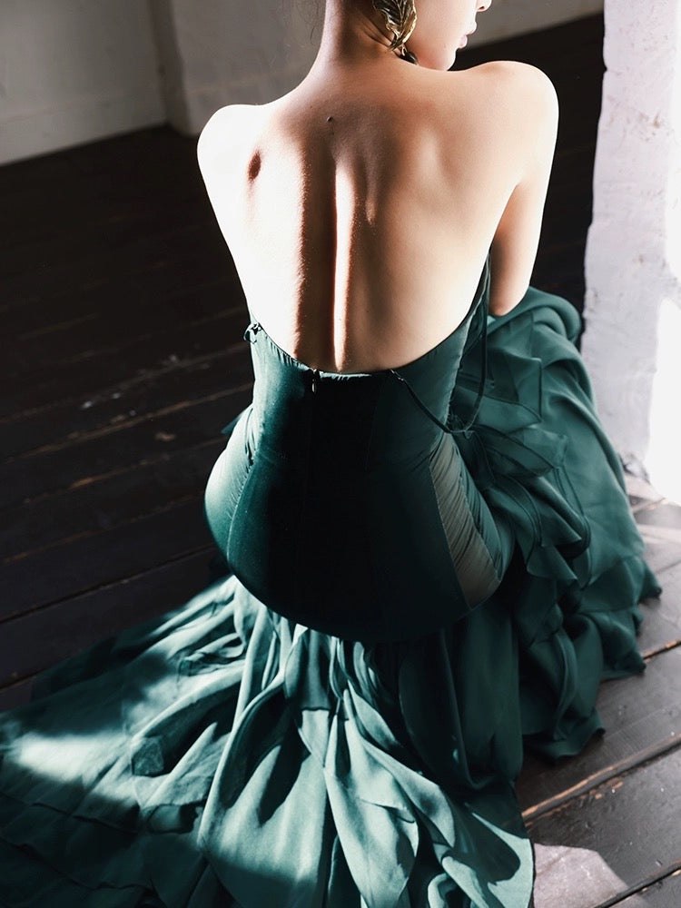 The neckline features ten layers of curved cascading flounces, skillfully designed to complement your natural curves. On the front, 18 gracefully shaped flounces differ in length, enhancing the dress’s flowing nature. Achieving the perfect wave along the edges required a diagonal cutting technique, and each flounce needed precise hand positioning on a supportive fabric before it was sewn, ensuring harmony in spacing and angles.