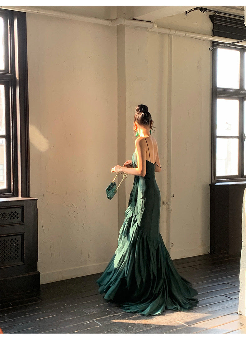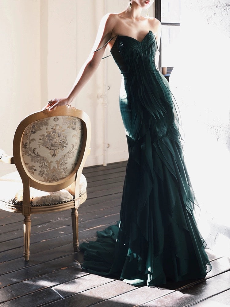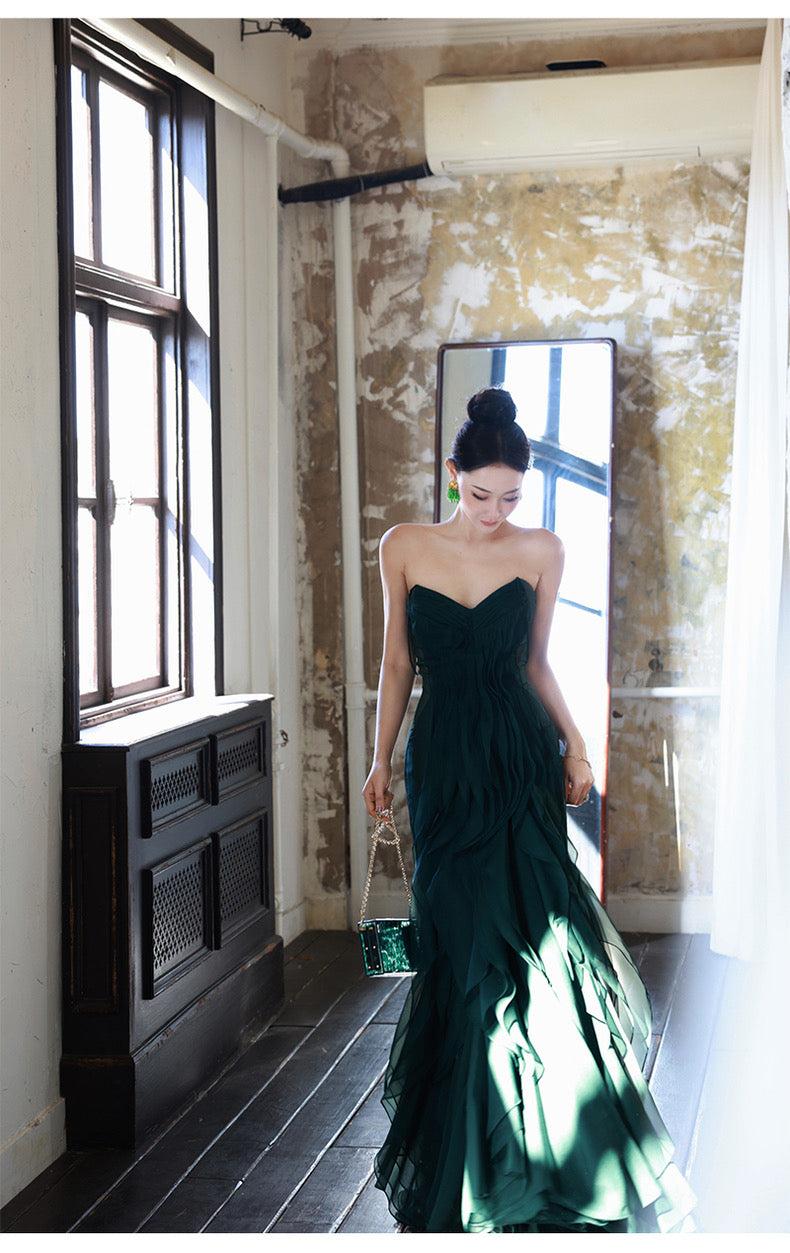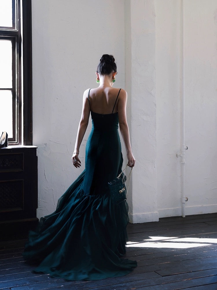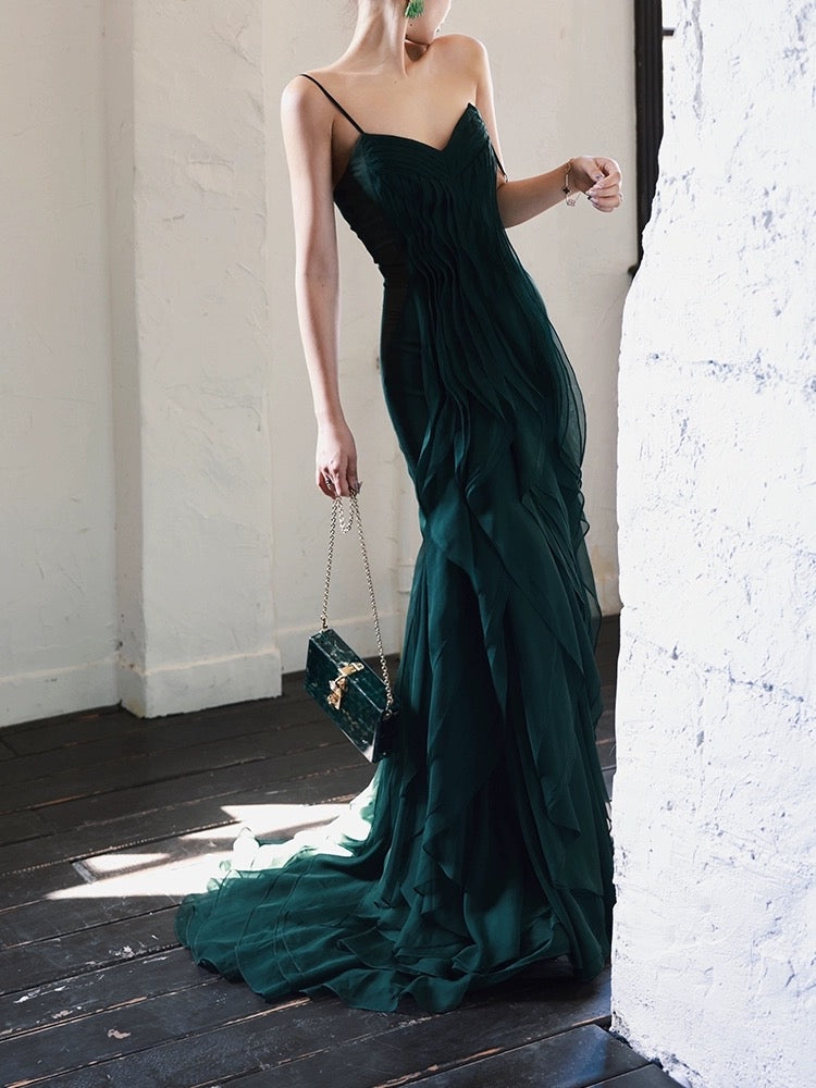 The neckline features ten layers of curved cascading flounces, skillfully designed to complement your natural curves. On the front, 18 gracefully shaped flounces differ in length, enhancing the dress’s flowing nature. Achieving the perfect wave along the edges required a diagonal cutting technique, and each flounce needed precise hand positioning on a supportive fabric before it was sewn, ensuring harmony in spacing and angles.