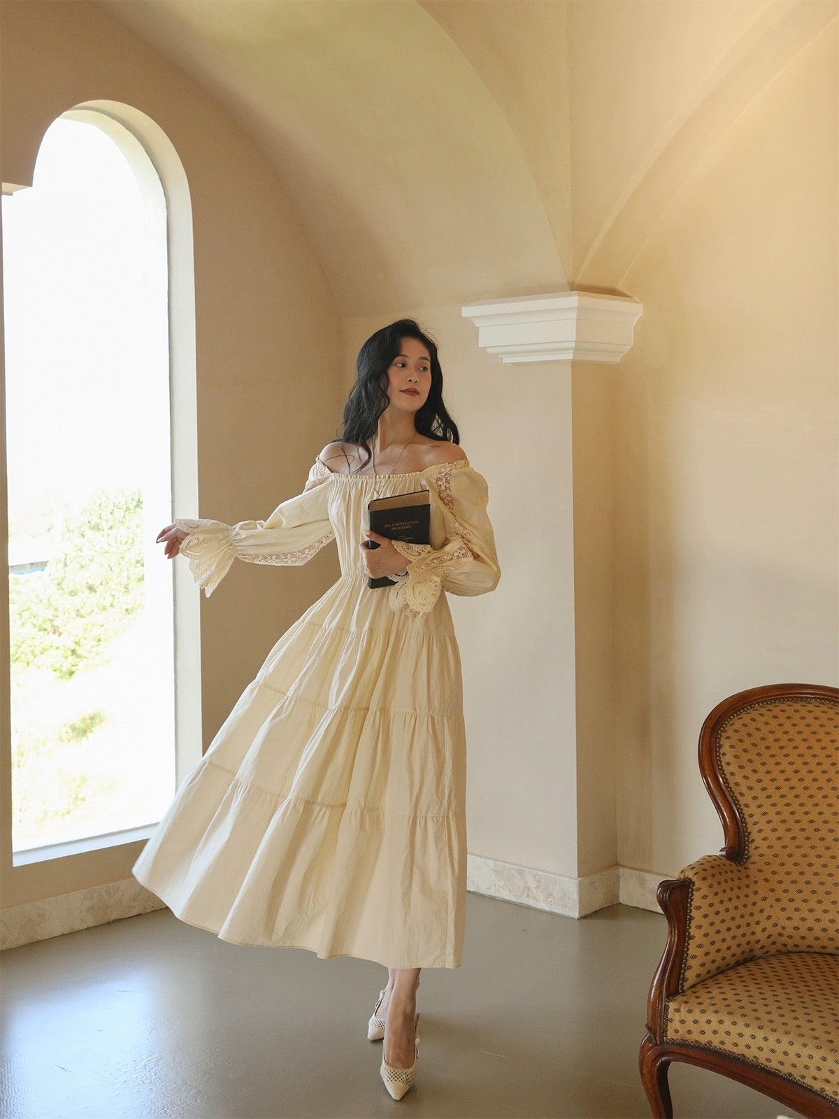 With a wide off-shoulder neckline and a dramatic A-line silhouette, the Elspie dress brings just the right amount of ceremonial drama and vintage flair. We added elastic details at the neckline, waist, and cuffs for that easy, cinched-in elegance that flatters without constraining. And yes, it’s designed with versatility in mind—you can wear the sleeves on or off the shoulder, depending on your vibe that day. One dress, two moods.