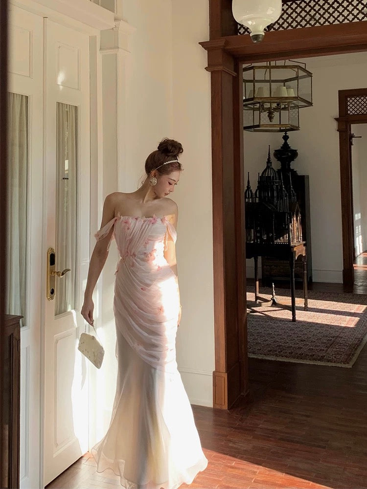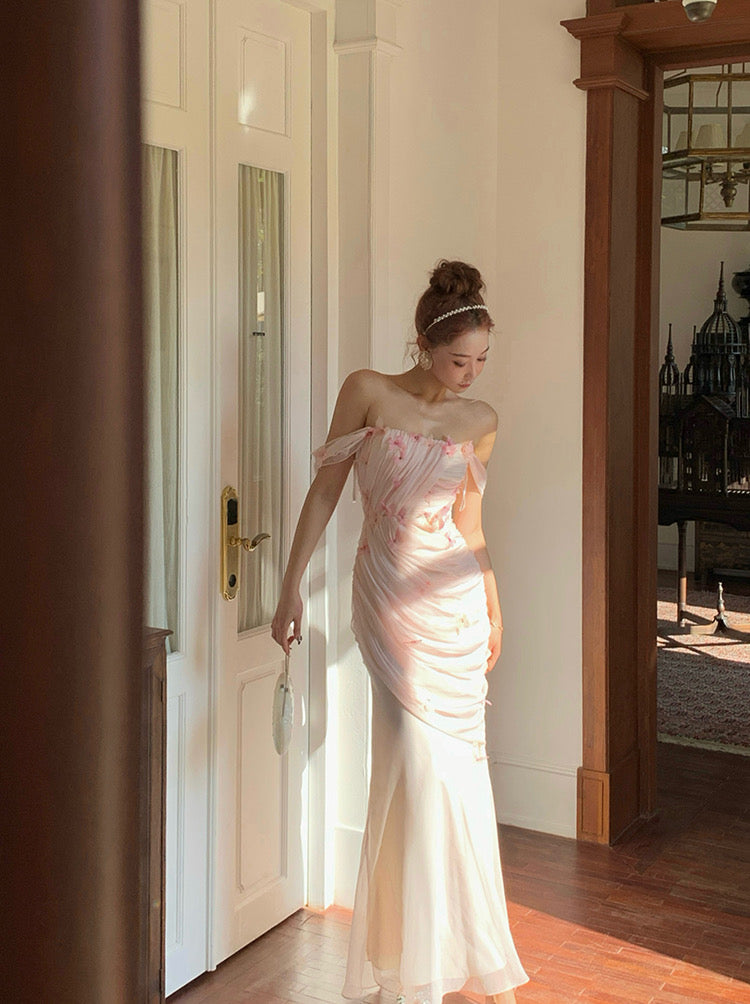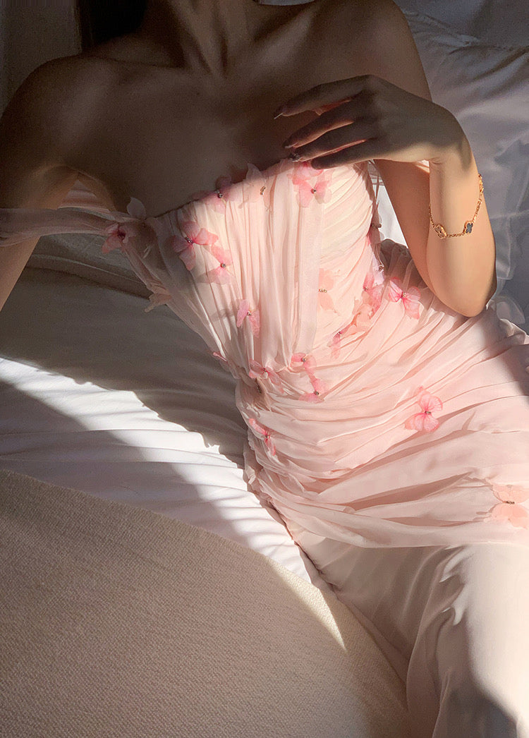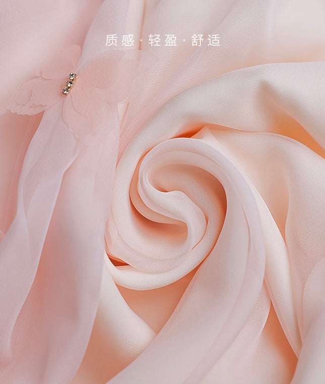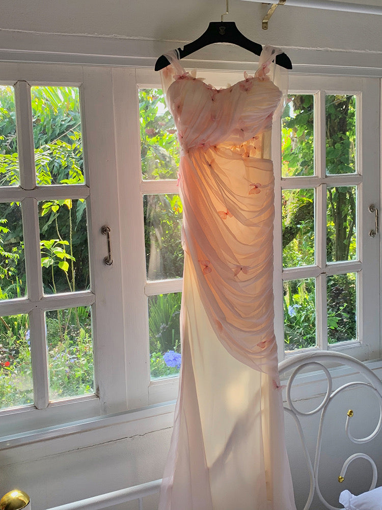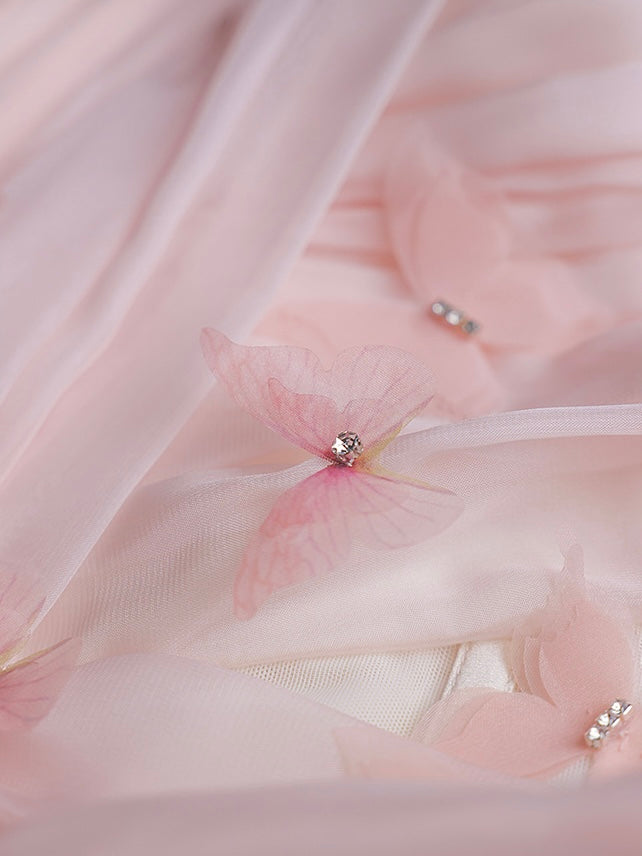 Handcrafted with 32 three-dimensional zircon butterfly embellishments, the bodice sparkles and dances with your every move, adding a touch of whimsy and elegance. The day-and-night floral fabric is a sublime, soft chiffon that maintains an ethereal lightness while ensuring a beautiful layered effect.