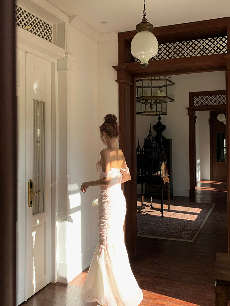 Spring whispers sweet nothings your way with the ‘Honorina’, where a vibrant butterfly gracefully rests on your chest, beautifully accentuating your neckline. We’ve designed the bodice to embrace your figure with soft, flowing curves, creating a stunning silhouette. The left side of the waist features two layers of sheer fabric for a hint of skin, inviting endless imagination.