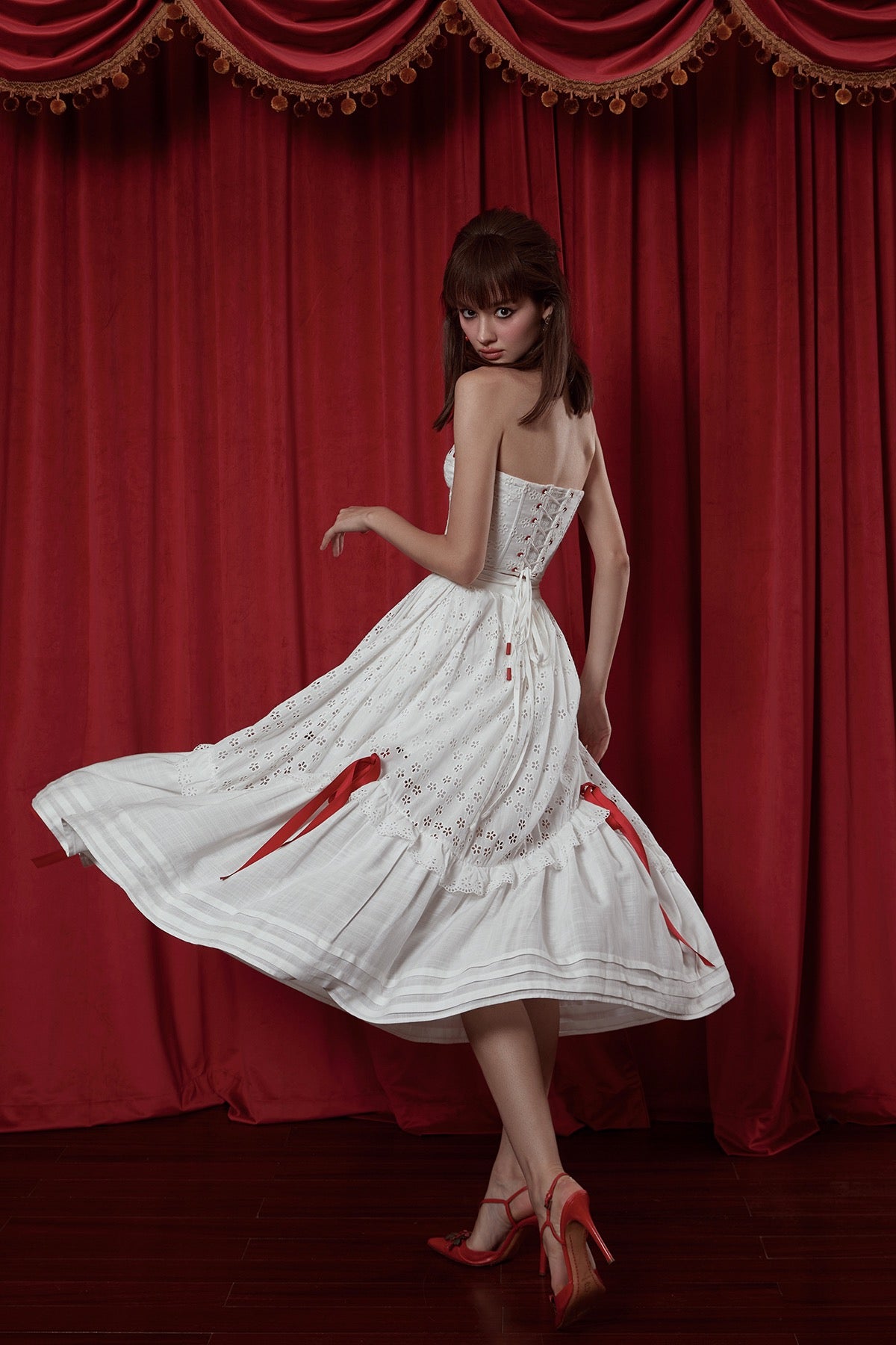 The matching midi skirt swishes with tiered eyelet panels, gentle ruffles and a figure-skimming yoke that ties at the waist with interchangeable ribbons, pick white for understated charm or keep the red for a pop of dolce-vita drama. Lightweight lining keeps things breezy, and the adjustable hook detail means the fit feels as dreamy as it looks.