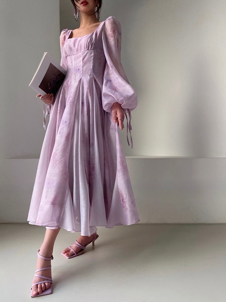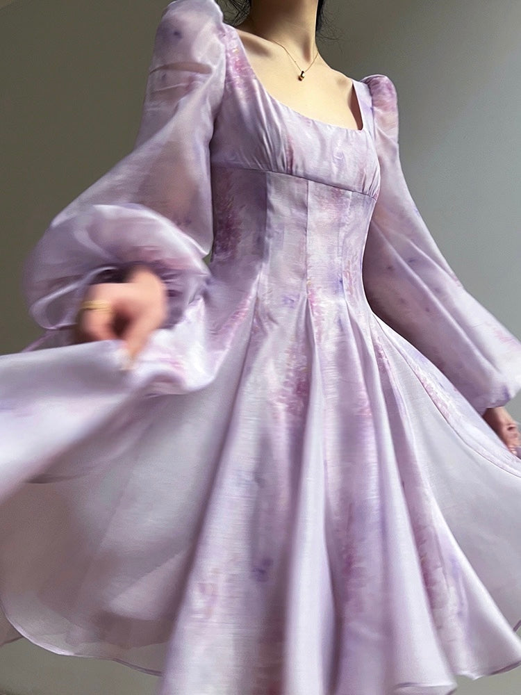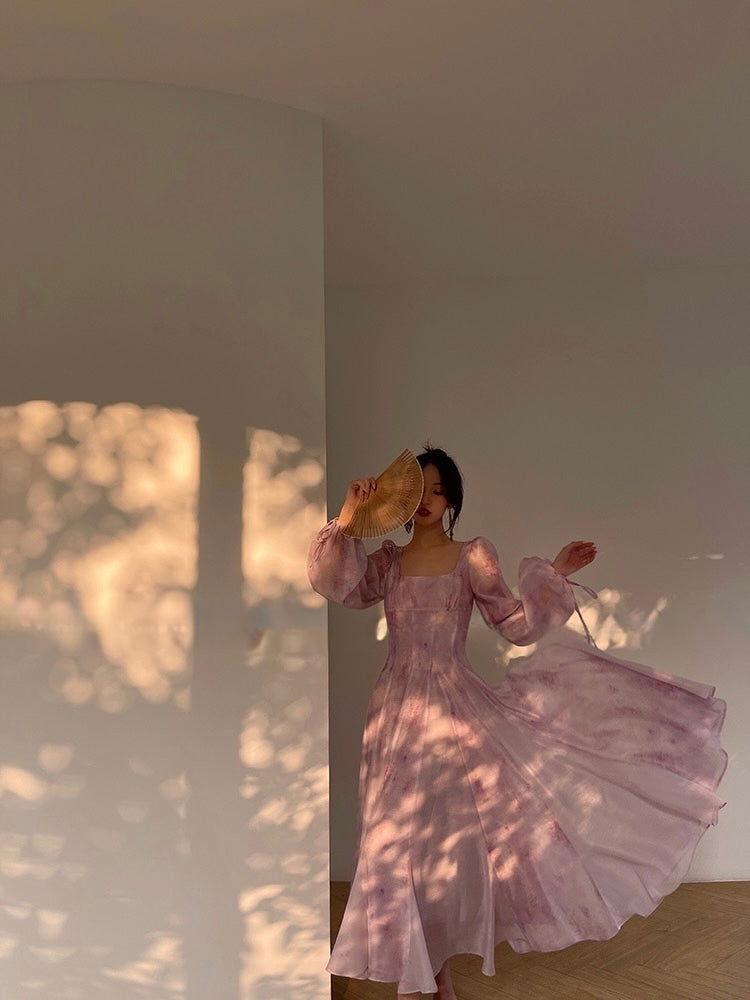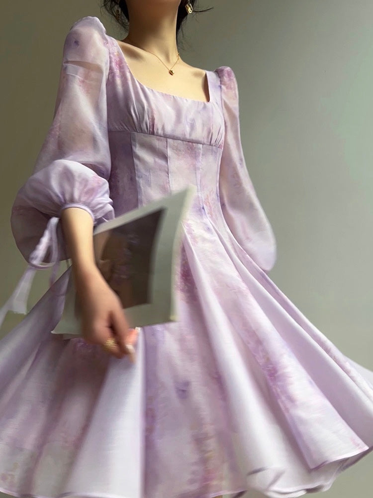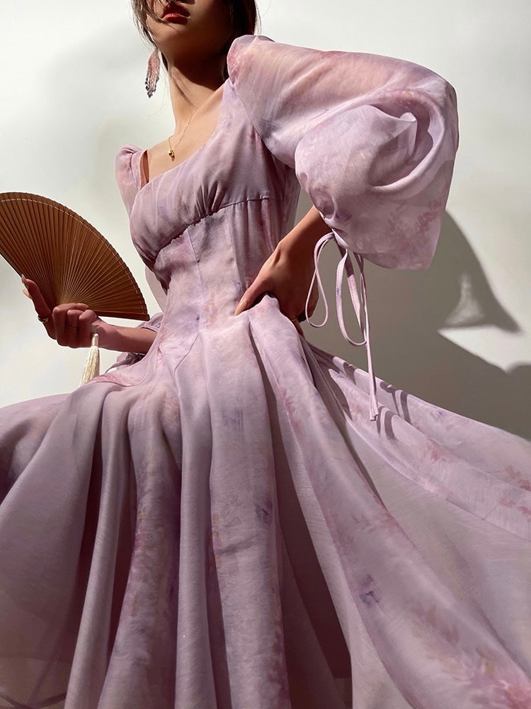 The elegant French square neckline enhances a swan-like grace, flaunting an alluring collarbone, while multiple seams refine the waistline for a perfect balance of comfort and elegance. Each detail, from the unique patchwork to the meticulously crafted silhouette, pays homage to couture’s artistry.