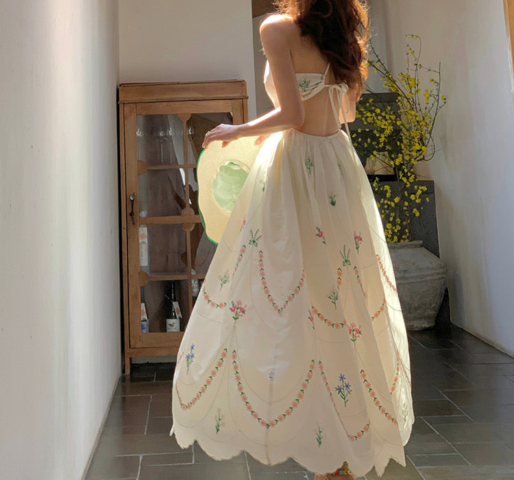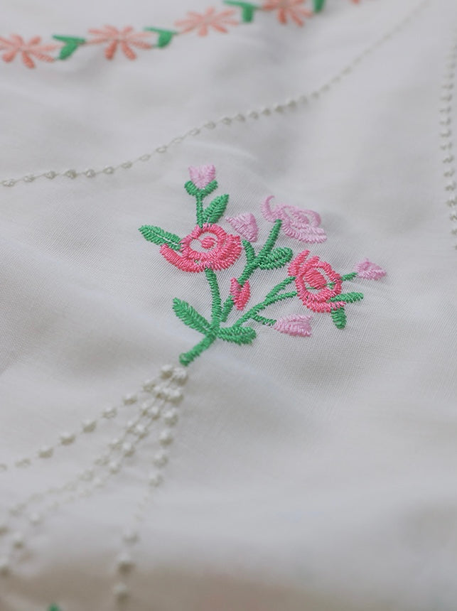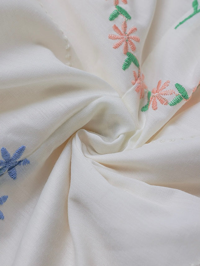 Delicate embroidered wavy details at the hem lend a youthful, feminine touch. Crafted from skin-friendly cotton with exquisite floral embroidery, this fabric is soft and breathable, keeping you cool even on warm days. The fine floral and vine embroidery creates a stylish, three-dimensional design that embodies elegance and romance, reminiscent of a blooming flower garden.