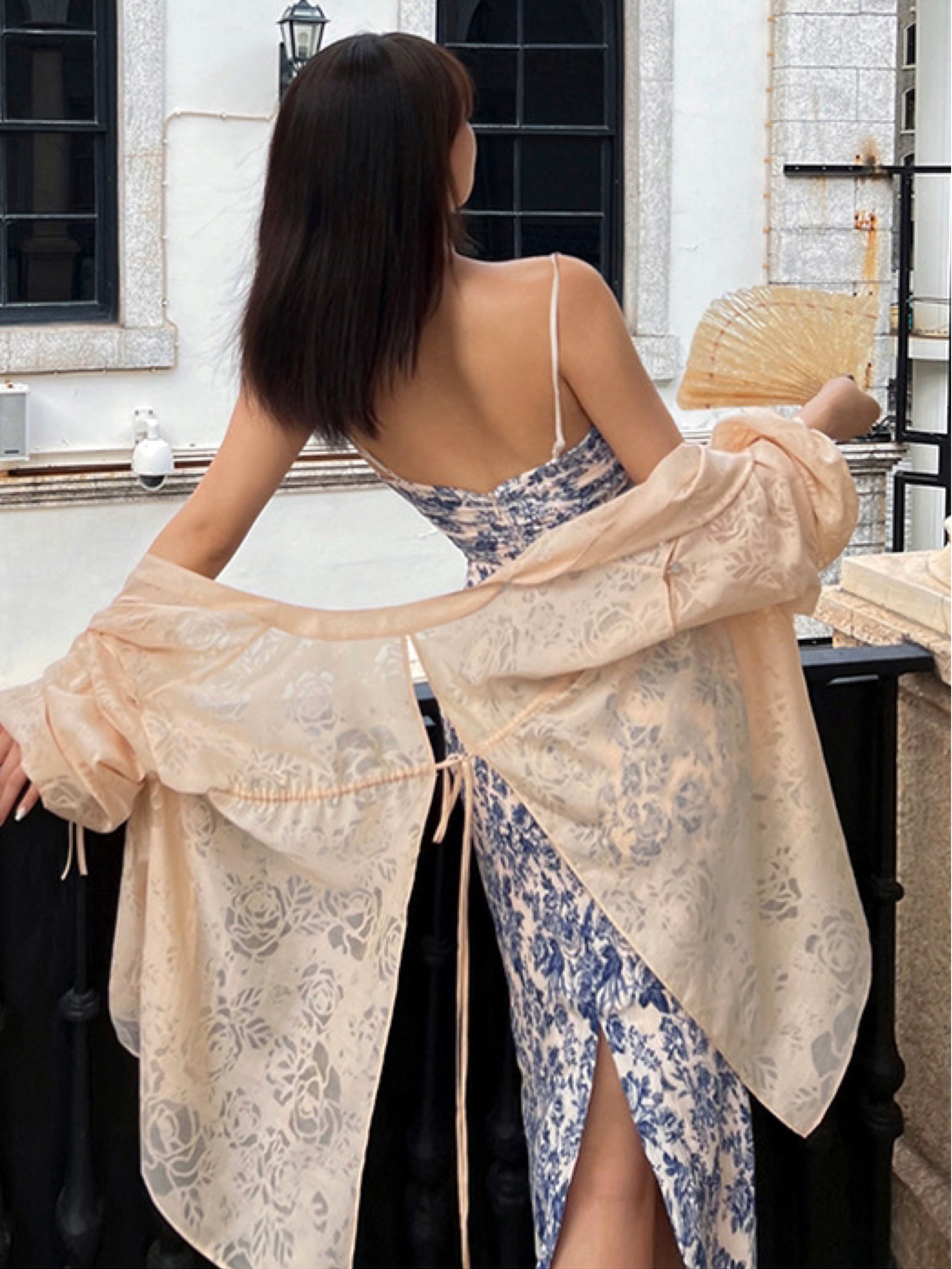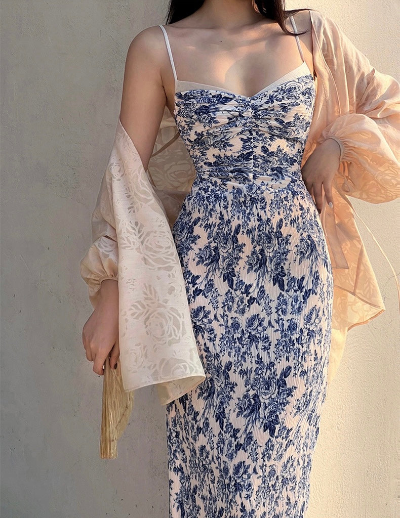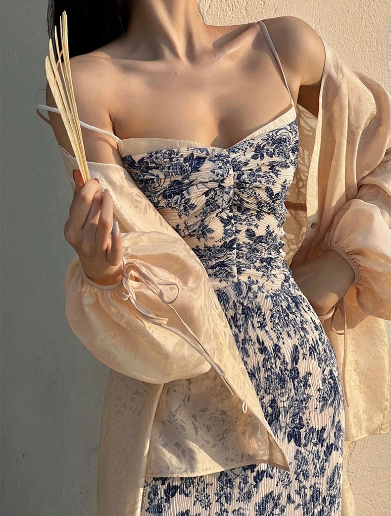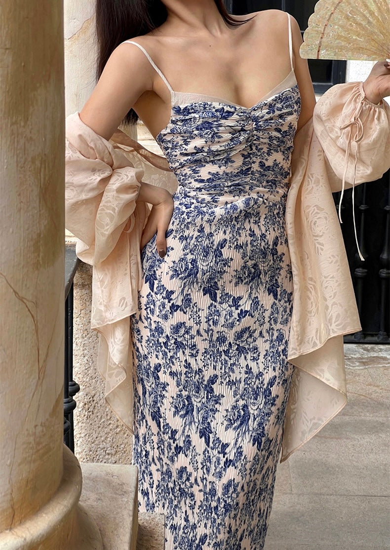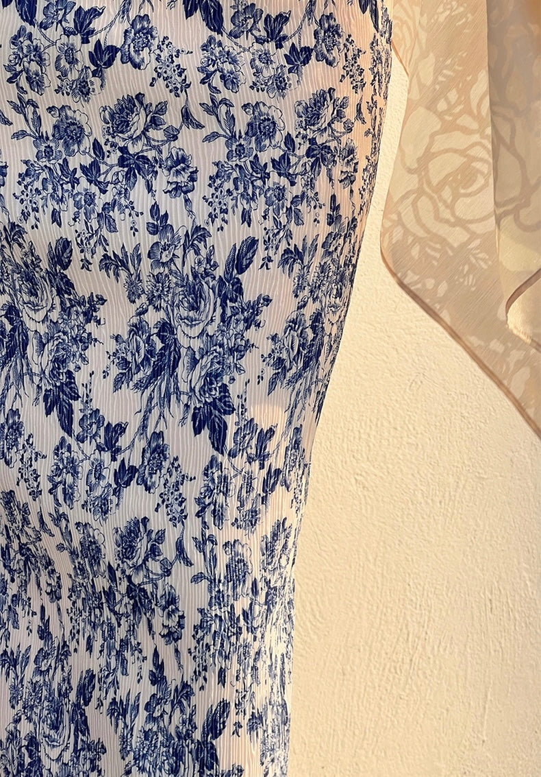The Ronaldette dress beautifully fuses traditional elegance with modern flair. Its vibrant colors and intricate patterns flow gracefully across the fabric, evoking the serene charm of a Chinese pavilion steeped in romance. Crafted from a custom material, we proudly utilize a dual-process technique of printing and pleating, inspired by the timeless beauty of blue-and-white porcelain.