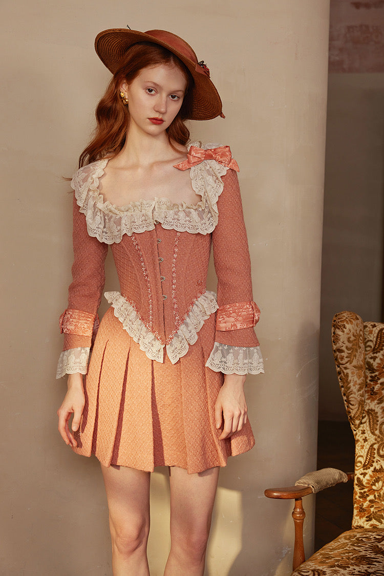 Inspired by silk boned evening dresses from 1876–1878 England, ‘Victorian Maple’ redefines old-world elegance through a fresh, wearable lens. Instead of classic ornate silks, we used a matte-woven tweed: soft, structured, and full of subtle texture. It brings just enough grit to balance out the sweetness, while still feeling refined and detailed.