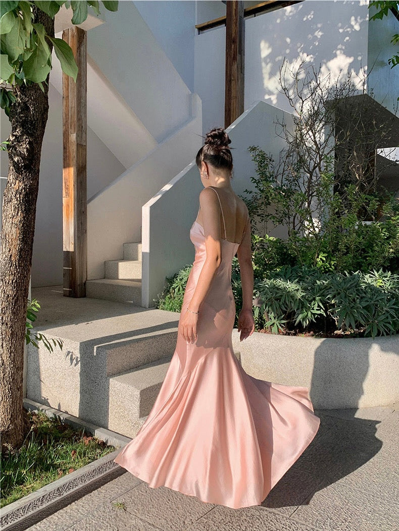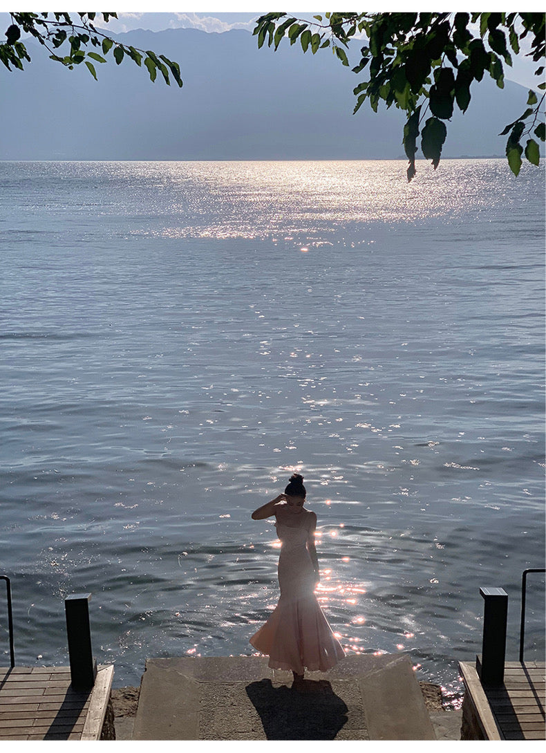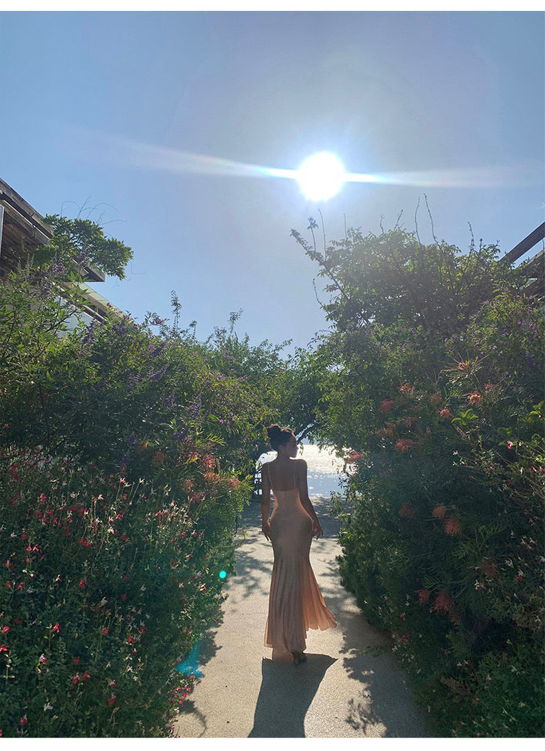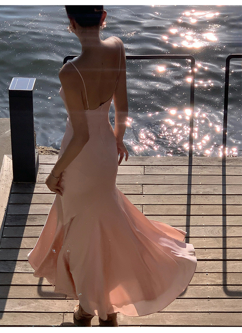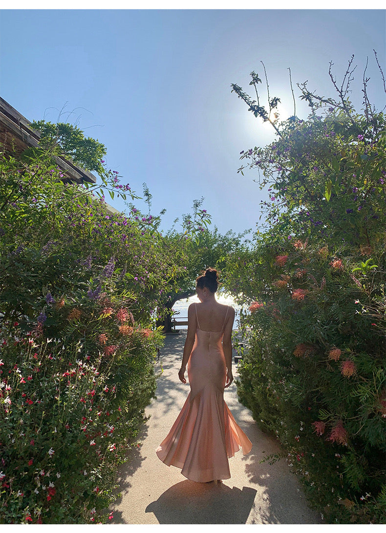 The fishtail hem sculpts the waist and hips with grace, while side slits on both seams add flow and a hint of flirt.