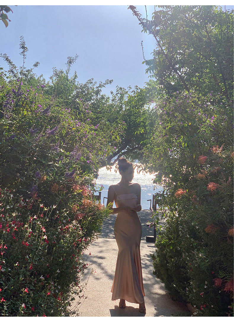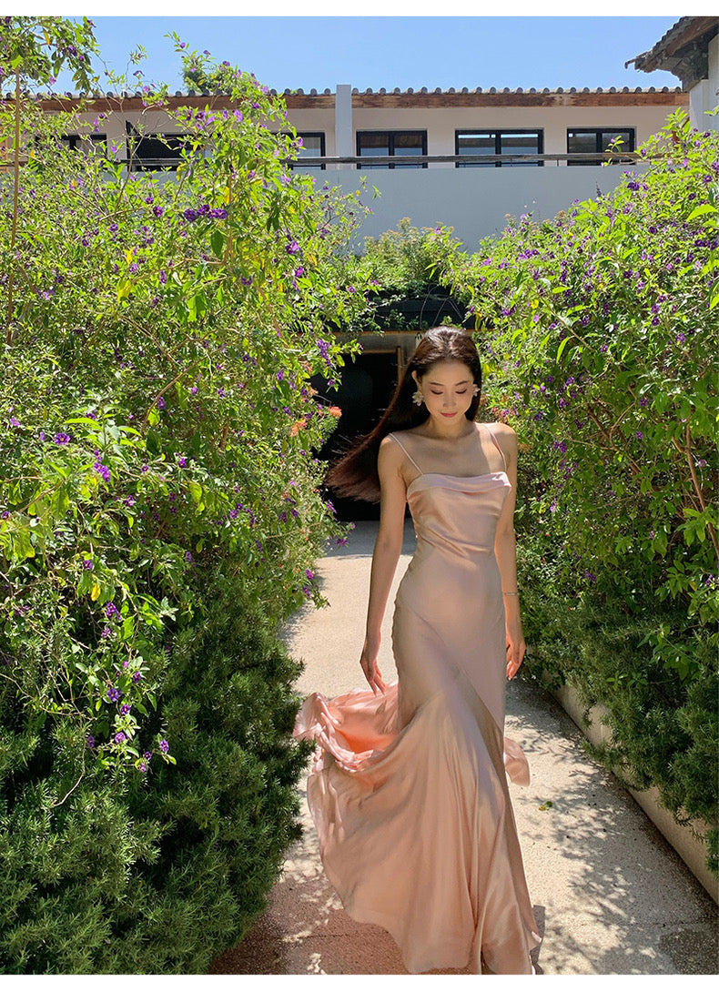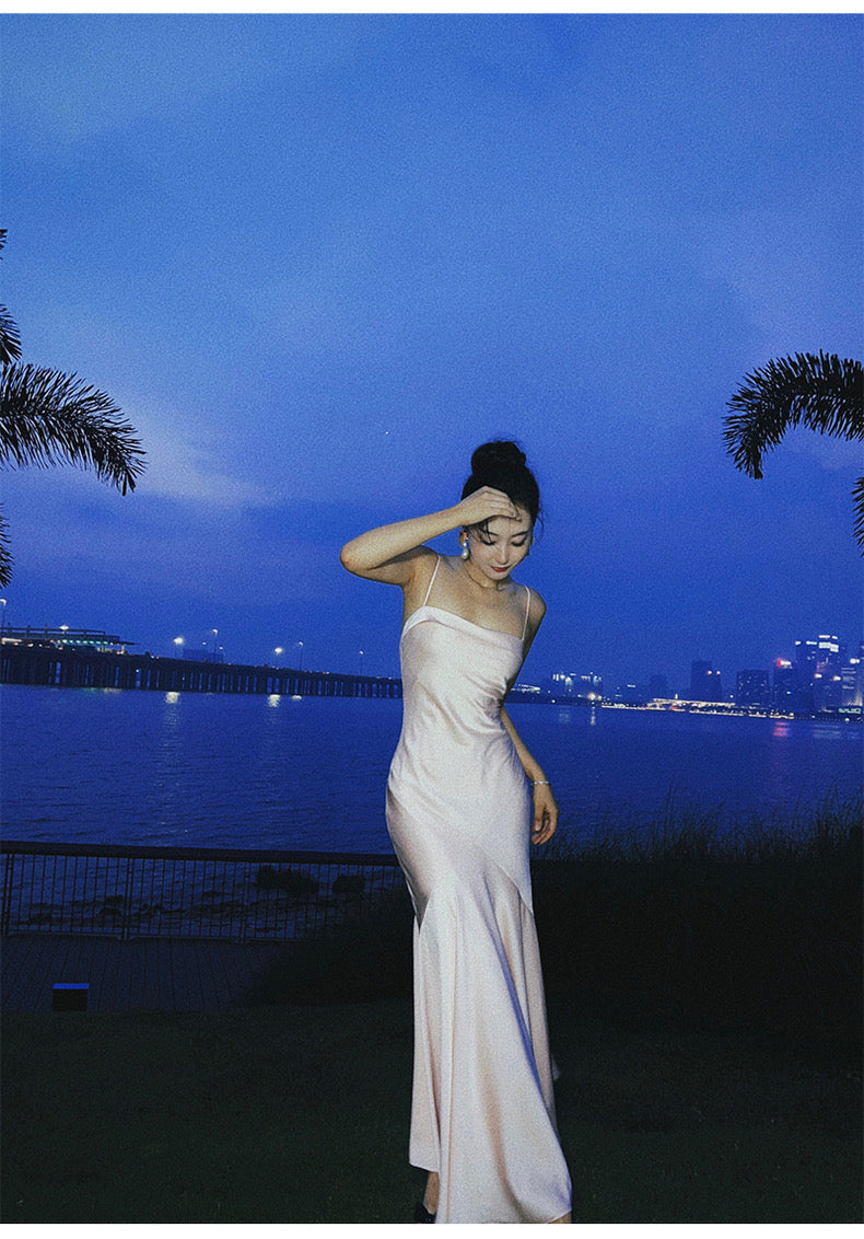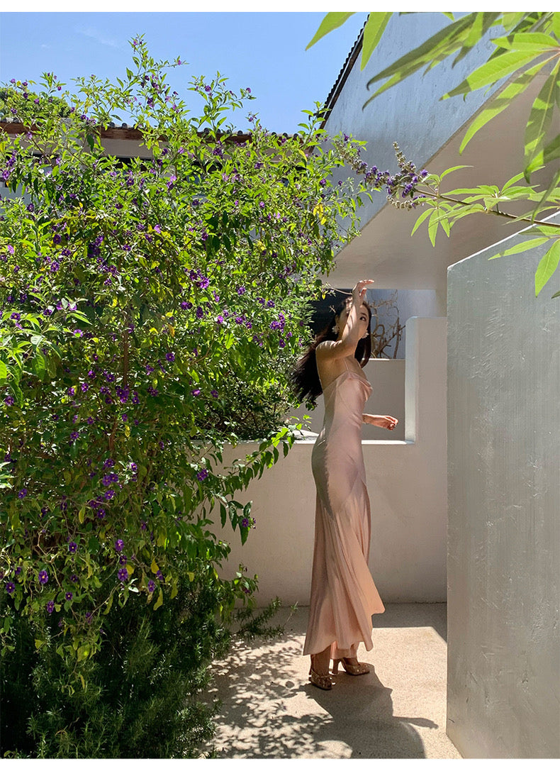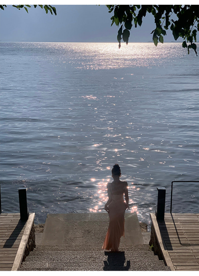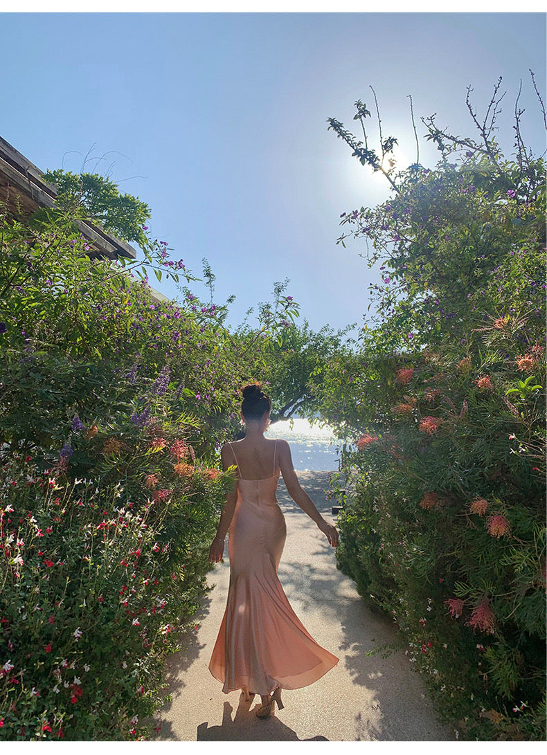 Vitani drapes like liquid silk, catching the light and highlighting your skin with a soft, radiant glow. A folded detail at the chest—understated, sculptural, and quietly luxurious, while two slim straps trace the neckline with subtle charm.