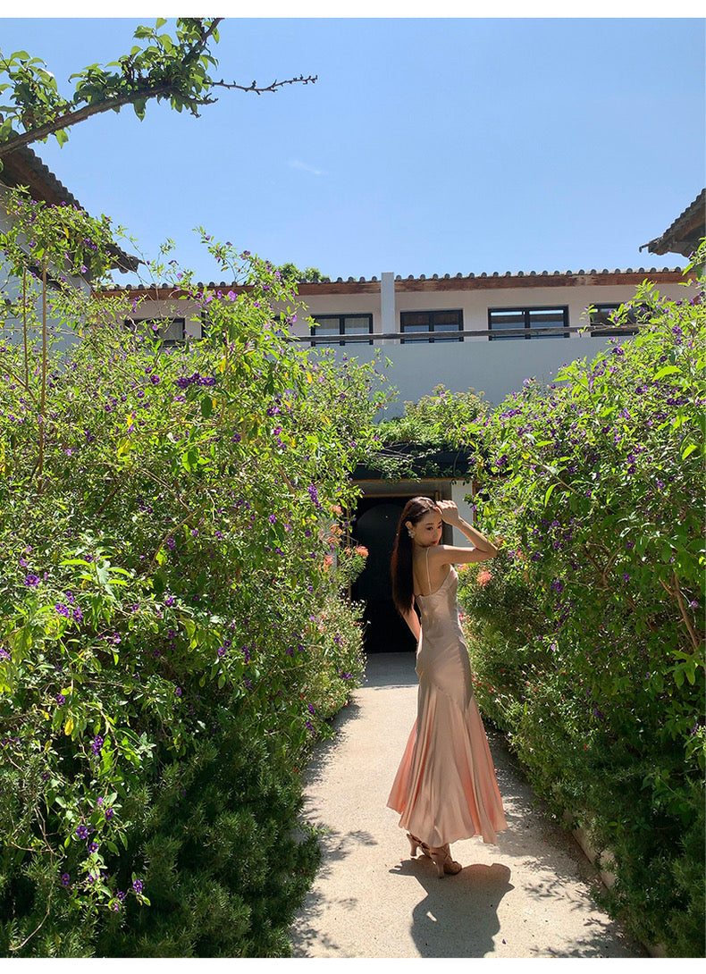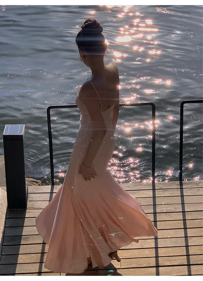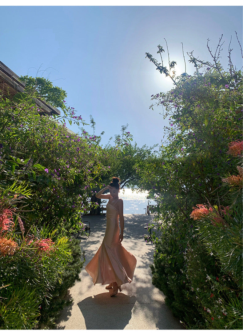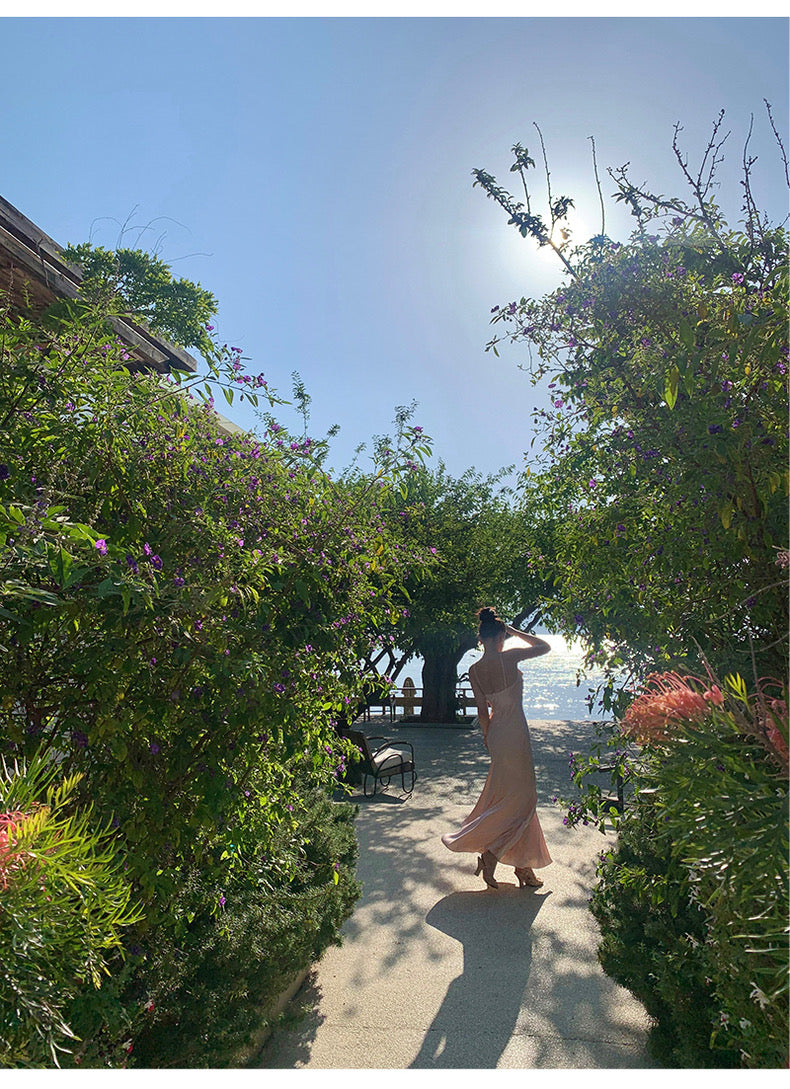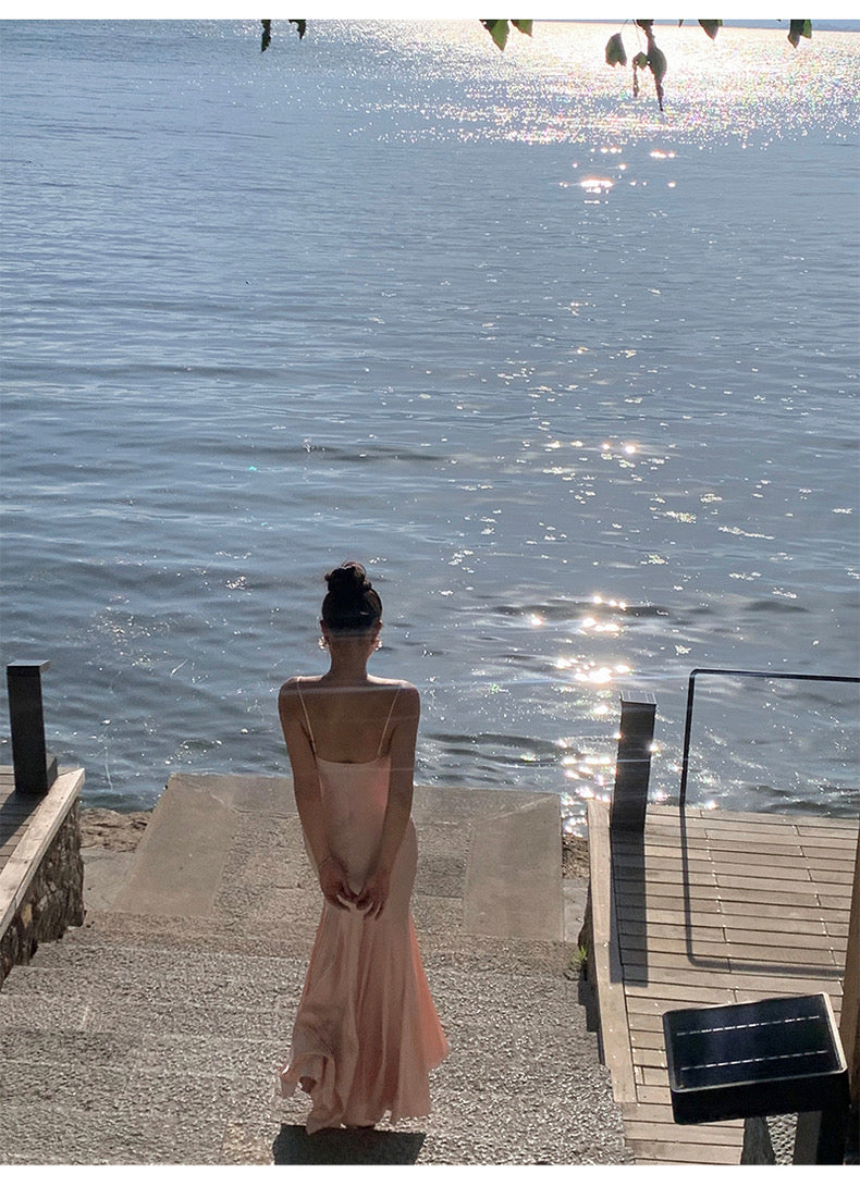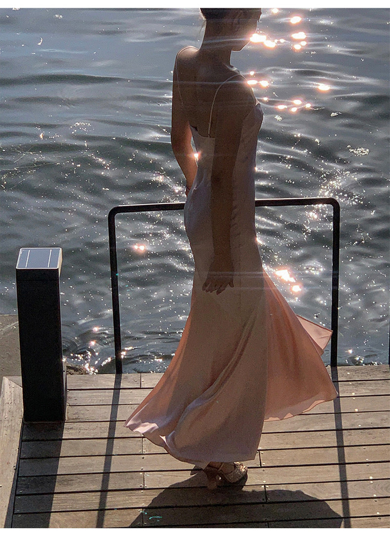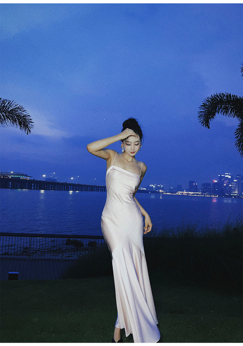 Vitani drapes like liquid silk, catching the light and highlighting your skin with a soft, radiant glow. A folded detail at the chest—understated, sculptural, and quietly luxurious, while two slim straps trace the neckline with subtle charm.