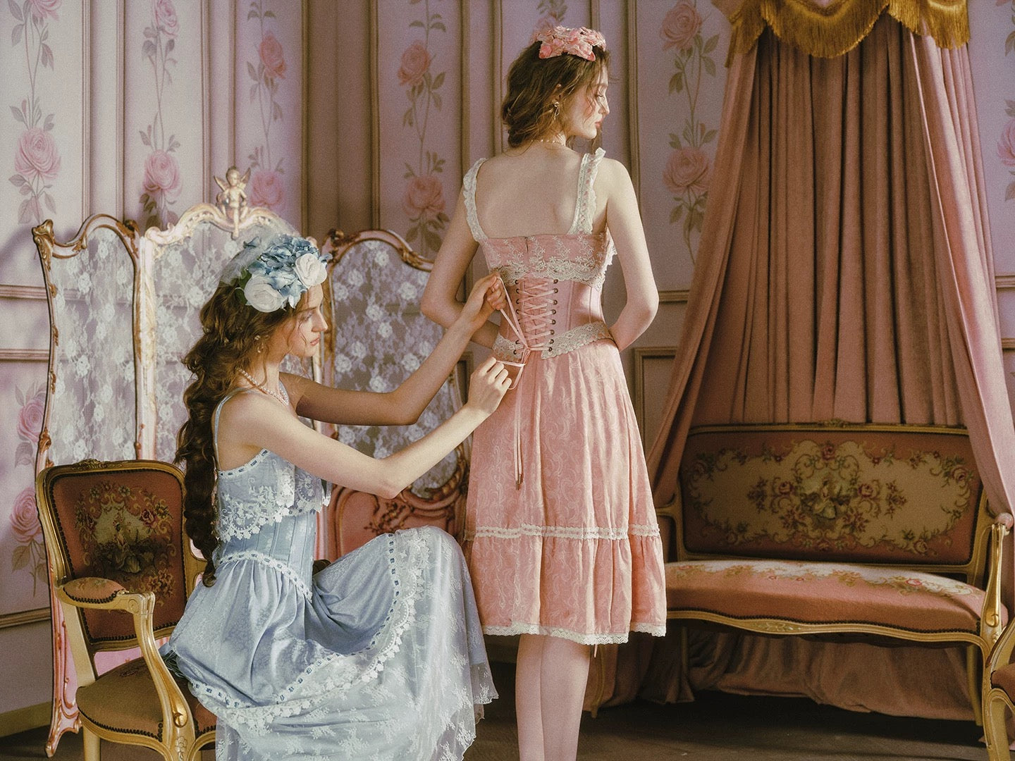 Our ‘Irya’ corset & dress set is a dreamy nod to 1940s cinema, inspired by the iconic film Meet Me in St. Louis. Think bold colors, rich scenes, and that unforgettable doll like charm of Judy Garland, she looked like she’d walked right out of a peach blossom fairytale. We’ve reimagined her timeless silhouette in a way that’s both nostalgic and wearable today.