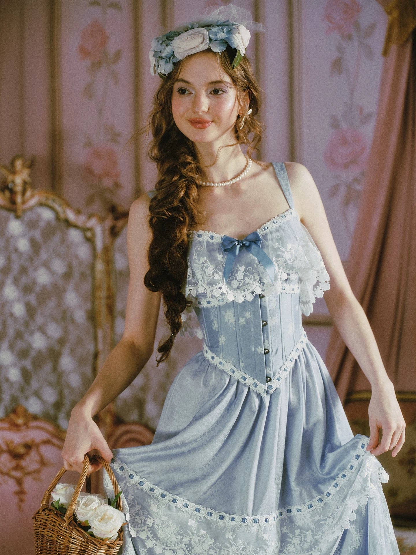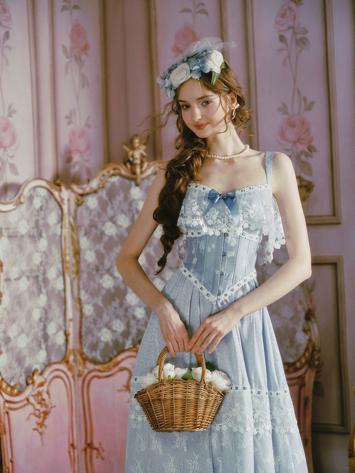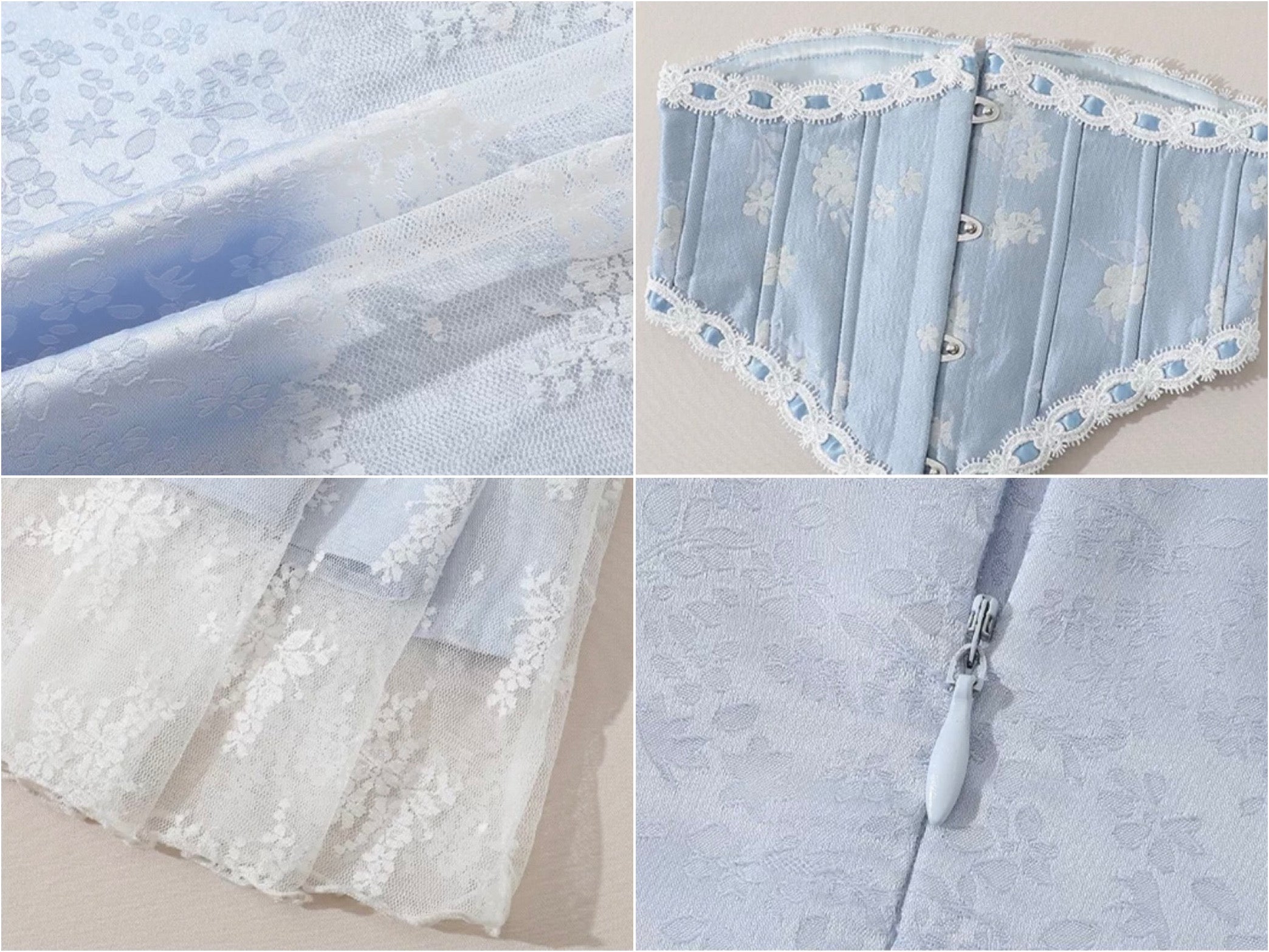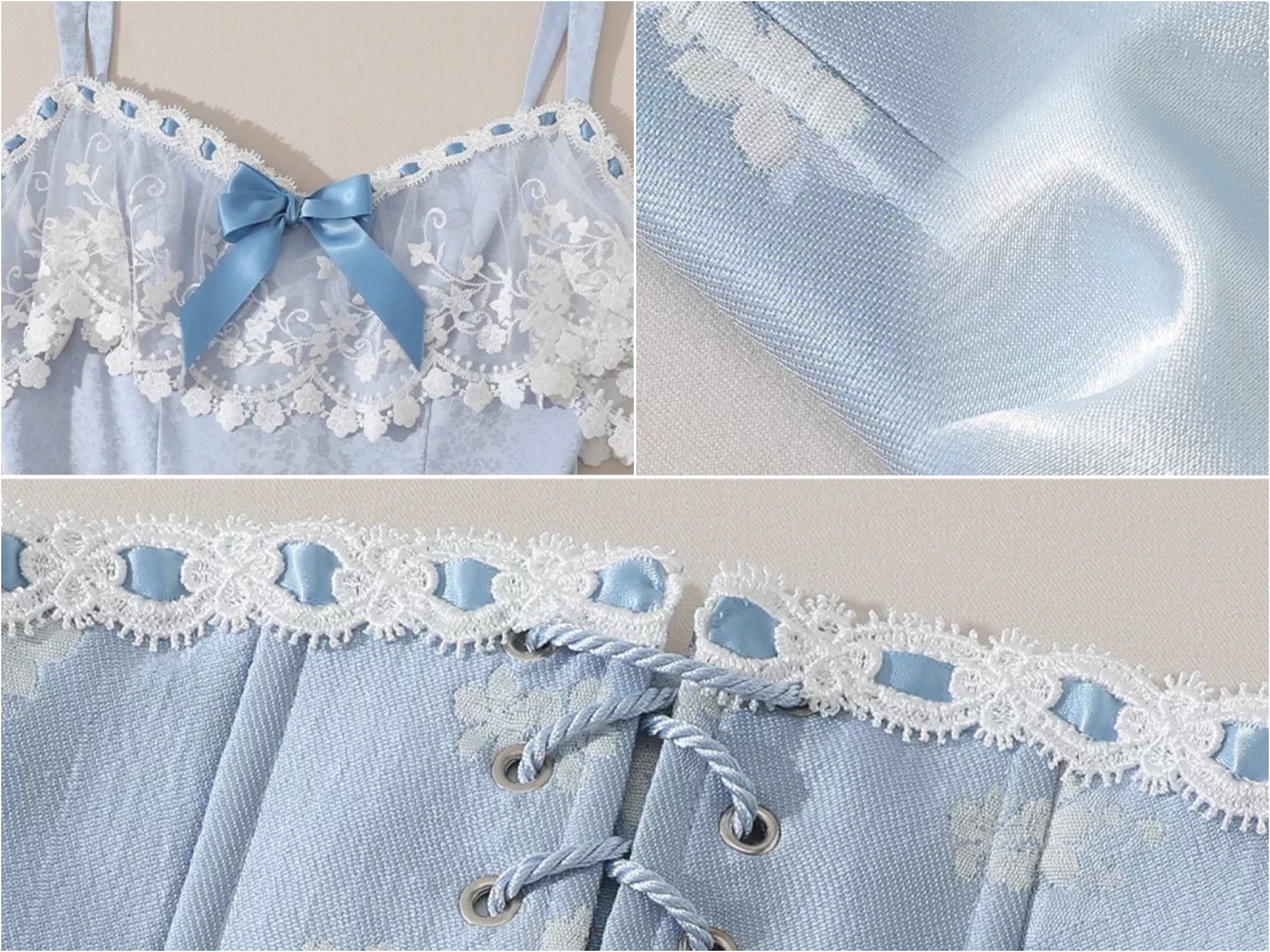 ‘Stellaria’ is the kind of set that feels like a daydream – delicate lace, soft blue hues, and the sweetest little bows all in one. We’ve layered multiple lace trims at the bust, drawing the eye to the charming double bows, while the corset waist cinches beautifully for that effortlessly flattering silhouette.