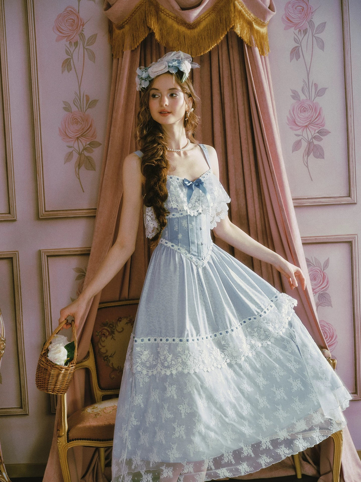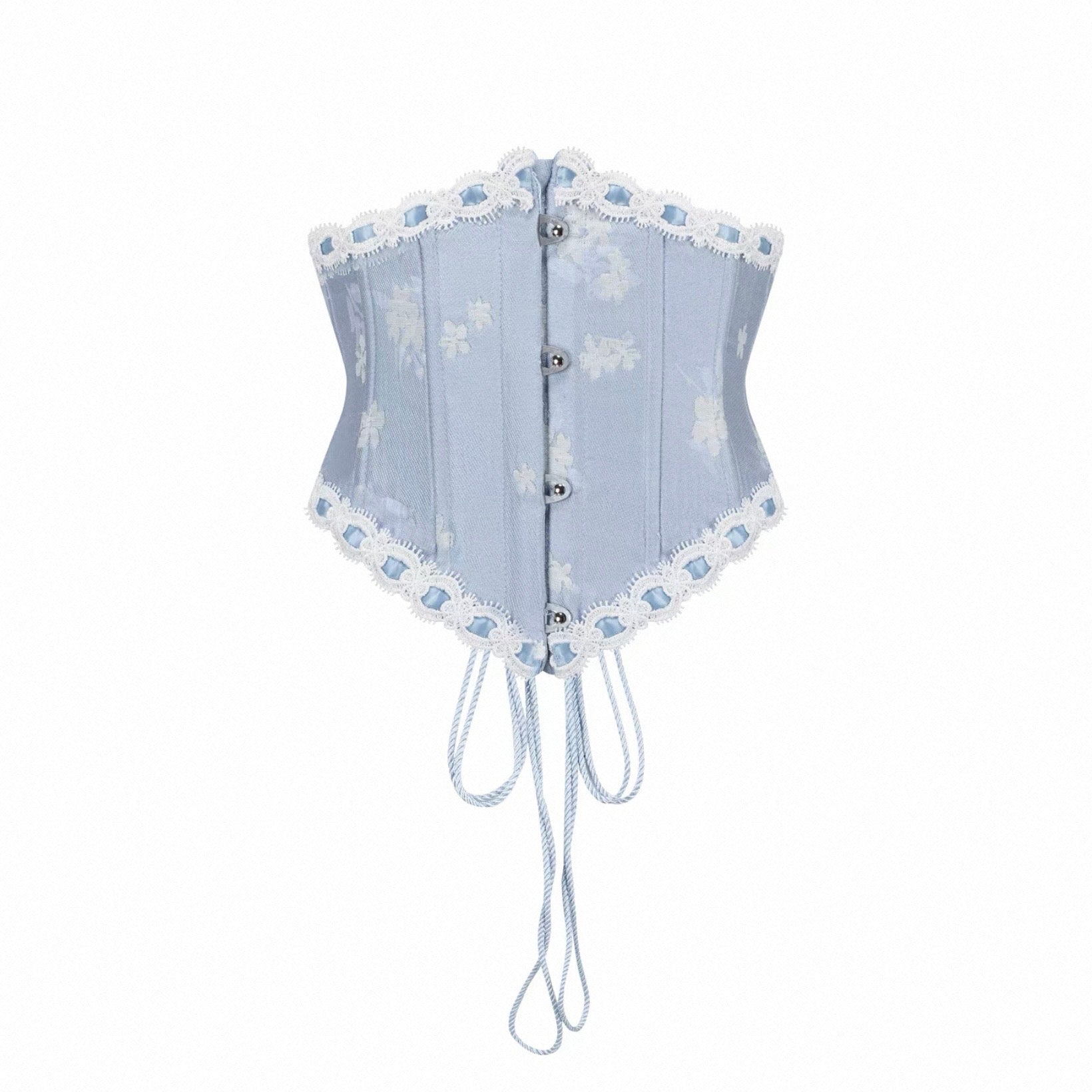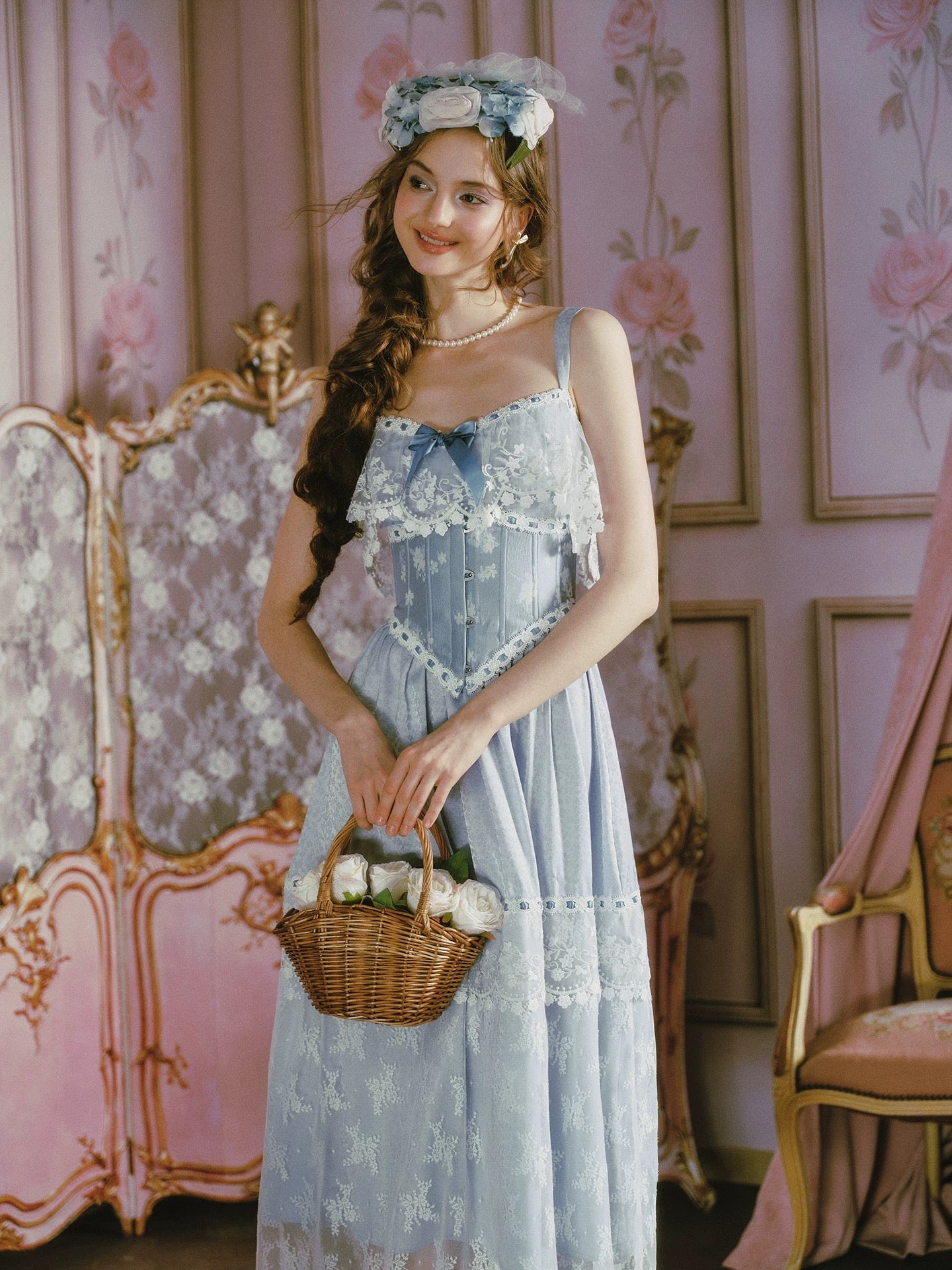 ‘Stellaria’ is the kind of set that feels like a daydream – delicate lace, soft blue hues, and the sweetest little bows all in one. We’ve layered multiple lace trims at the bust, drawing the eye to the charming double bows, while the corset waist cinches beautifully for that effortlessly flattering silhouette.