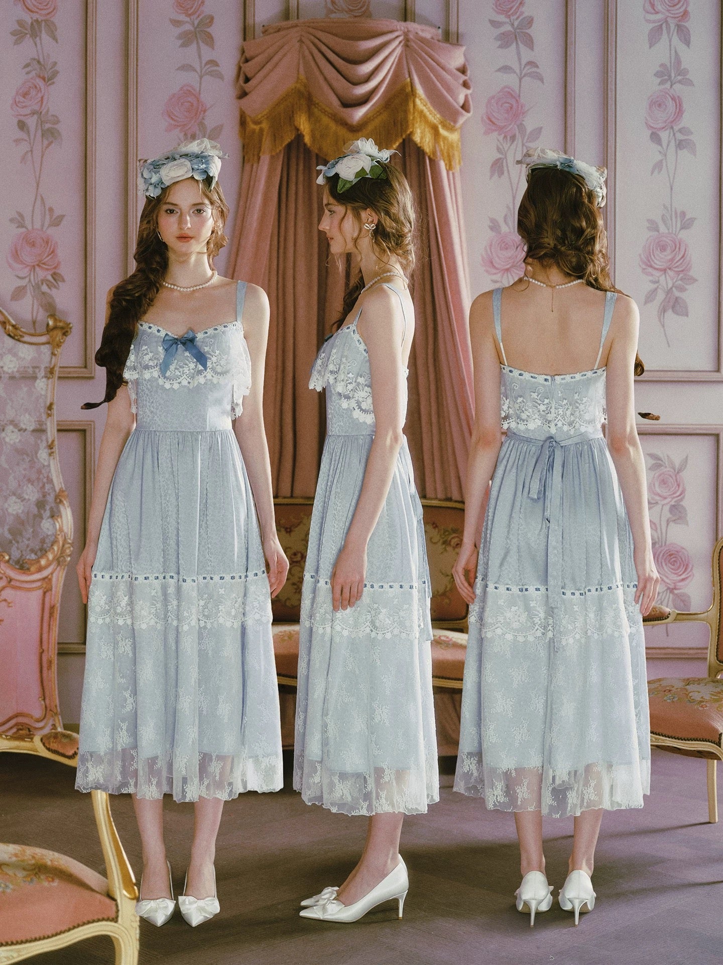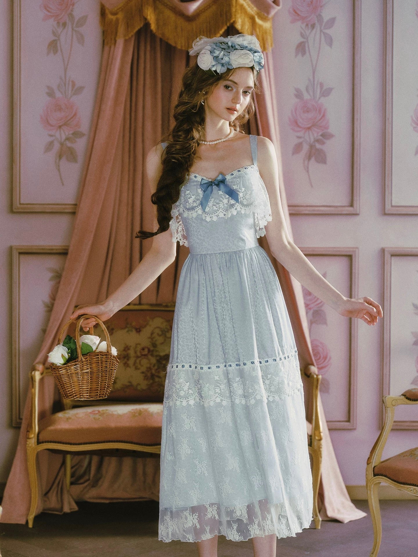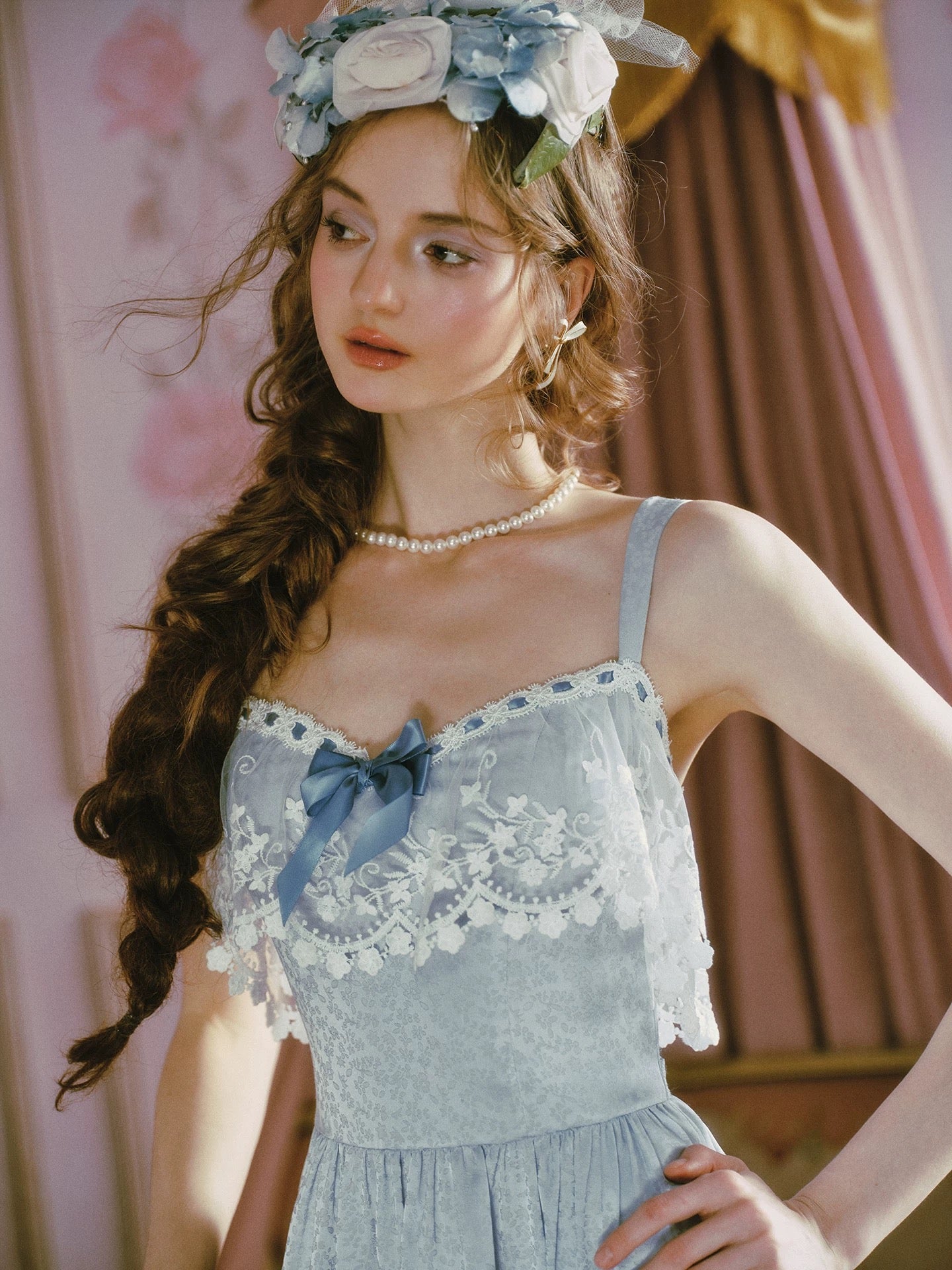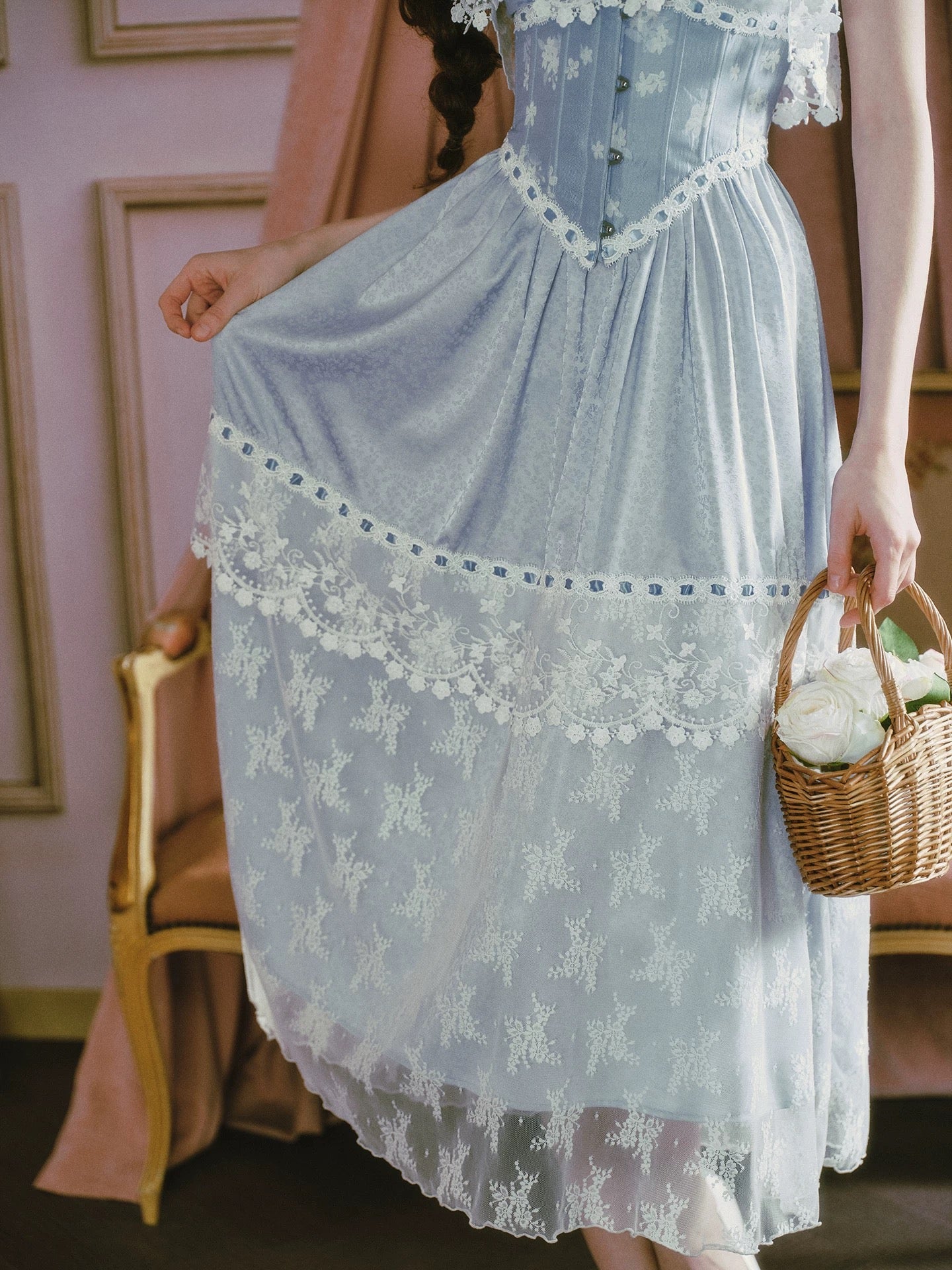 ‘Stellaria’ is the kind of set that feels like a daydream – delicate lace, soft blue hues, and the sweetest little bows all in one. We’ve layered multiple lace trims at the bust, drawing the eye to the charming double bows, while the corset waist cinches beautifully for that effortlessly flattering silhouette.