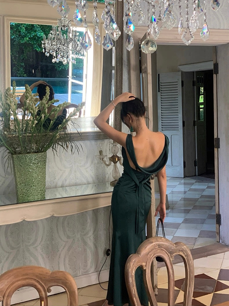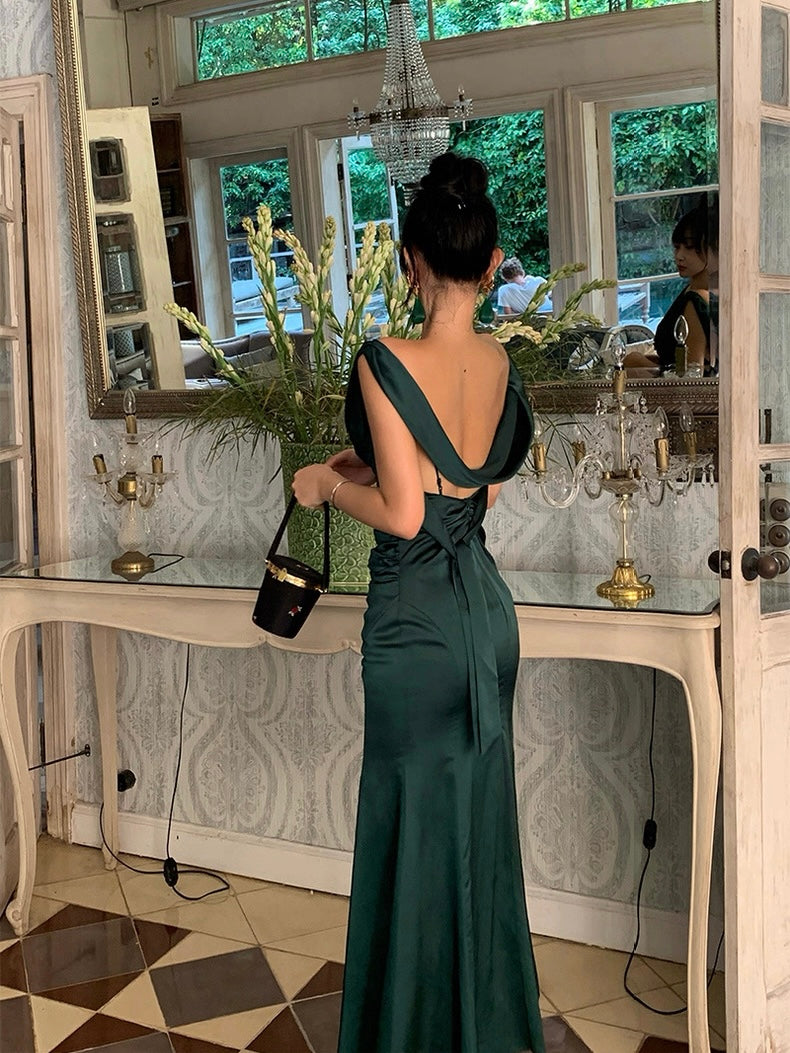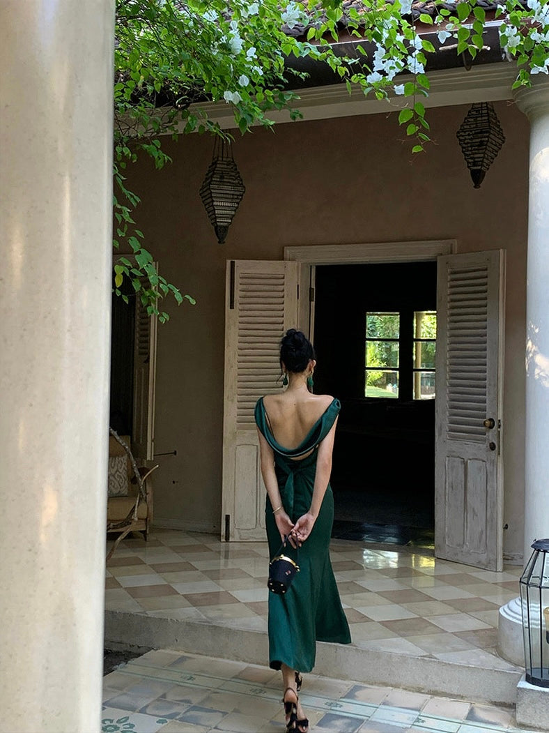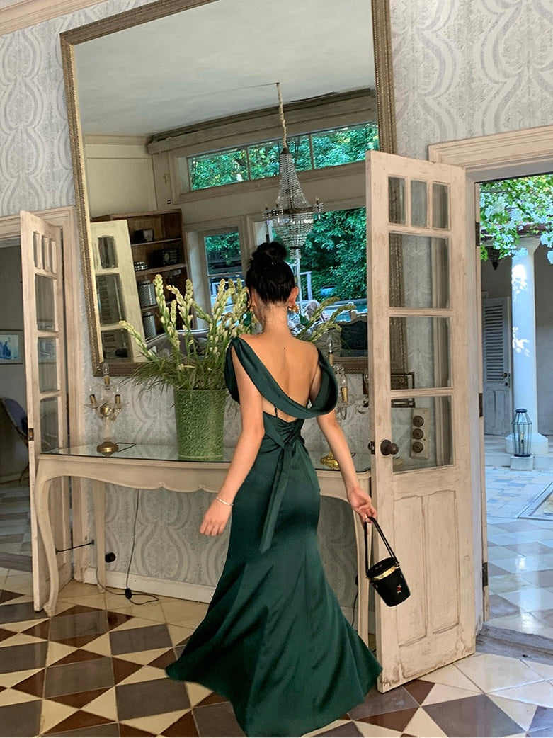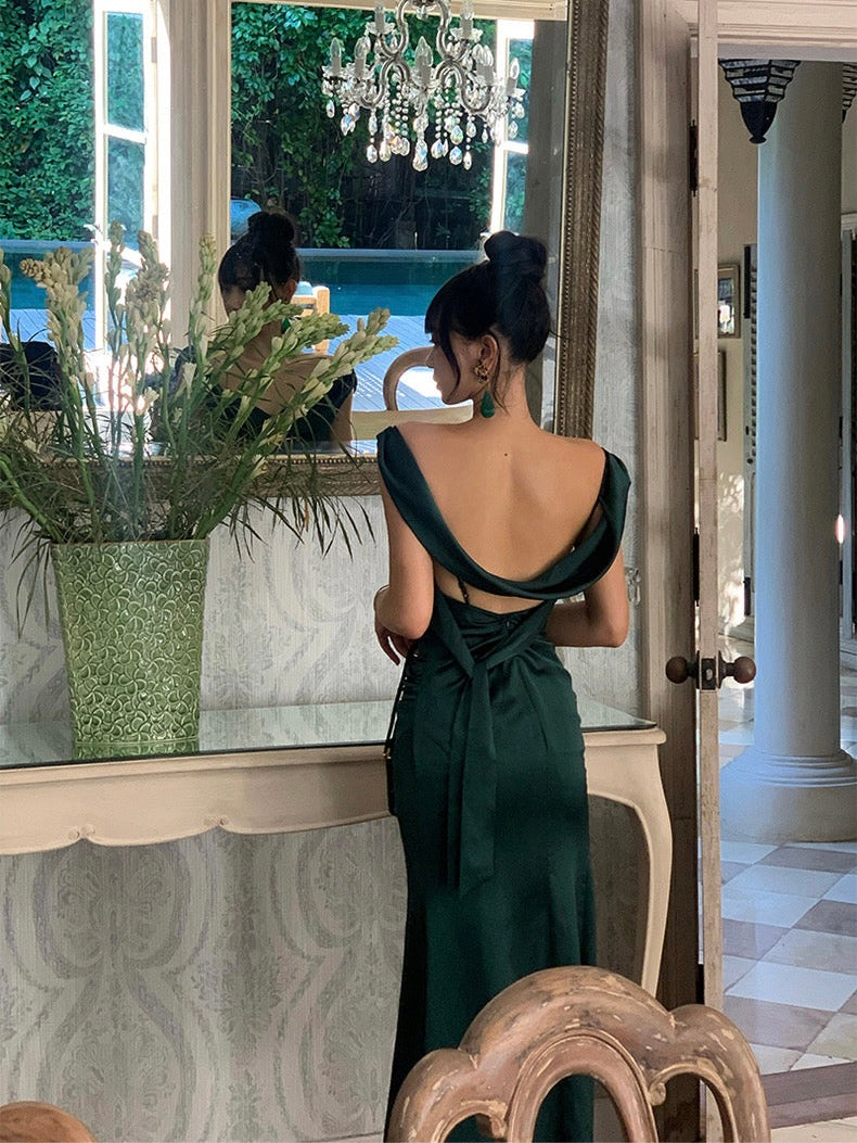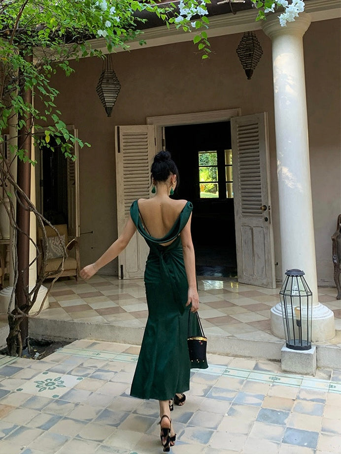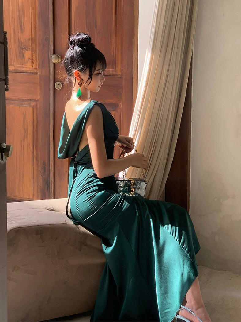 The kind of dress that turns every entrance into a movie moment. Cut in a fluid silhouette that skims and flows with every step, ‘Rusalka’ features a draped cowl neckline and shoulder straps that continue into a delicate back detail, showing just the right hint of shoulder and spine.