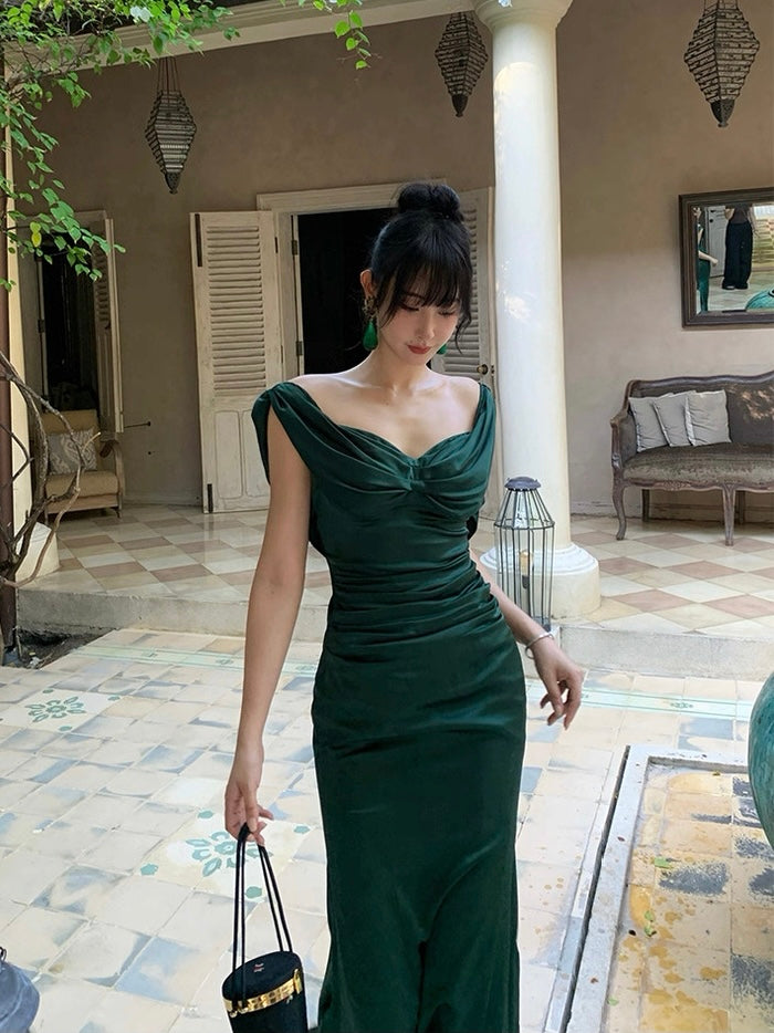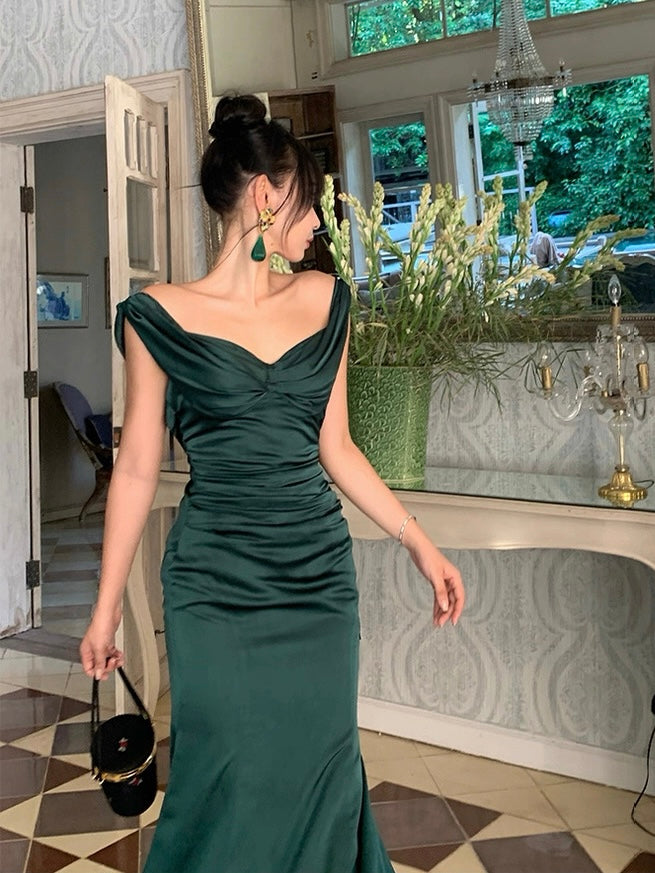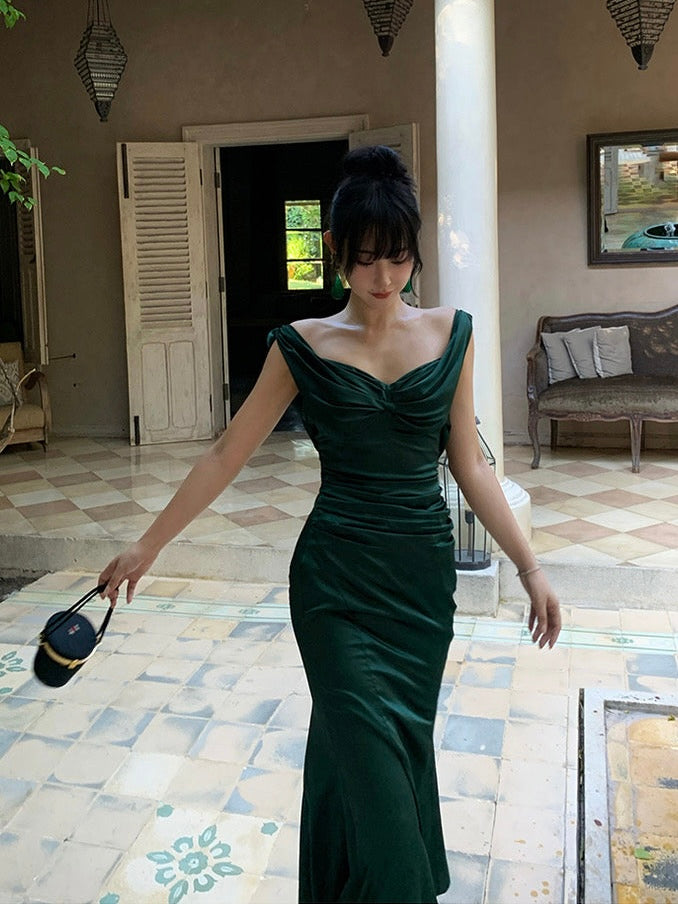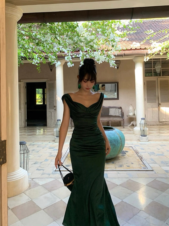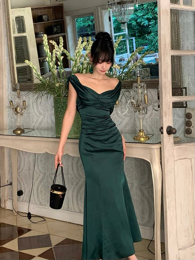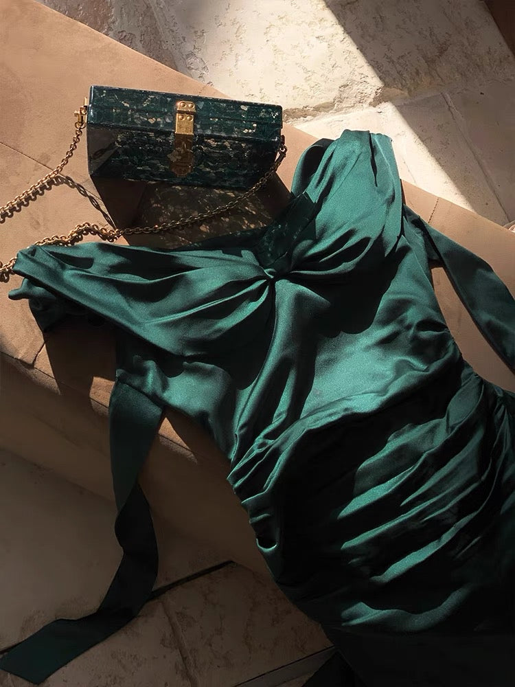 The gathered waist flatters the figure while softly concealing, and the sleek, body hugging skirt opens into a subtle fishtail hem for that signature sweep. Crafted from rich acetate with a smooth, liquid like drape, the fabric holds its shape while feeling weightless and silky on the skin.