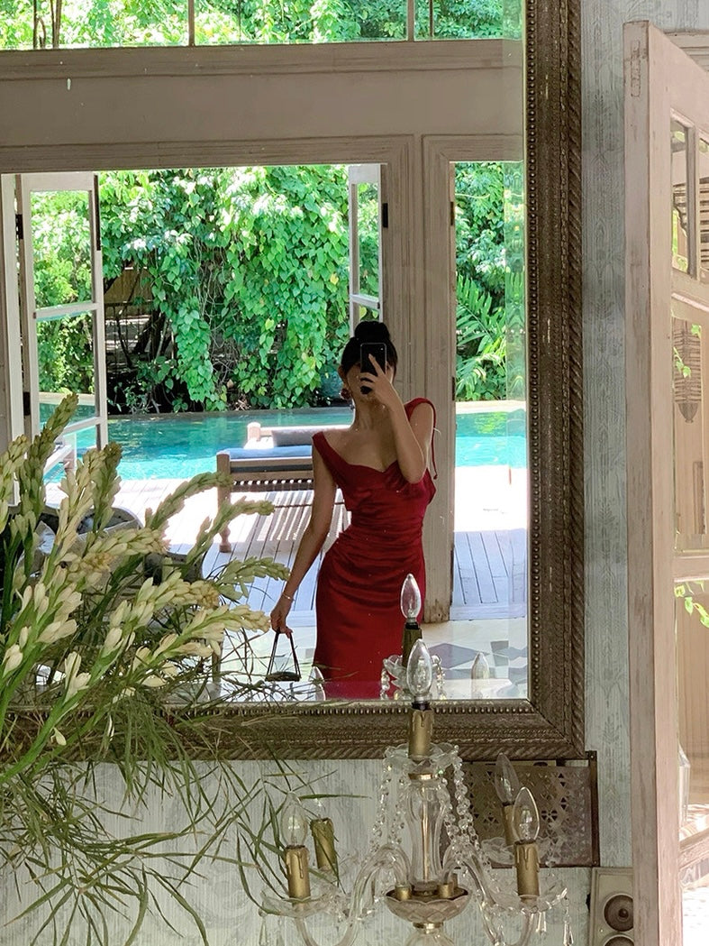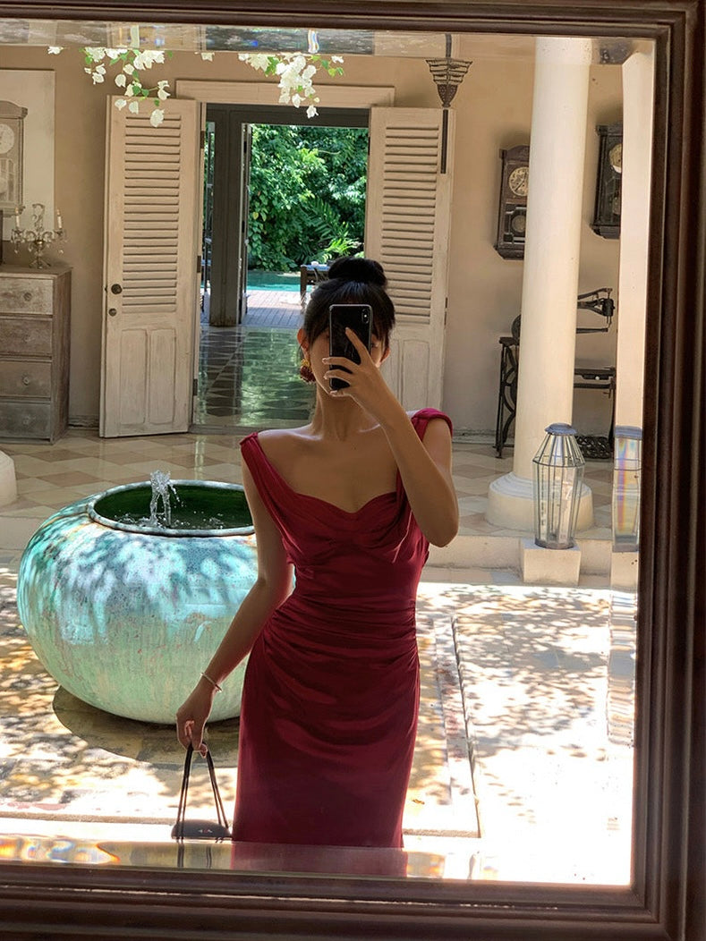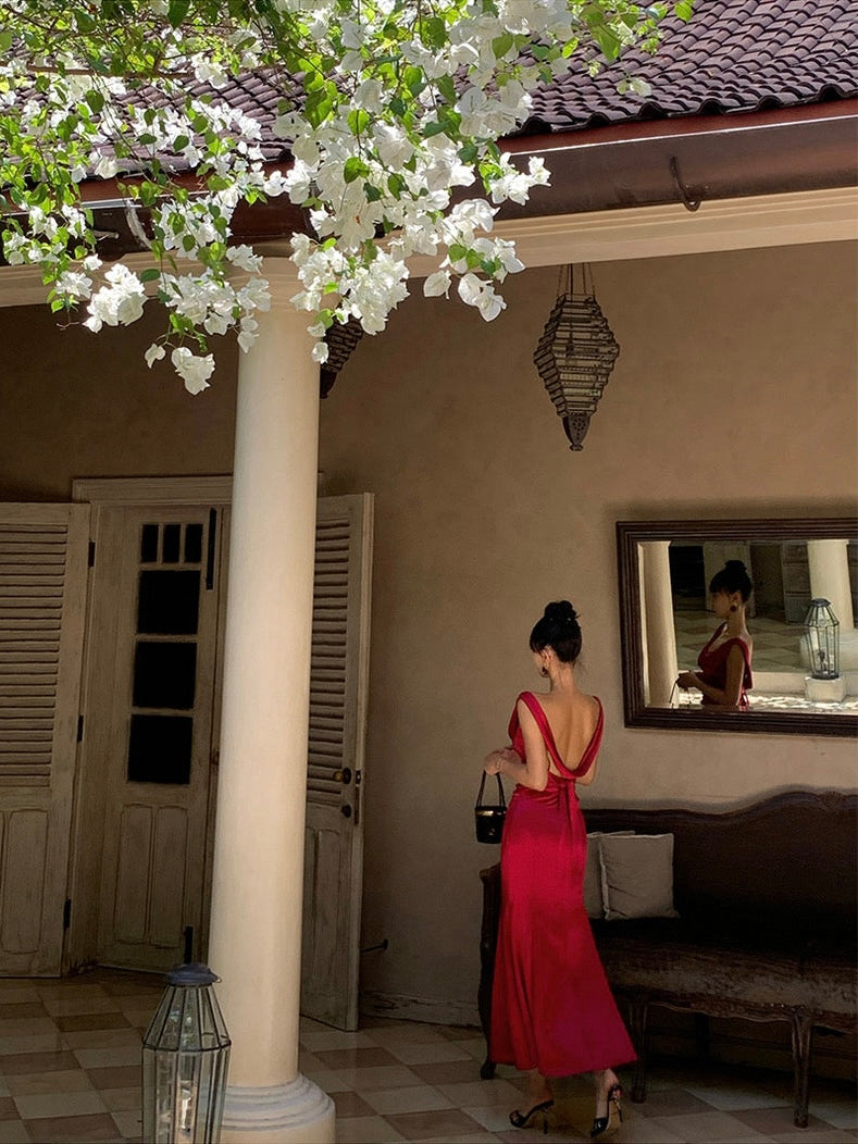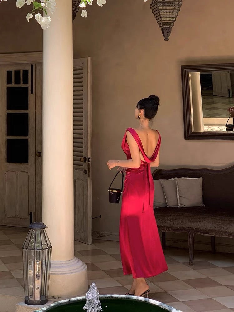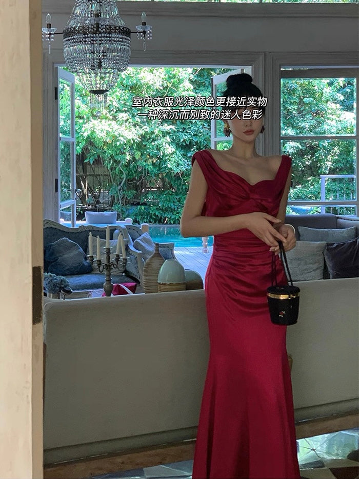 The gathered waist flatters the figure while softly concealing, and the sleek, body hugging skirt opens into a subtle fishtail hem for that signature sweep. Crafted from rich acetate with a smooth, liquid like drape, the fabric holds its shape while feeling weightless and silky on the skin.