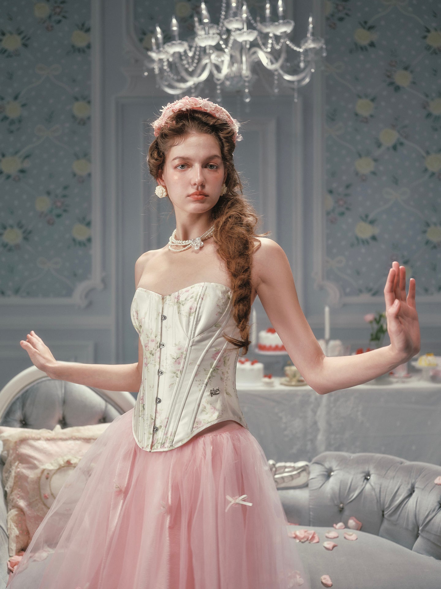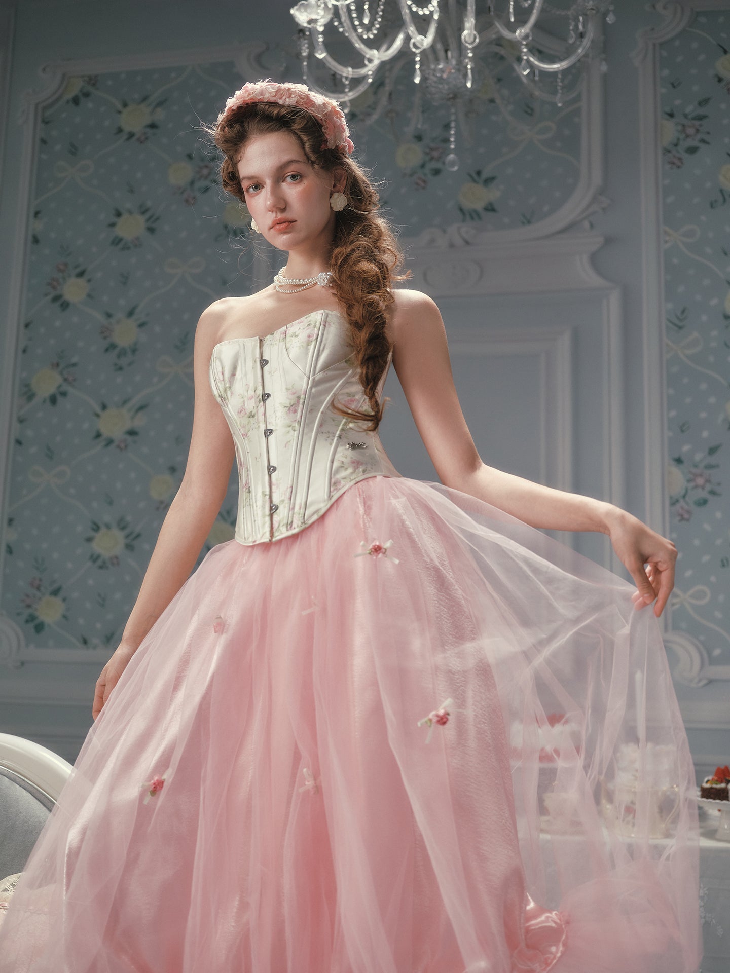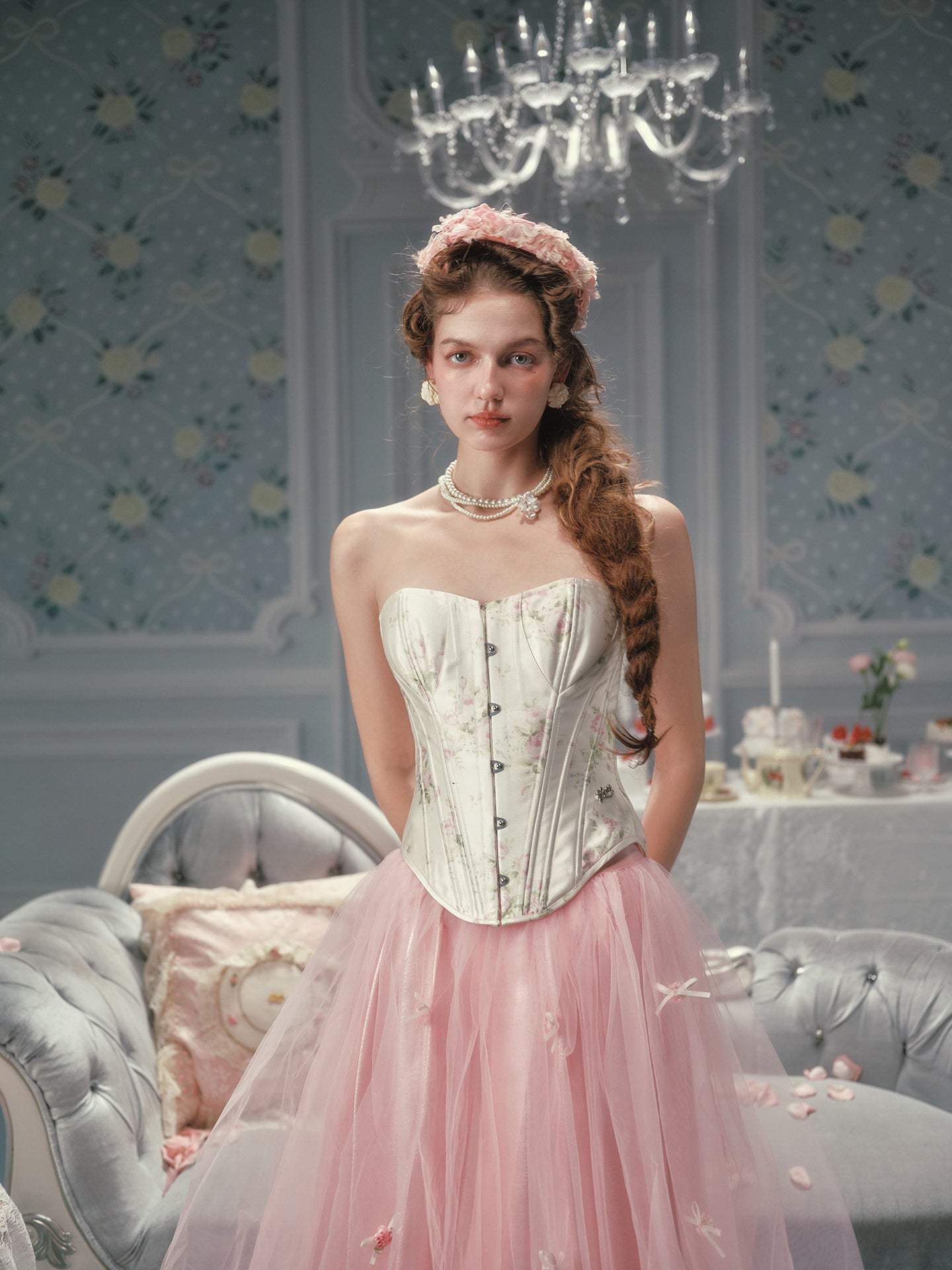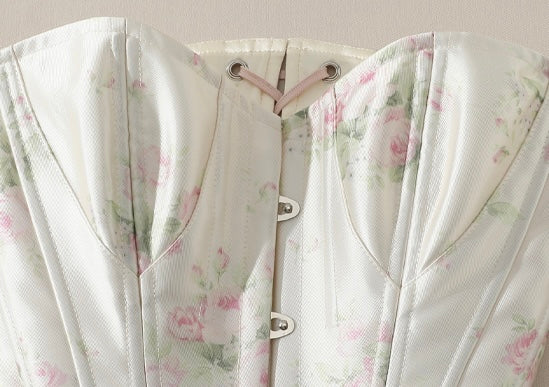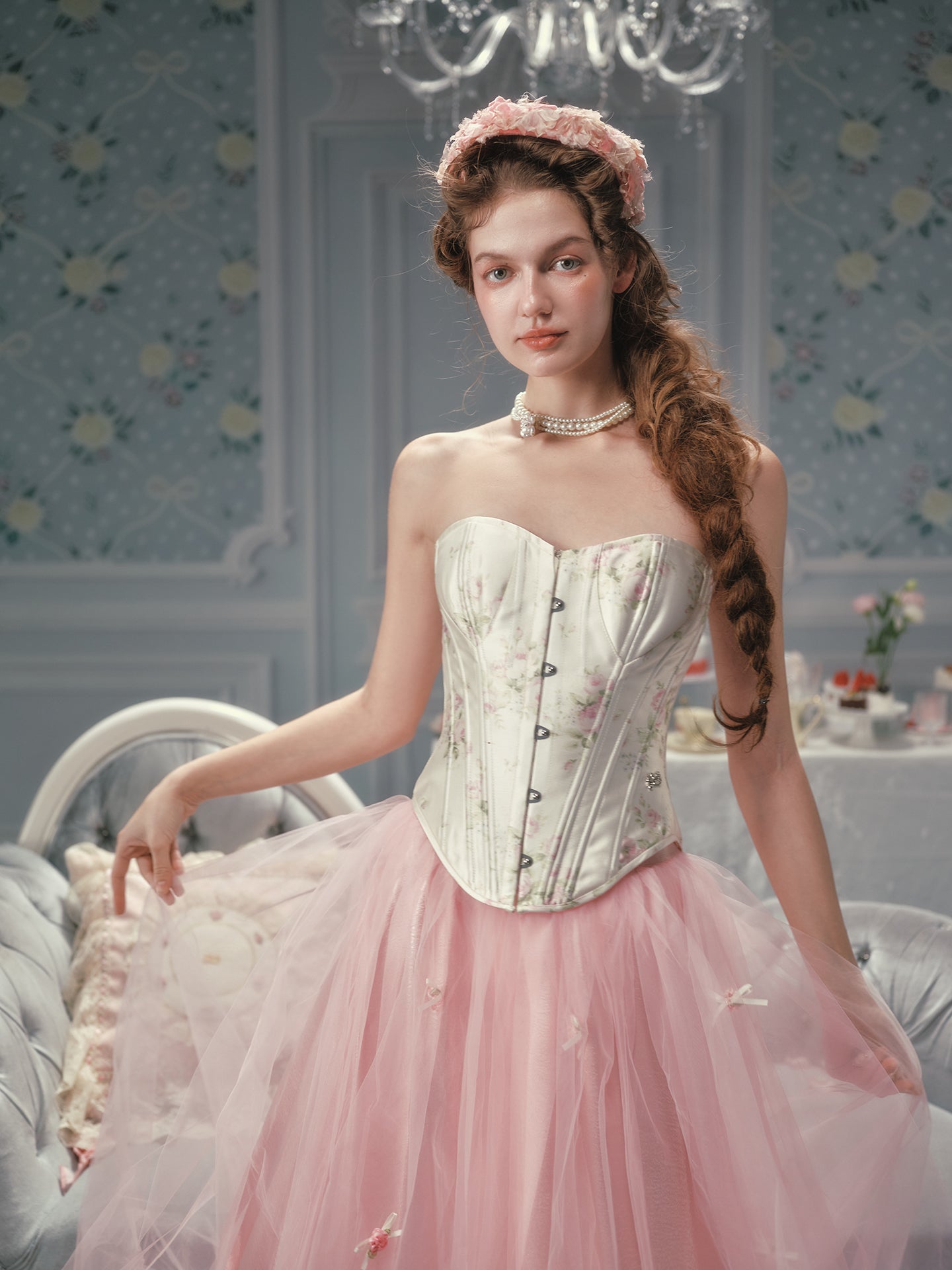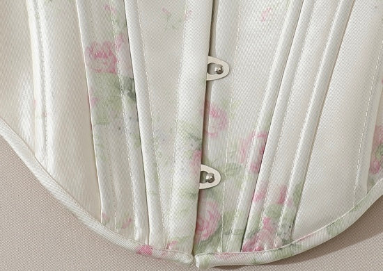 We printed soft water-rose blooms across a pearlescent jacquard, then framed the sweetheart bust with precise cup seams and 16 sculpting bones, so ‘Amour Epistle’ lifts, cinches, and keeps its curve-hugging promise from brunch to ballroom.