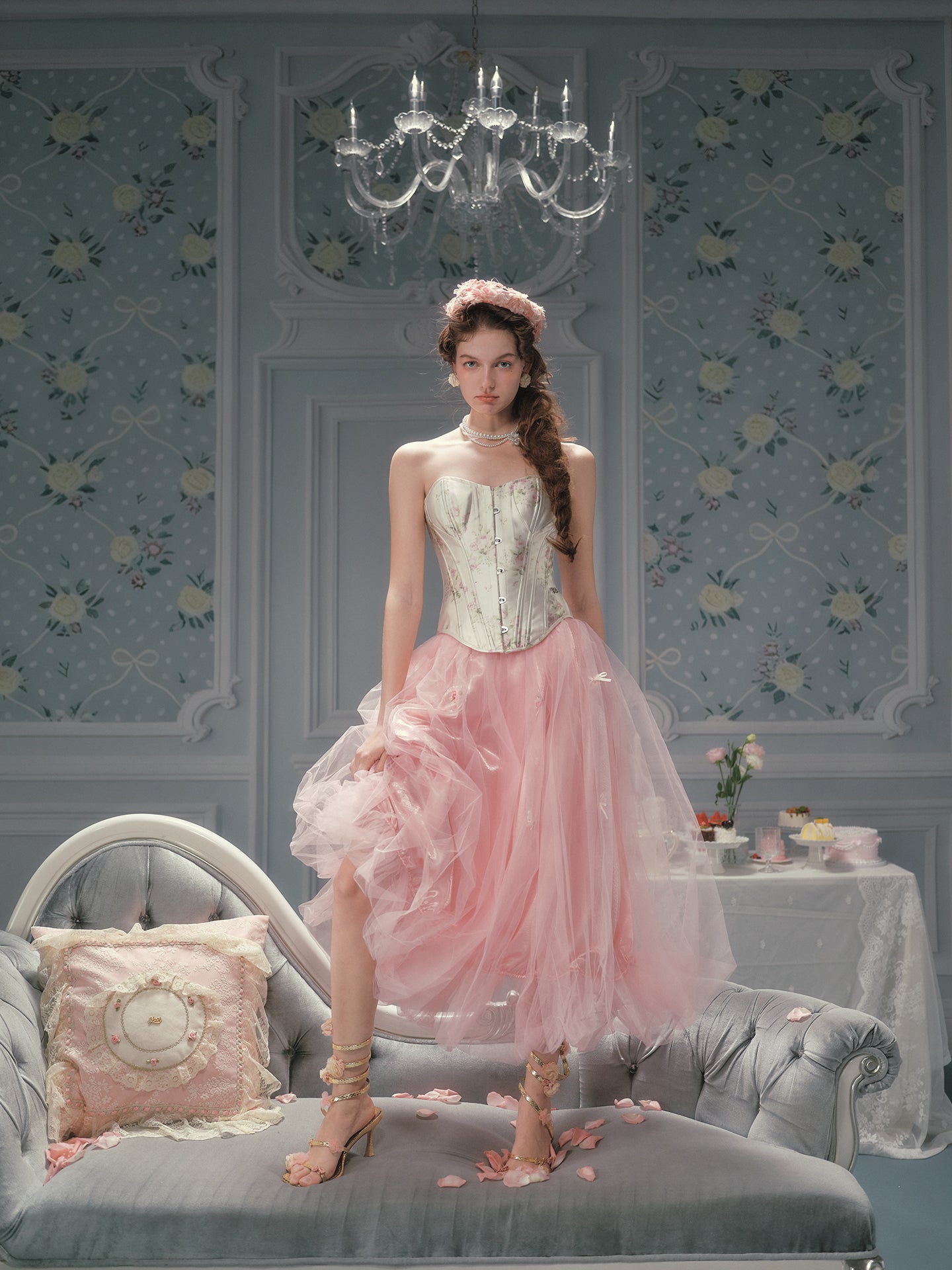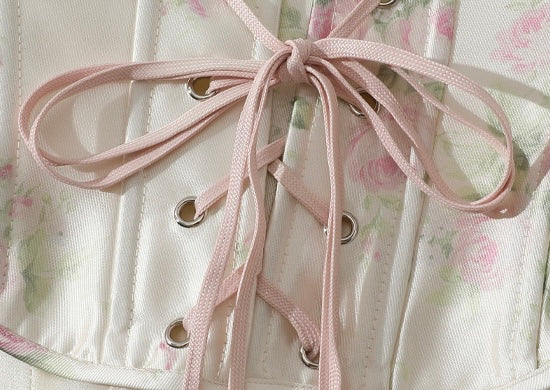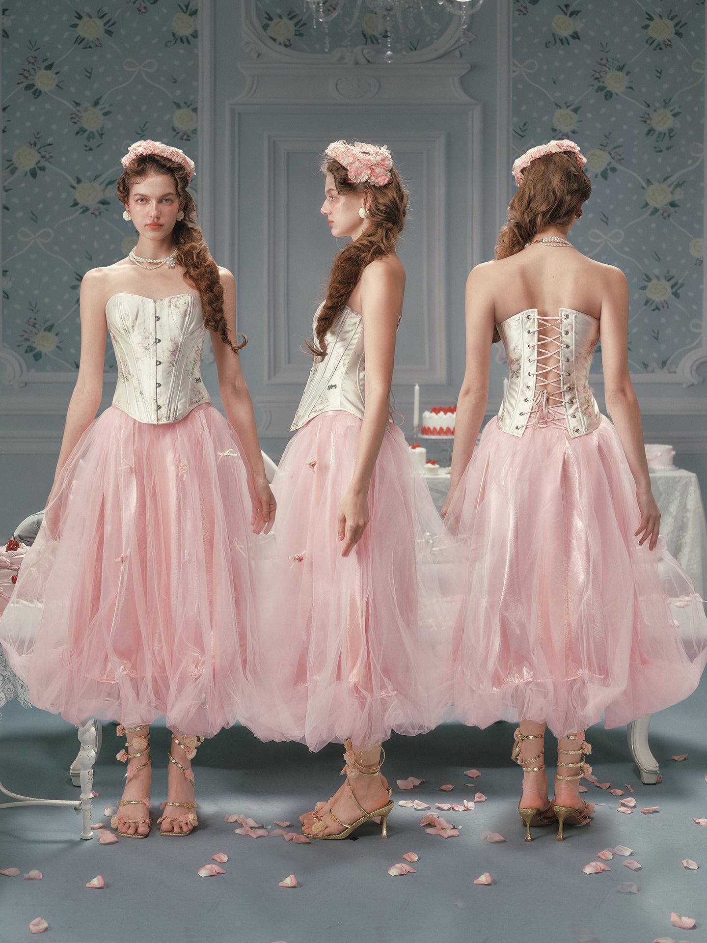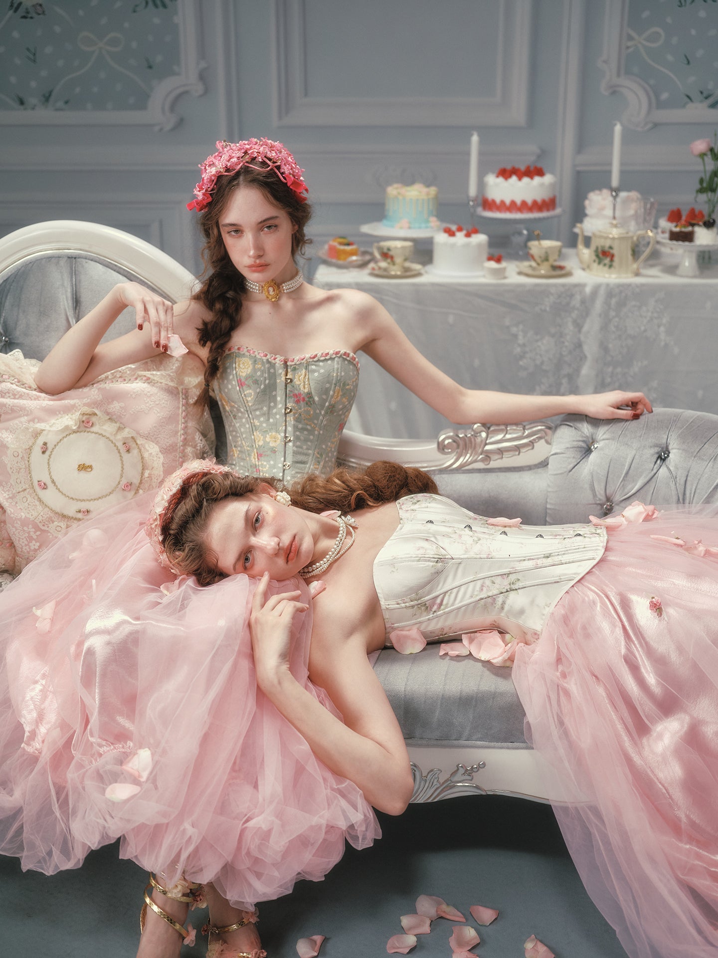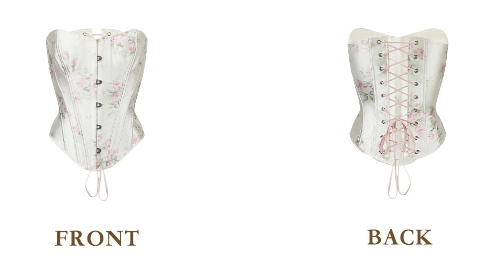 We printed soft water-rose blooms across a pearlescent jacquard, then framed the sweetheart bust with precise cup seams and 16 sculpting bones, so ‘Amour Epistle’ lifts, cinches, and keeps its curve-hugging promise from brunch to ballroom.