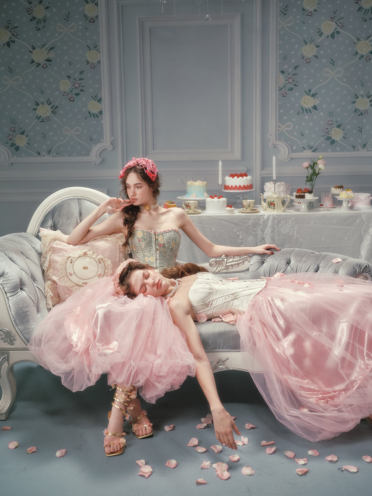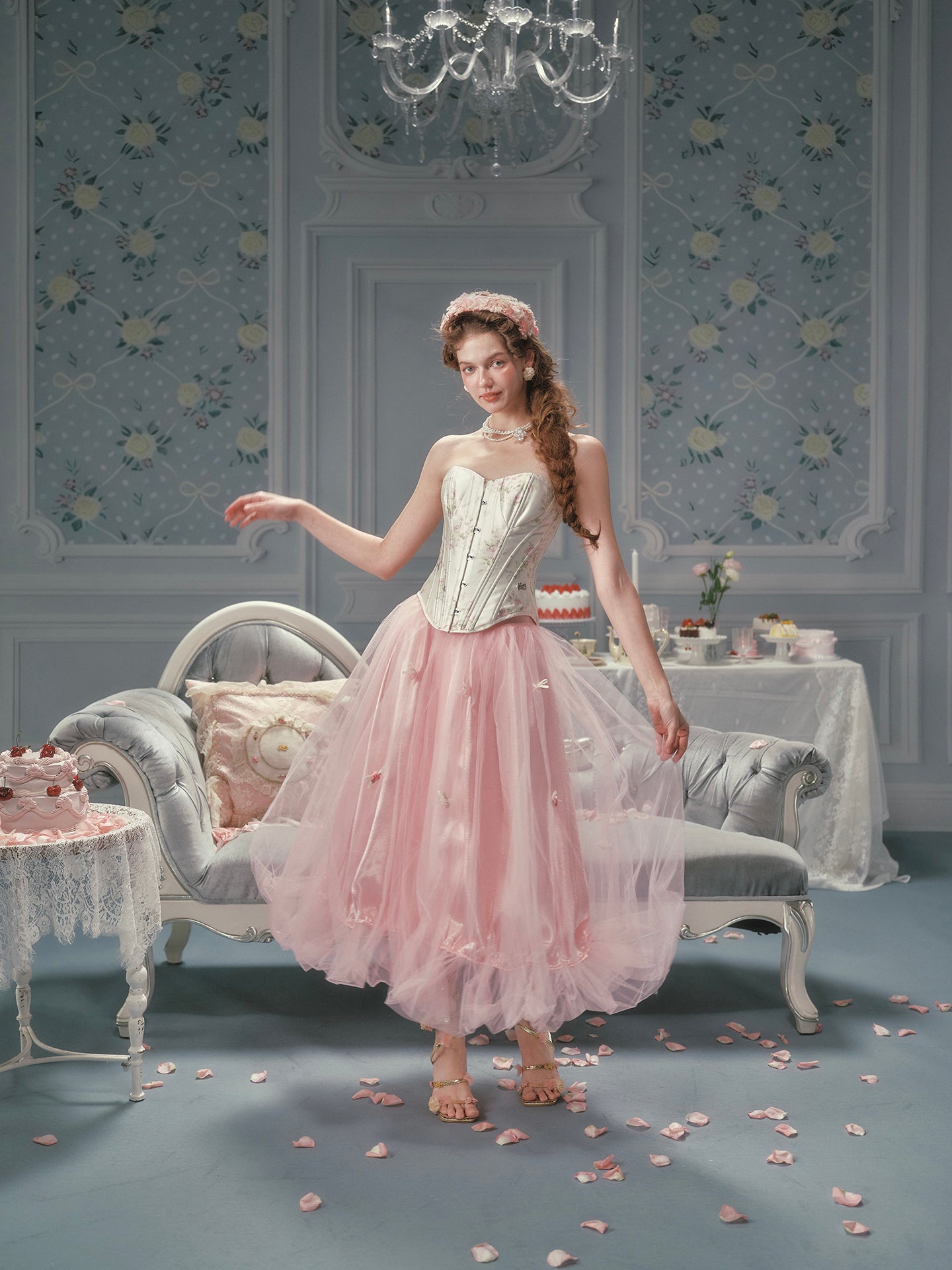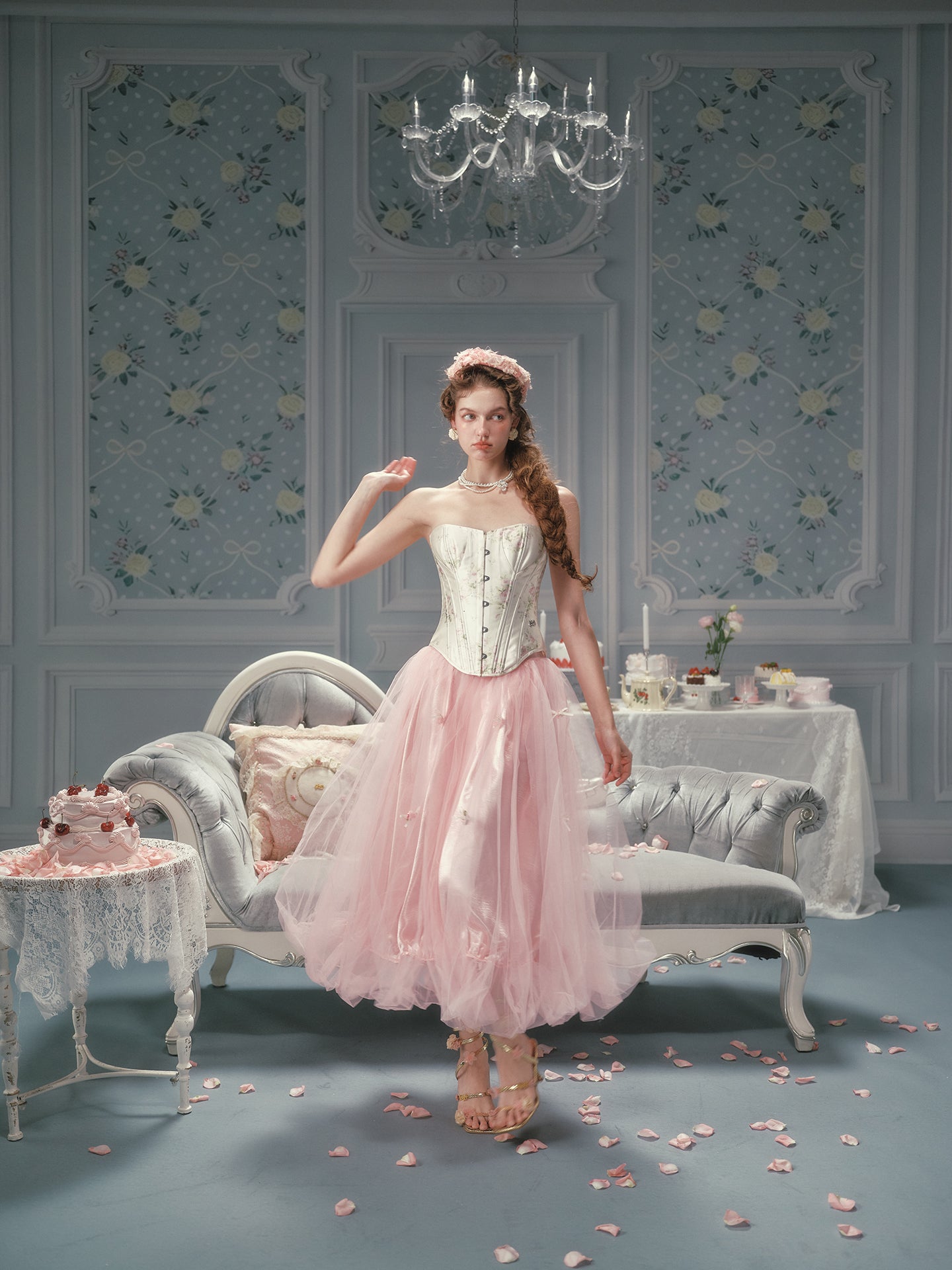 Front busk clasps make dressing effortless, while the blush-pink lace-up back lets you edit the fit – need a whisper more room after dessert? A quick tug does the trick.