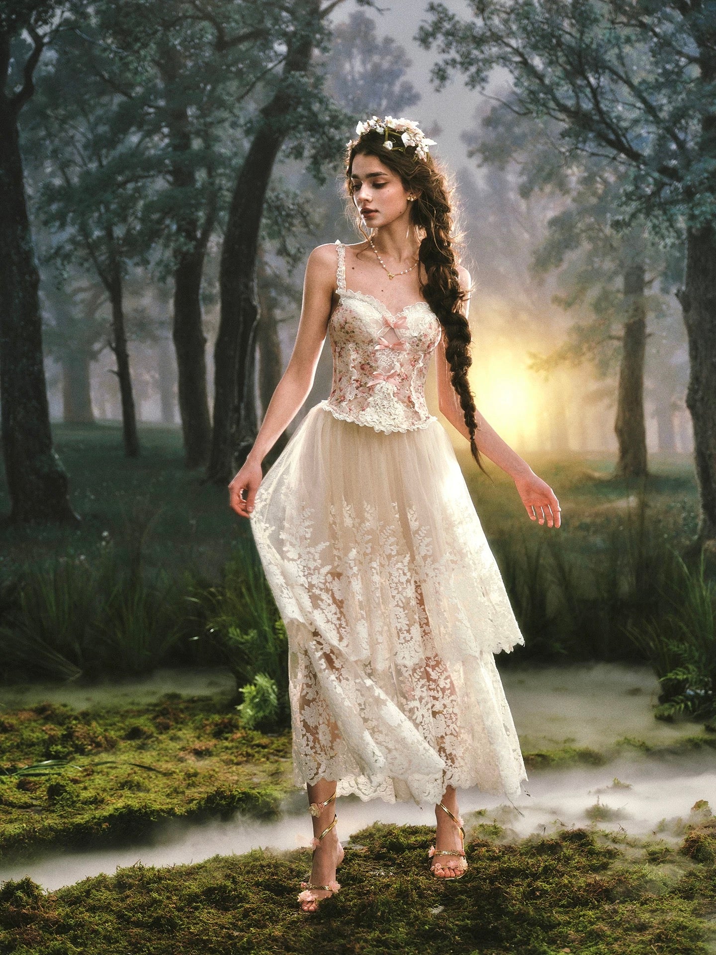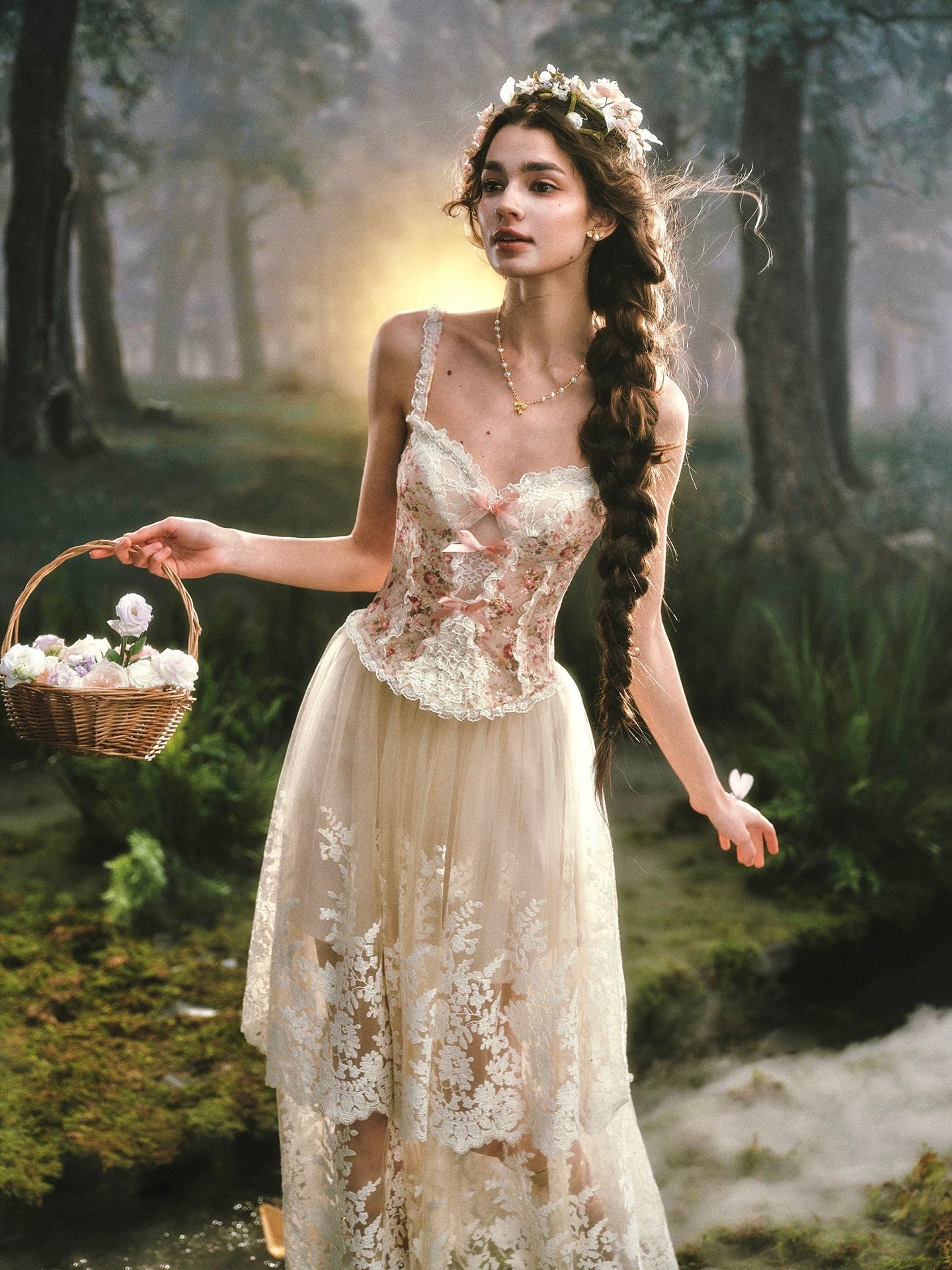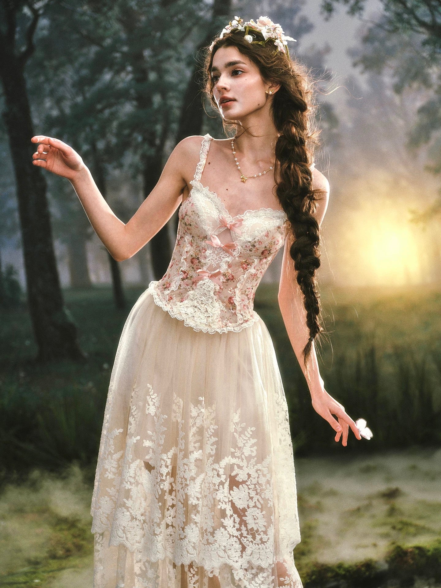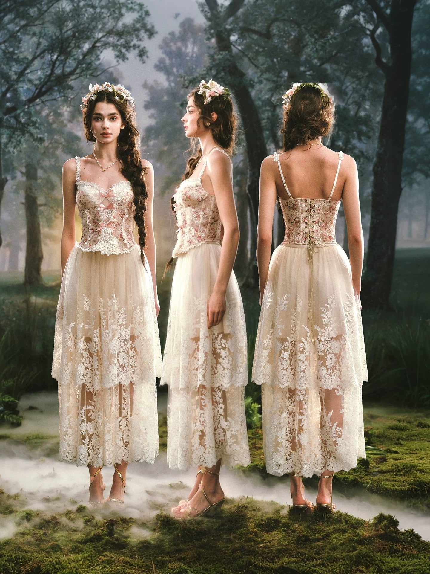 We gathered layer upon layer of ivory lace down the front, creating delicate ripples that sculpt the waist and showcase the couture level handiwork we adore. Overlaid floral mesh brings a whisper of faded-rose romance, while each seam is framed with tiny scalloped trim for that extra flourish of femininity.