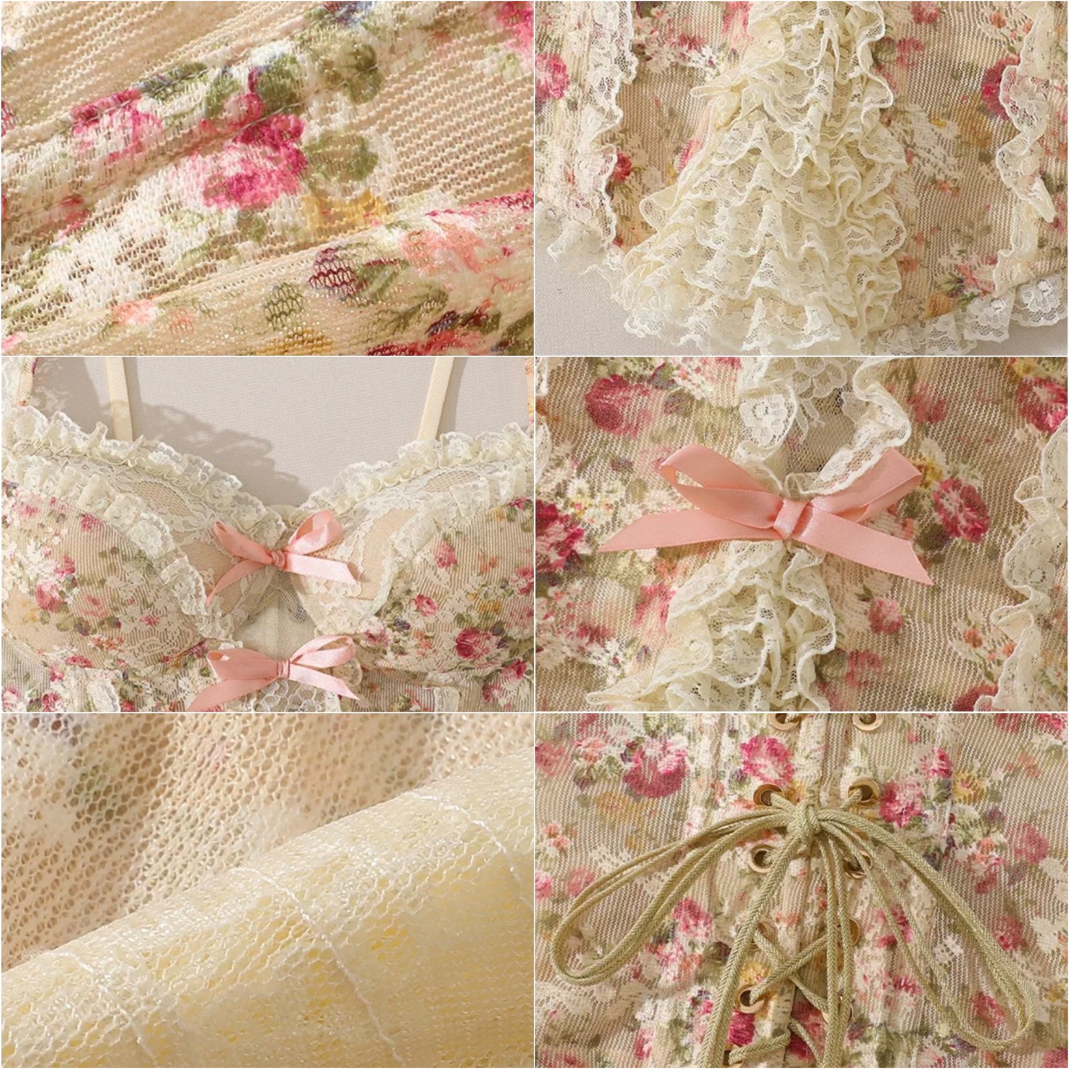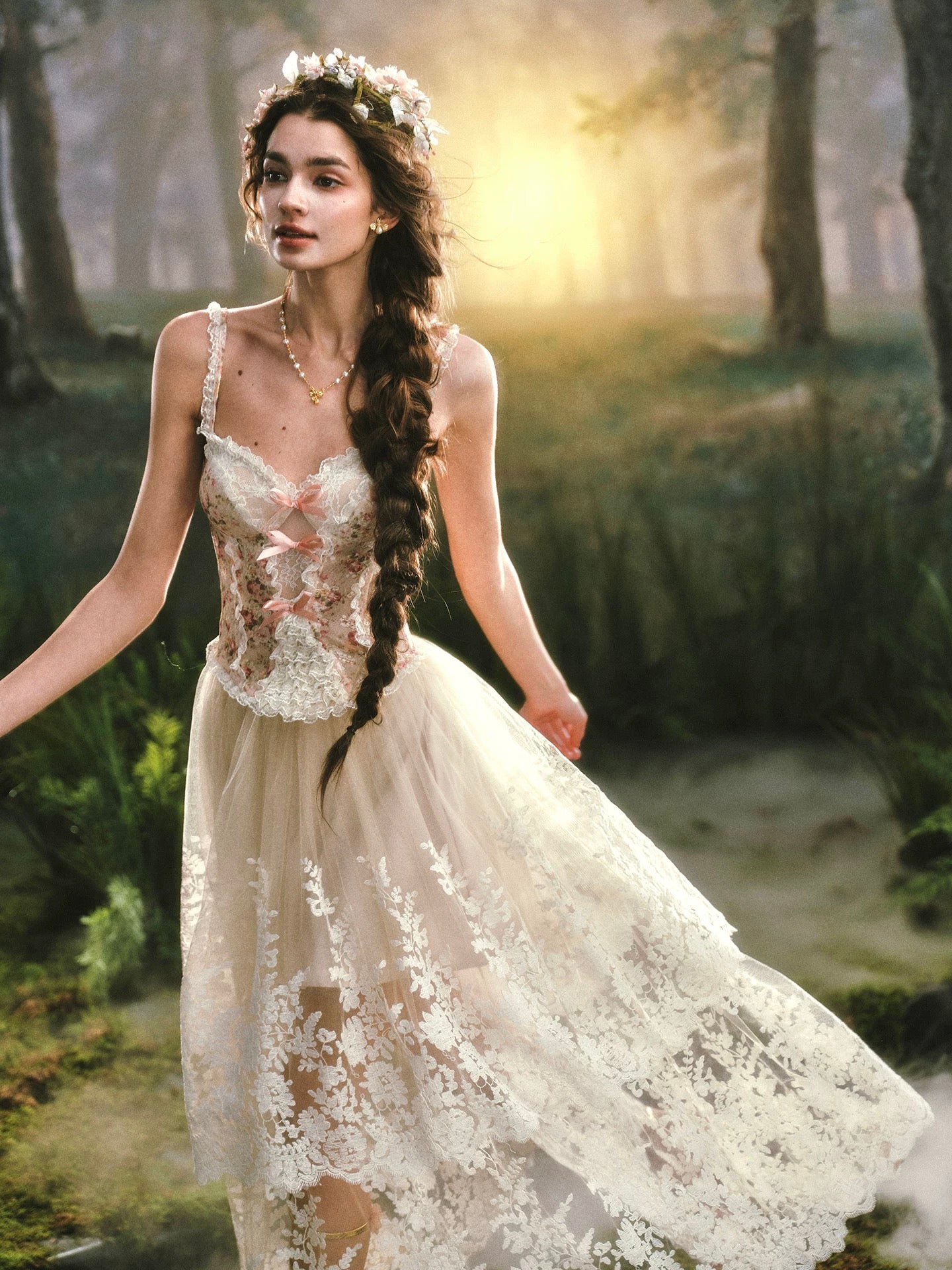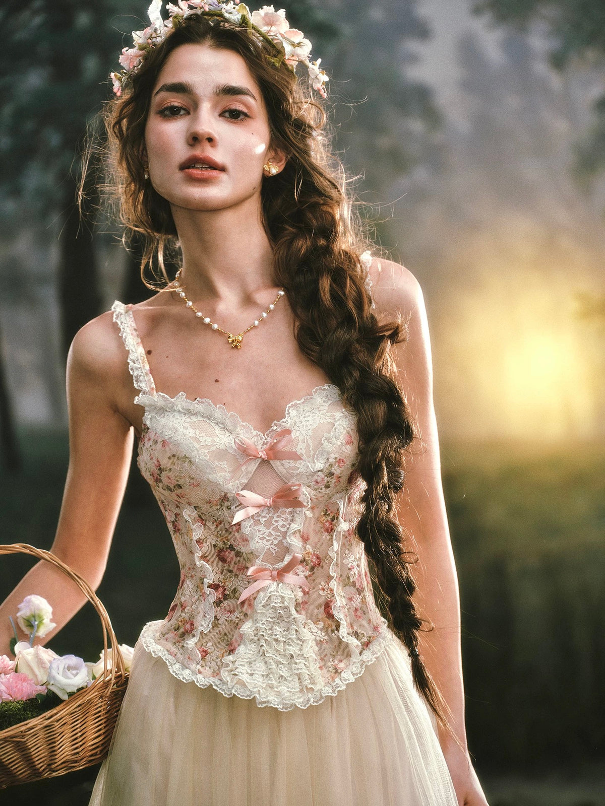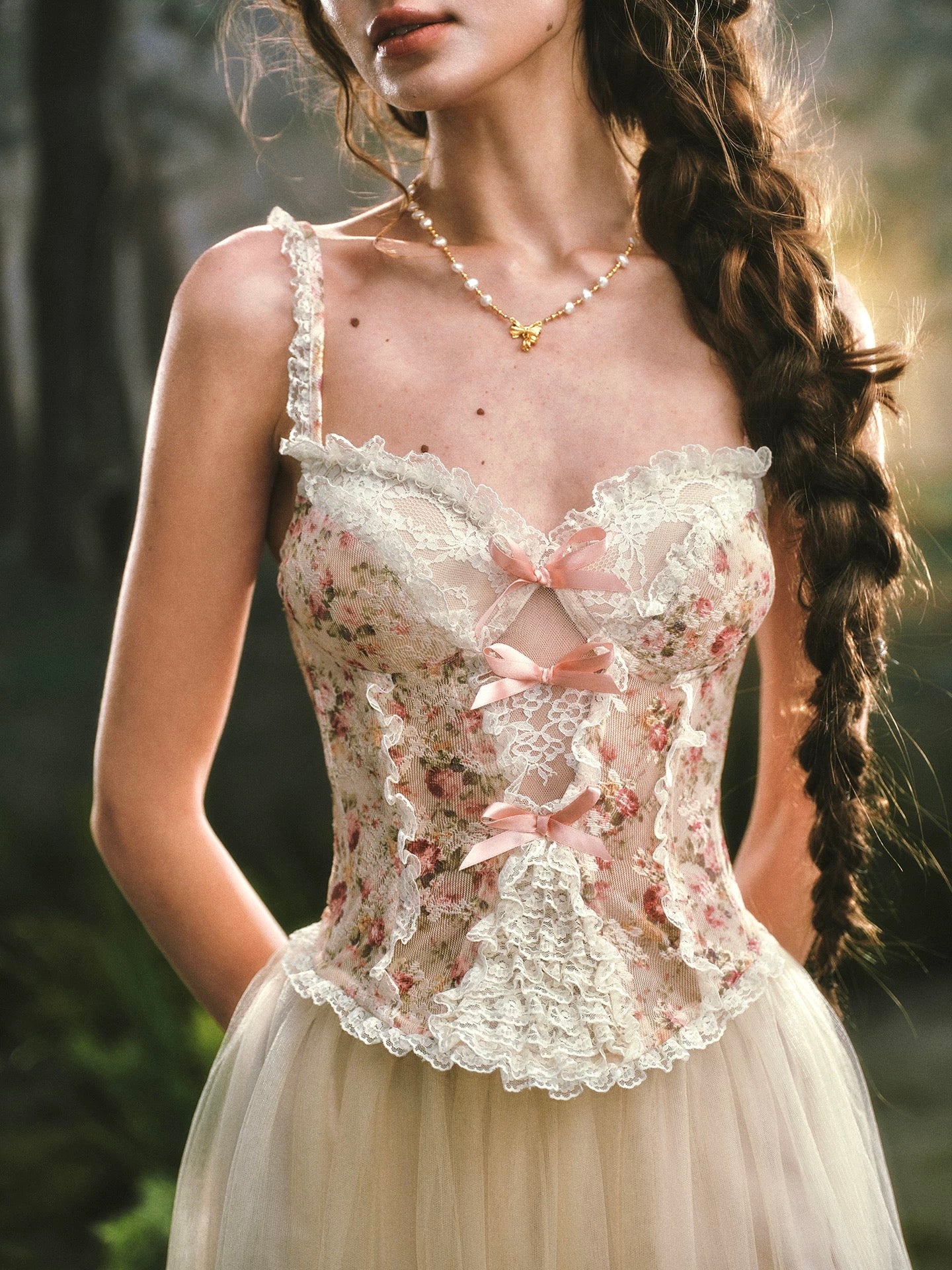 We gathered layer upon layer of ivory lace down the front, creating delicate ripples that sculpt the waist and showcase the couture level handiwork we adore. Overlaid floral mesh brings a whisper of faded-rose romance, while each seam is framed with tiny scalloped trim for that extra flourish of femininity.