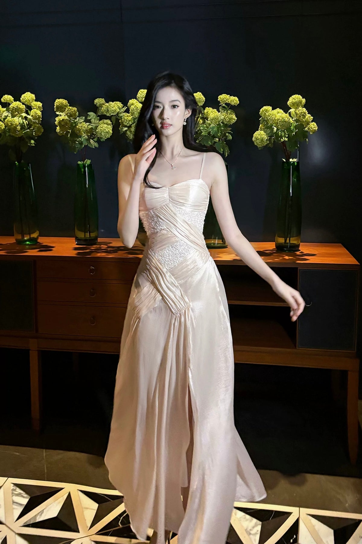 You’ll love the adjustable straps, hidden side zip for ease, and that high front slit with a gentle wave hem—equal parts elegant and subtly flirty. Turn around and there’s even more to love: cascading chiffon pleats cross gently at the back for a graceful finish.