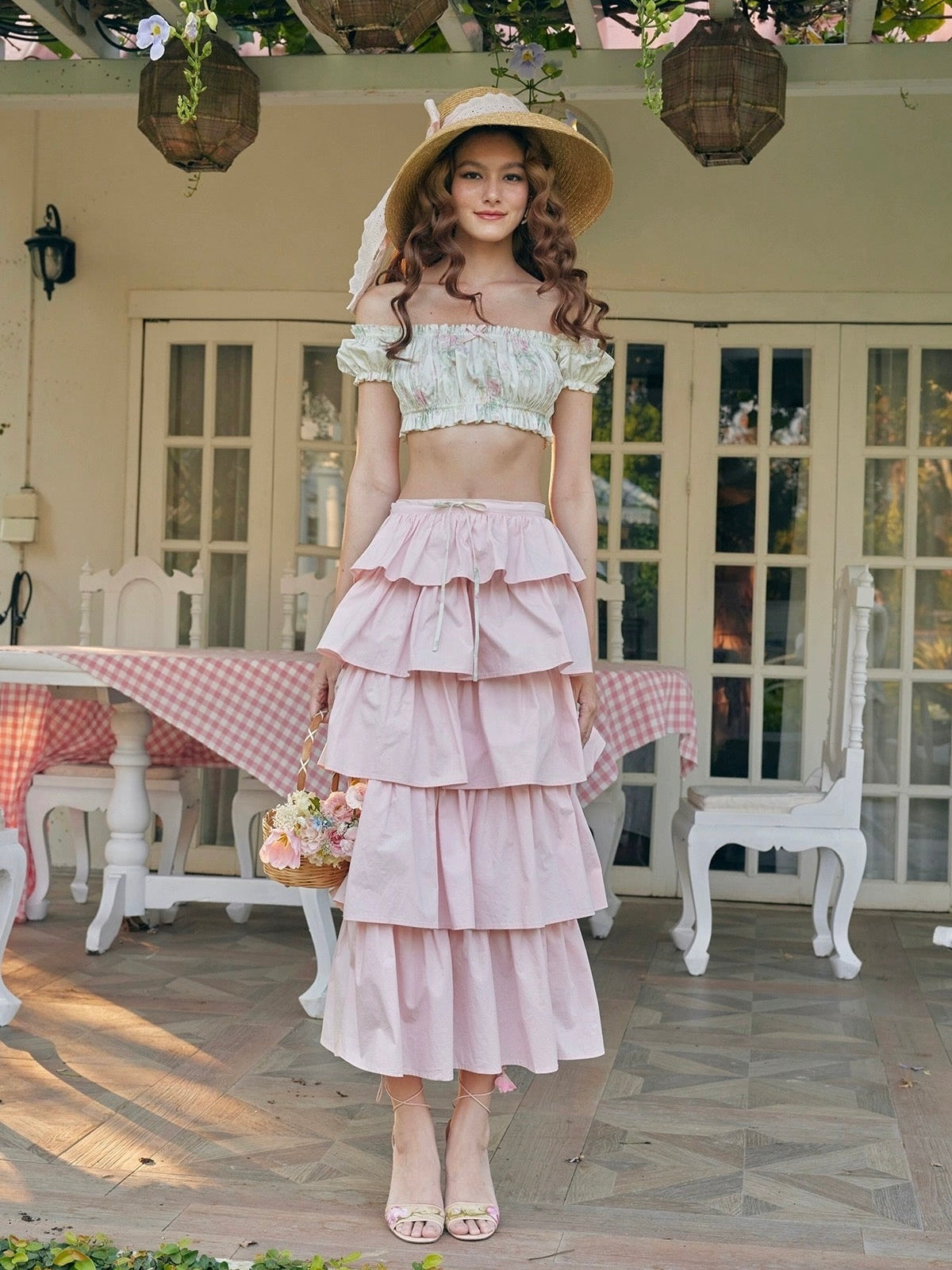 Now, onto the tiered skirt—this beauty is designed to flatter and elongate your figure. The flowy layers create a stunning silhouette that makes you look taller and more streamlined, while the soft ruffles add depth and movement. At the waist, you’ll find a lovely printed drawstring that allows you to adjust for the perfect fit, ensuring comfort is always in style.