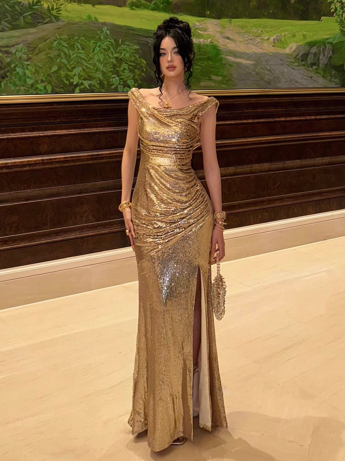 We present the stunning ‘Gold Dynasty‘ – a long, luxurious gown adorned with delicate shimmering sequins that dance across its surface, capturing the light with every movement. The elegant plunging neckline and deep V-back beautifully accentuate the curves of your neck and shoulders, exuding a captivating allure. With charming ruching at the waist and a dramatic slit along the hem, the Gold Dynasty enhances and celebrates every curve, creating a flattering silhouette that embodies bold femininity.