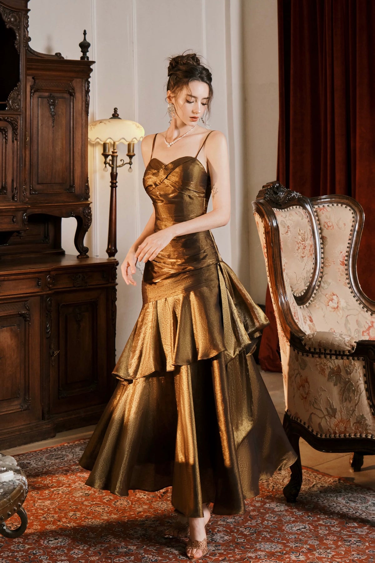 We love how the crossover bodice (with built-in padding, of course) highlights the neckline and shoulders so elegantly. Crafted in a luxe, light-catching fabric with a dreamy bronze hue that shifts and glows under sunlight, have you ever seen something so softly glamorous?