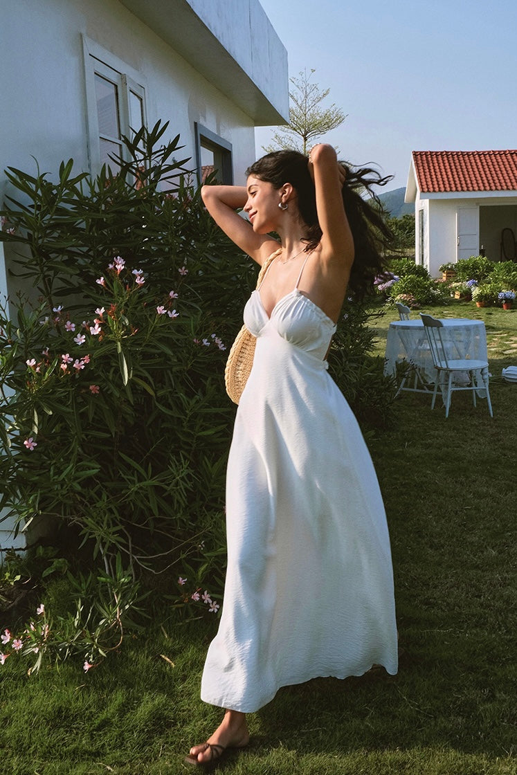 Delicate back ties cross at the shoulders while a subtle drawstring at the waist lets you play with shape, adding volume where you want it and curve where you need it. The gentle flare hugs just right and falls to the ankle with that easy, effortless drape.