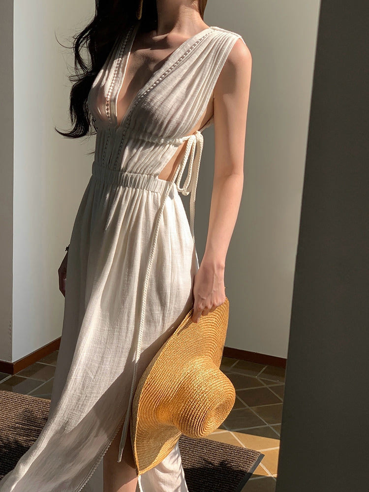 The H-line silhouette is relaxed yet flattering, with an elegant deep V neckline trimmed in cotton lace that echoes the delicate detailing at the side seams and hem.