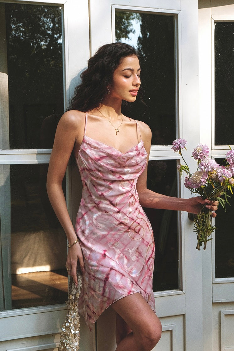 It all began with a custom-dyed jacquard fabric, designed exclusively in-house, where every petal, curve, and diamond weave was carefully calibrated for just the right balance of softness and shape. The draped neckline curves gently like peach blossom petals, with subtle gathers that flatter the bust and skim beautifully along the body.