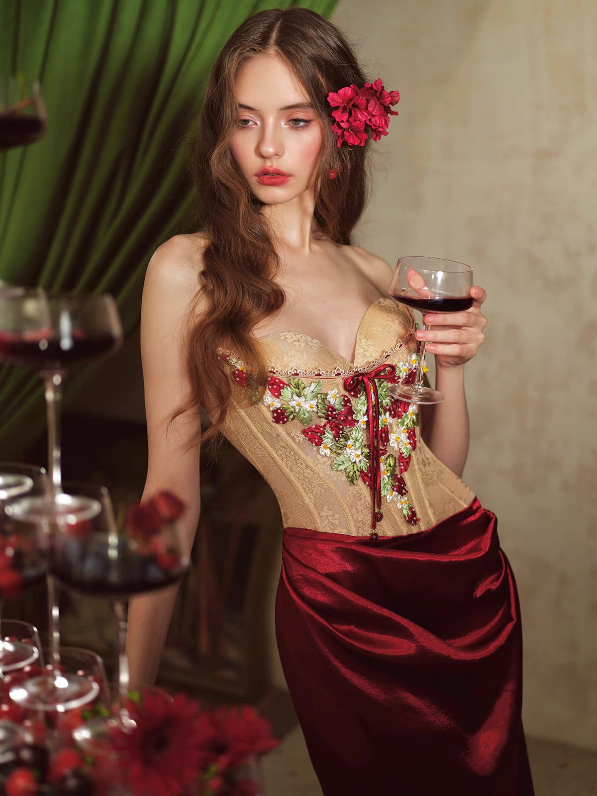 We’ve added metal fishbone detailing for support and stability, ensuring everything stays in place while you shine. Delicate handmade satin ribbons and embroidery catch the eye, while the playful butterfly tie at the front adds a whimsical touch. The adorable metal strawberry charm brings an extra dash of fun—perfect for those who love unique details!