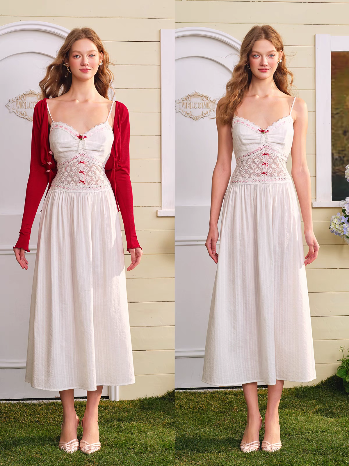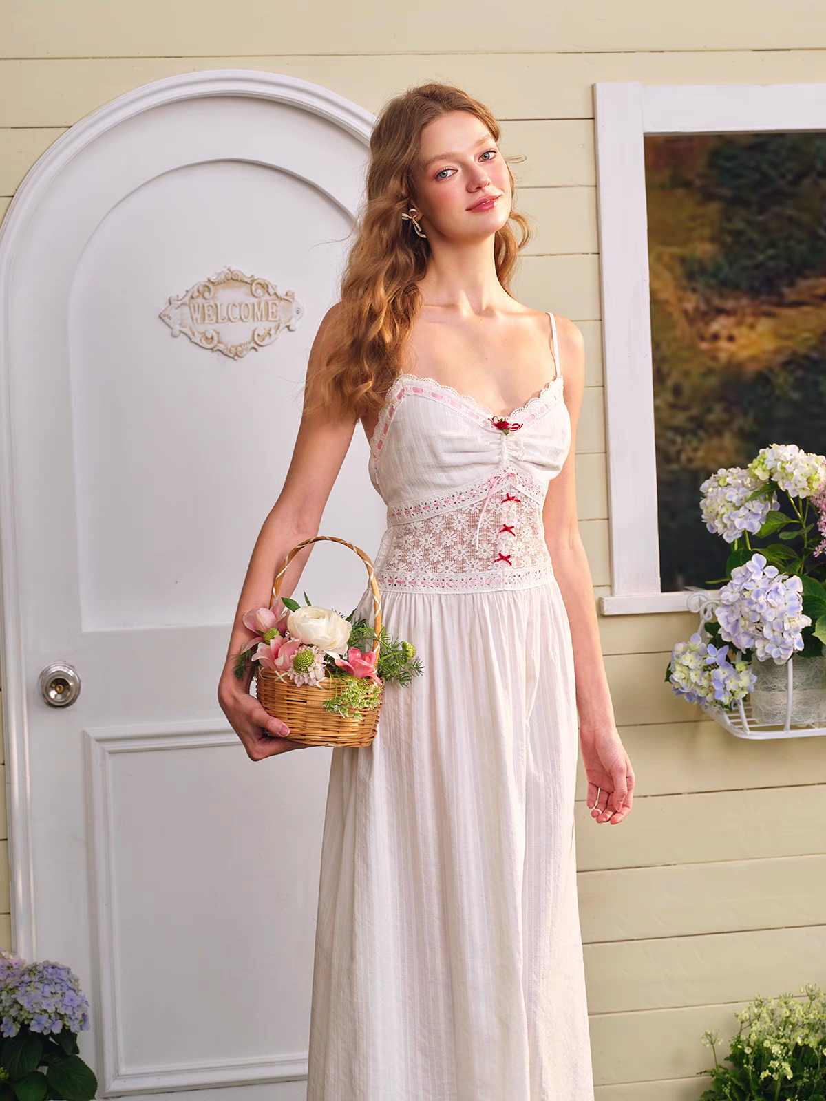 The Briana dress embodies sweet simplicity and French charm, perfect for summer vacations and sunny days. This long white dress features delicate spaghetti straps and a flattering fit-and-flare silhouette that accentuates the waist. Crafted from soft, breathable cotton fabric, the dress is designed with a lovely lace panel adorned with intricate floral details, adding a touch of elegance.