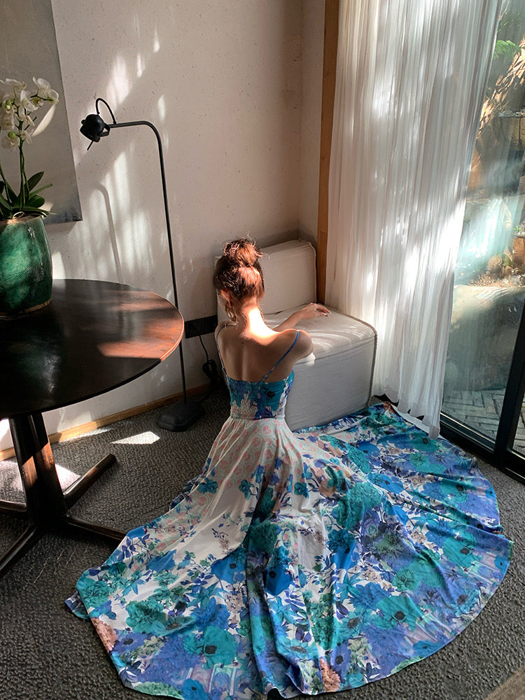 The dress features a waist-cinching A-line silhouette, with a high-waisted, arc-shaped waist section that seamlessly flows into a voluminous, pleated skirt. The design incorporates splits to increase the pleats, allowing for natural movement and creating soft waves that dance like butterflies in the breeze.