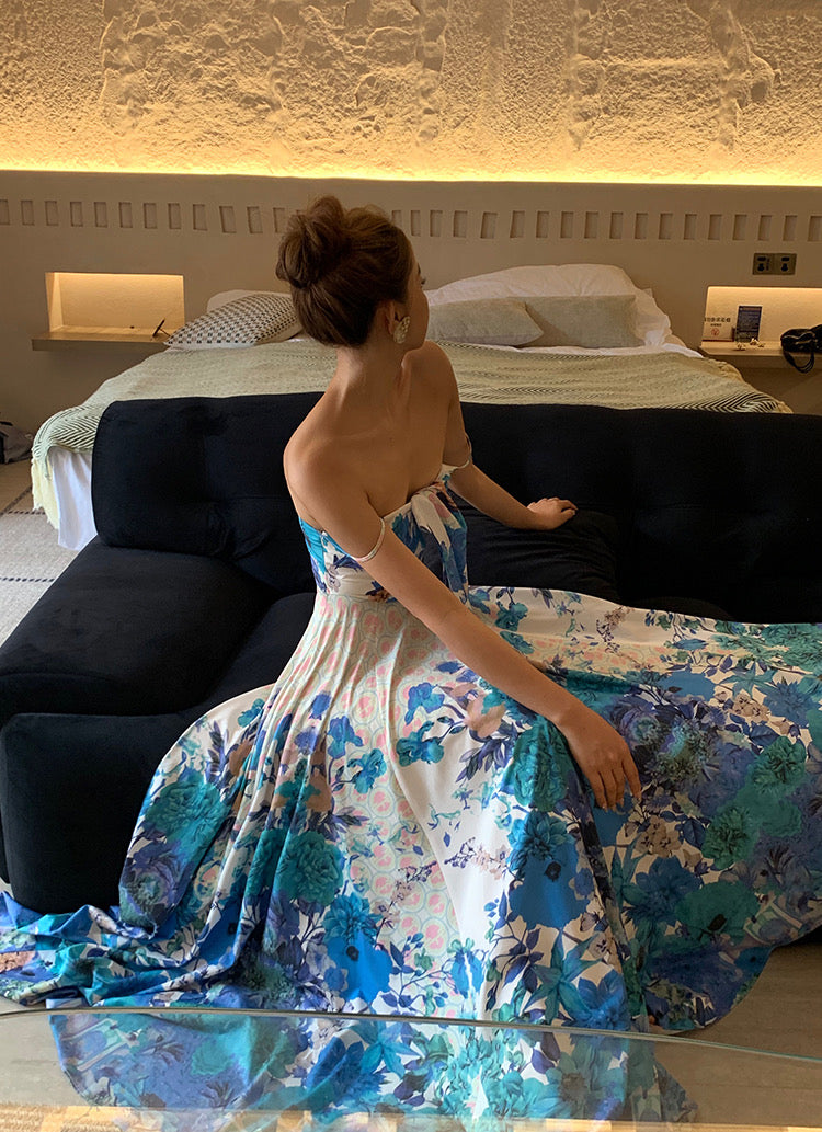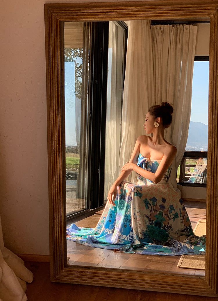 This exquisite dress is crafted with 6.4 meters of carefully positioned fabric, ensuring the pattern is presented in its full, beautiful detail without compromise. The gently curved neckline delicately highlights the swan-like neck and clavicle, complemented by a graceful bow design at the chest.