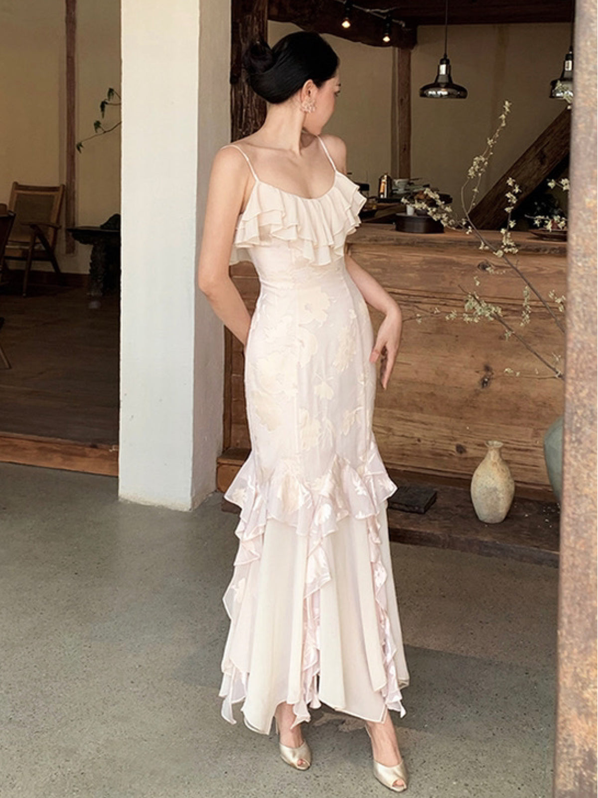 Crafted from a lightweight burnout fabric selected for its subtle shine and airy softness, the delicate Yingluo pink shade feels like morning light—fresh, romantic, and quietly refined. The flattering bodice features adjustable straps and a softly curved neckline, framed with double-layered ruffle trims that ripple with every step.