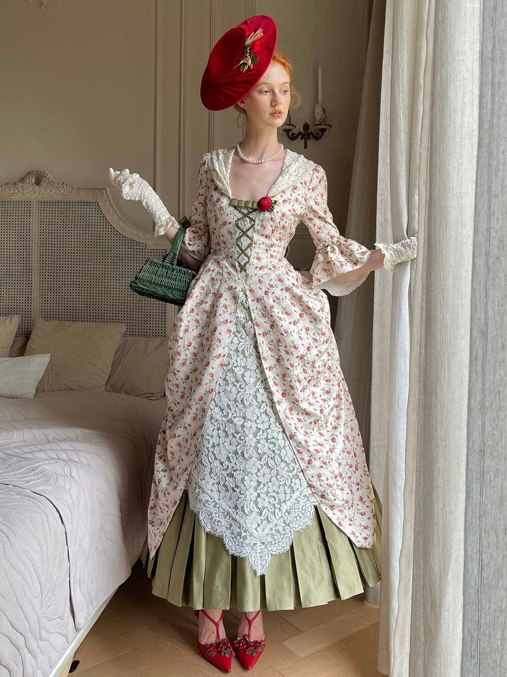 The skirt is pieced with richly textured vintage lace, and the pleated hem recalls the structure of historical Basque gowns, a nod to timeless Victorian silhouettes. Every layer, every detail, was designed to celebrate softness, femininity, and thoughtful construction.