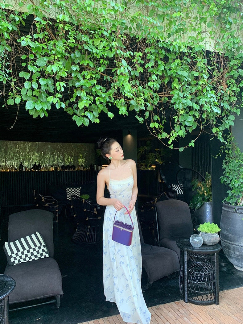 The color palette is a love letter to traditional blue and white ceramics, a subtle nod to cultural heritage that feels both modern and timeless. Lightweight silk chiffon adds a whisper of transparency, while the printed body of the dress catches light with a luminous, almost liquid sheen.