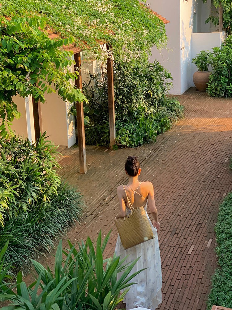 Our ‘Elladine’ dress whispers the delicate narrative of Eastern elegance, where every thread tells a story of refined sophistication. Inspired by the timeless beauty of blue and white porcelain, this dress transforms traditional craftsmanship into wearable art.