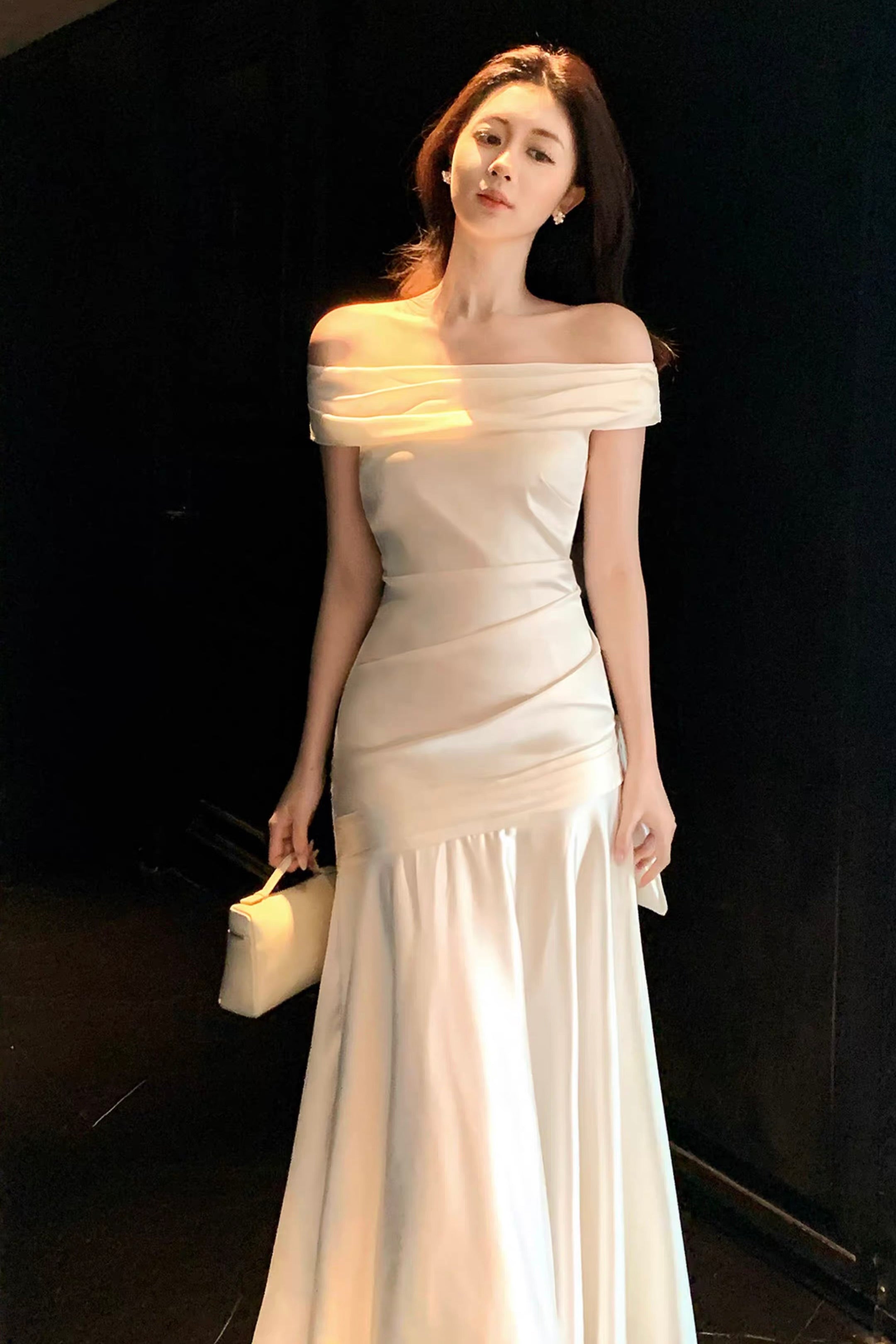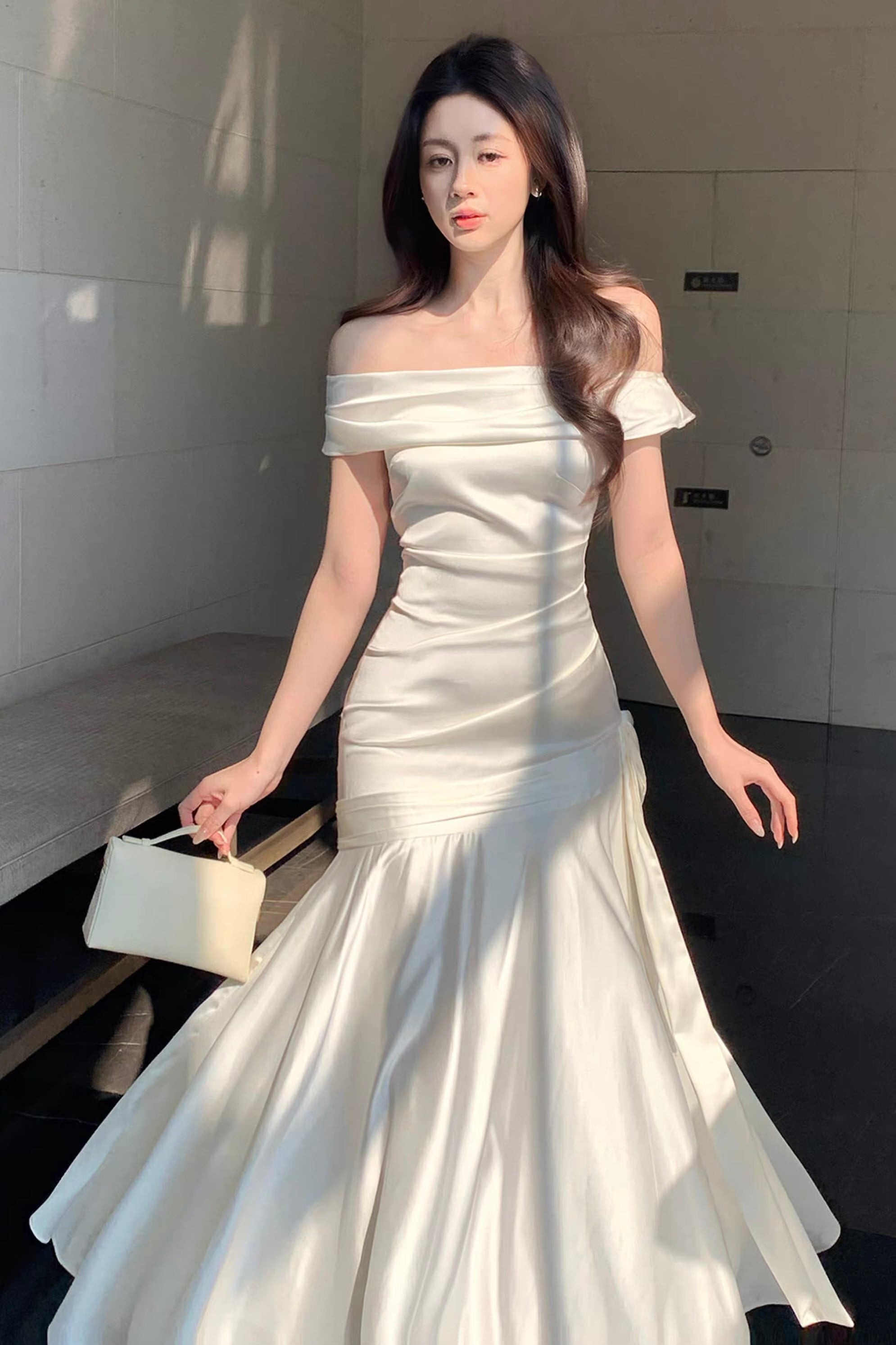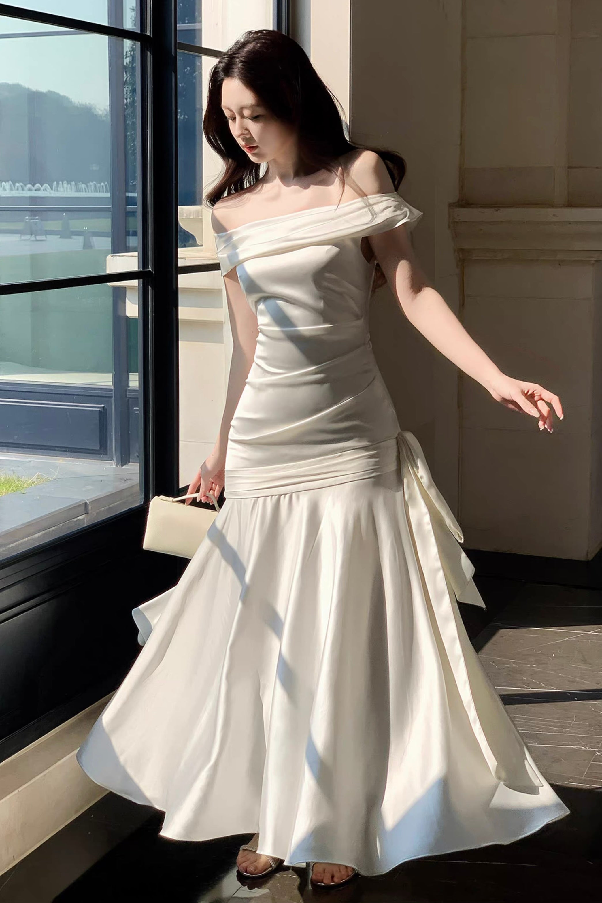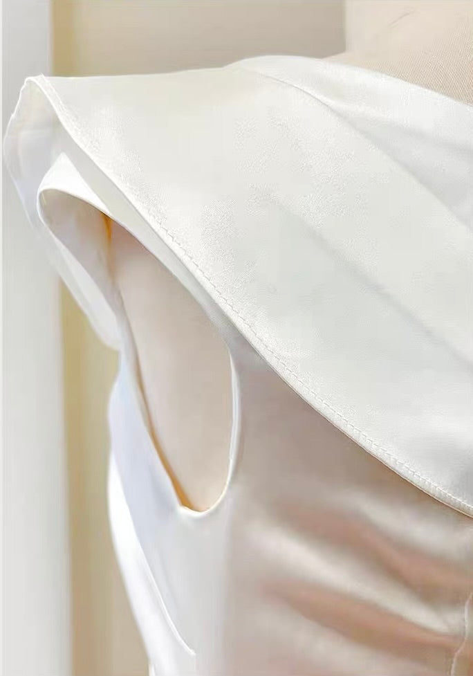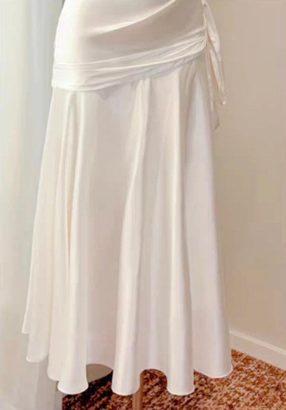 Below the hips, decorative ladder-style tie detailing meets a softly gathered fishtail skirt panel, designed to move fluidly with each step and accentuate the body’s natural S-curve. The fabric choice elevates the entire look, crafted from a premium rose satin with a luminous sheen that feels inherently luxurious, elegant, and fluid against the body. The soft snow-white tone brightens the complexion and enhances radiance.
