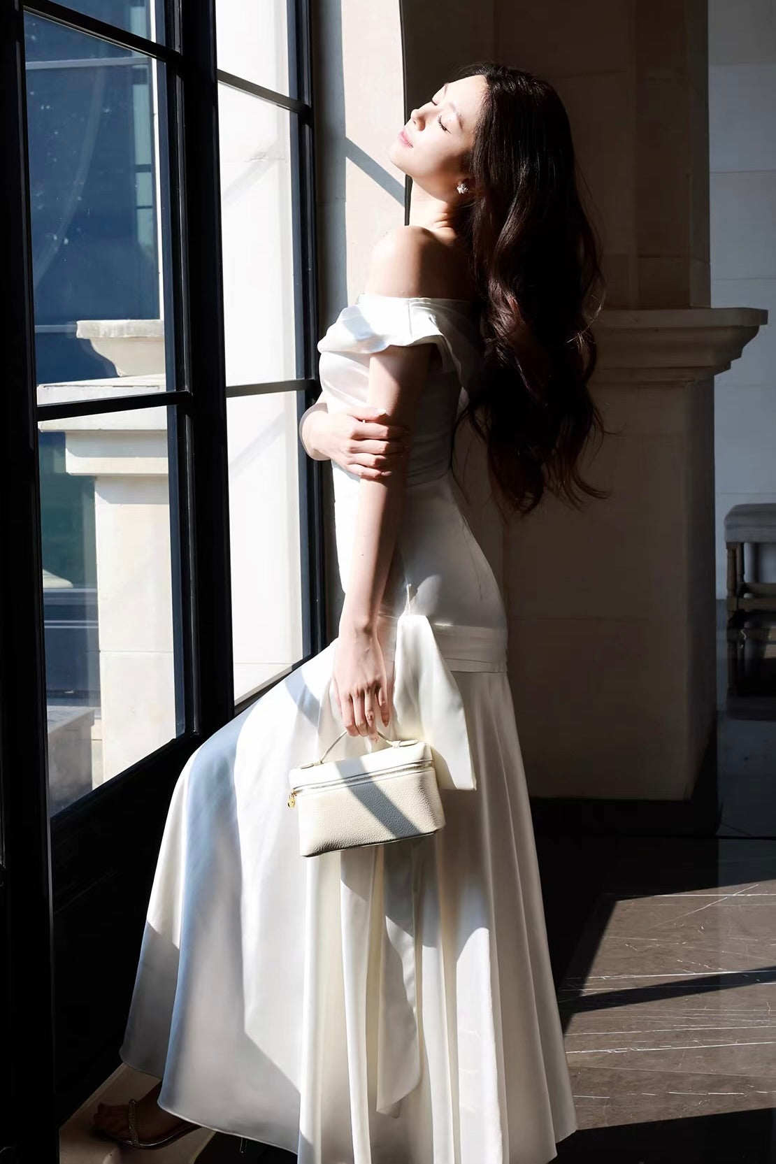 Worn off the shoulder, the neckline feels poised and composed, beautifully elongating the swan-like curve of the neck and collarbones while subtly refining the face shape. Styled on one shoulder, it leans into a softer, more sensual mood, drawing the eye to the shoulder and neckline, enhancing proportions and highlighting the elegance of bare skin with gentle confidence.