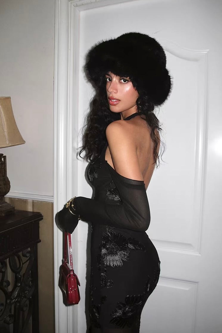 We fell in love with the contrast first. Airy sheer mesh drapes gently across the neckline, creating that effortless, floating movement that feels straight out of a 90s vintage party scene. The antique-inspired bust cups meet a softly cascading cowl, adding depth, romance, and a hint of retro allure without ever feeling too much.