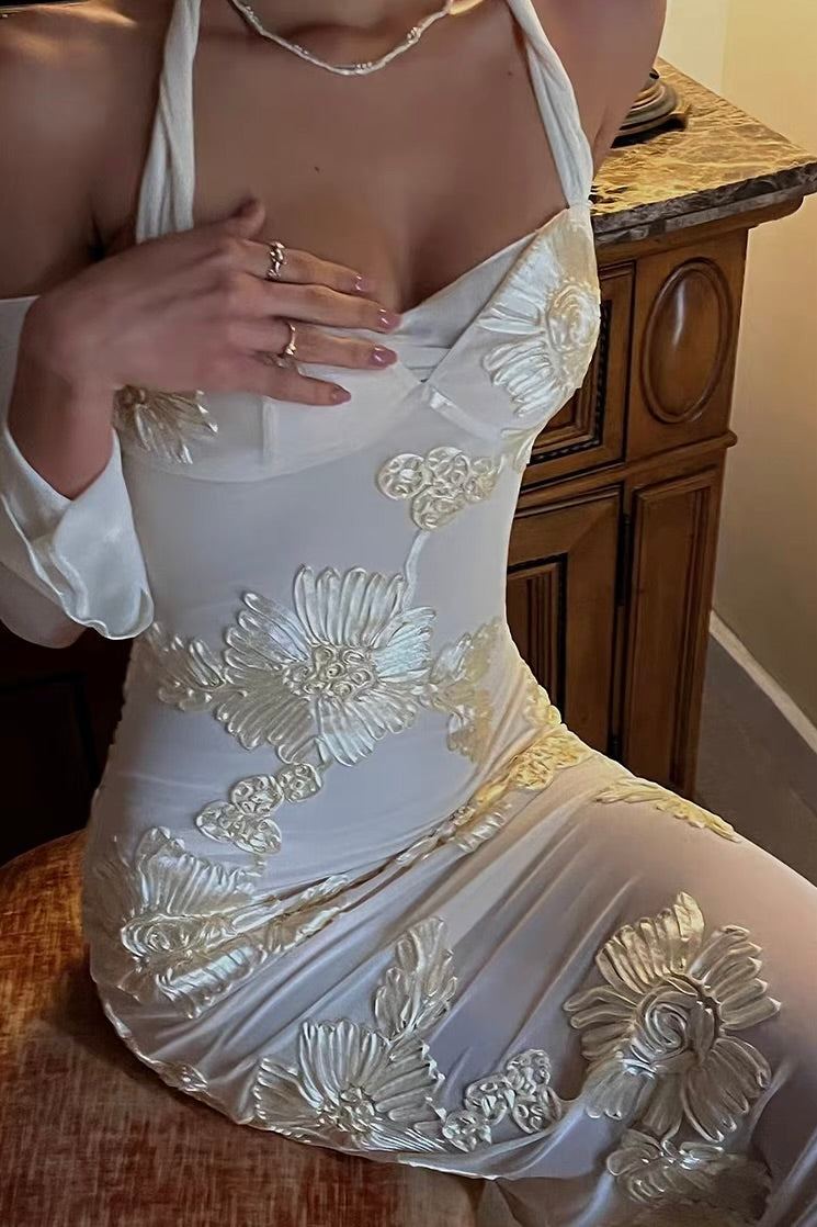 The outer layer is crafted from lightweight mesh, detailed with dimensional satin rosette appliqués that catch the light as you move. Underneath, a milk-silk lining offers high stretch, a smooth feel, and comfortable contouring that hugs the body while staying incredibly soft against the skin. You’ll notice how the sheer layers glow gently over the skin, creating that dreamy, honeyed romance from every angle.