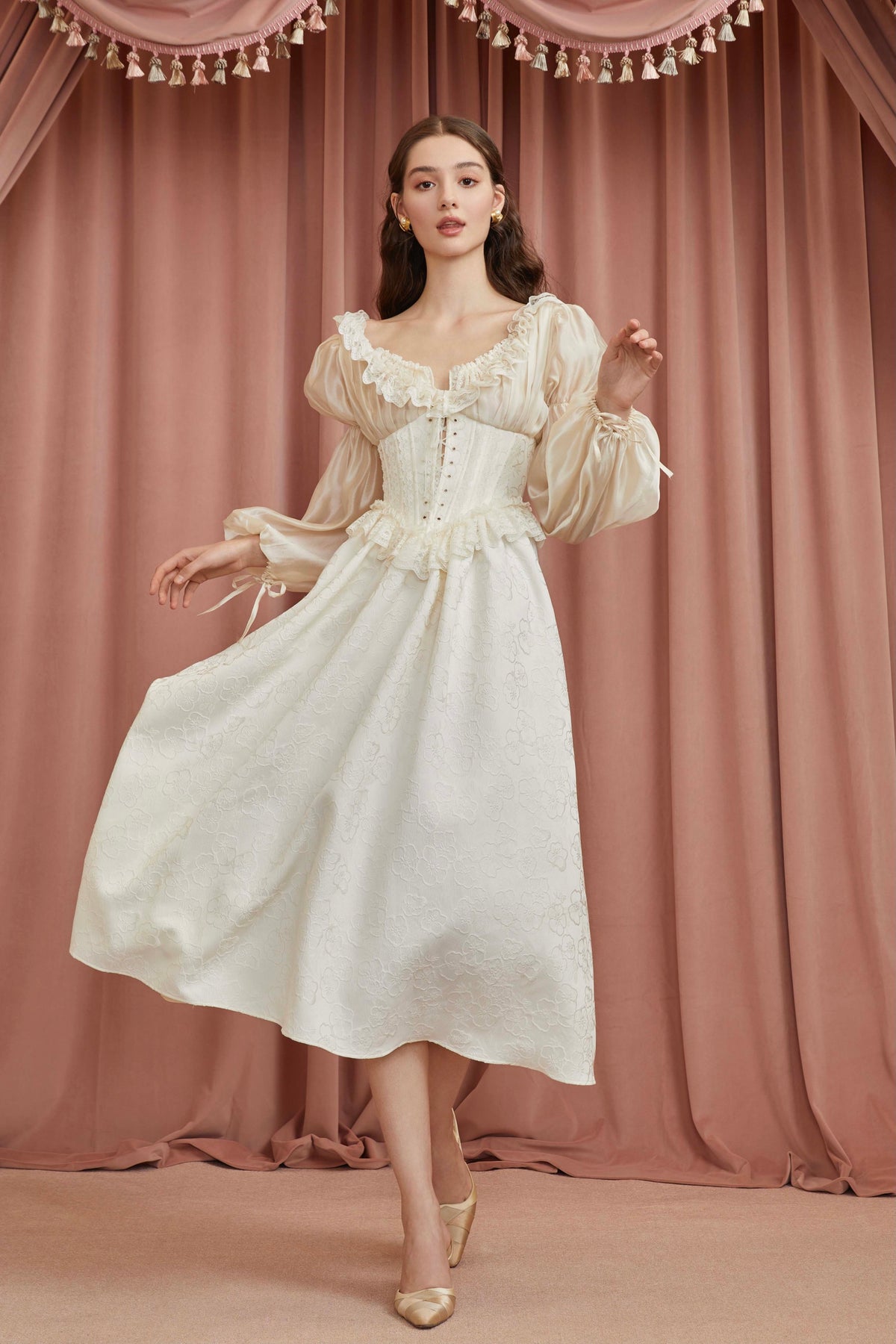 The corset-inspired bodice features lace-up details at the waist to gently sculpt the silhouette: structured, yet never restrictive. Adjustable drawstrings at the puff sleeves add a playful, customizable touch, and there’s also a hidden side zip that opens from the hem up (genius), so changing is quick and easy.