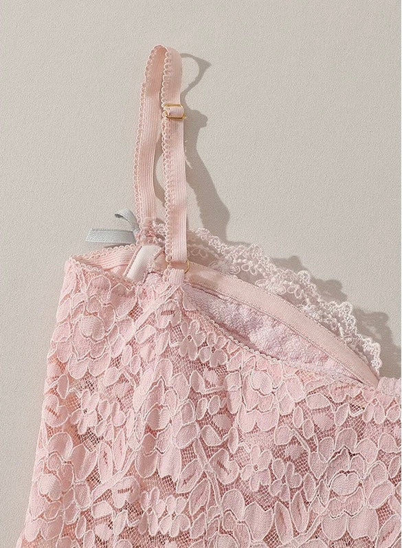 We start with a softly sculpted bodice: stretch lace with a subtle embossed motif hugs the figure, while our fishbone-inspired boning defines the waist and keeps the shape beautifully secure. Ruched sweetheart cups lift and frame the bust, then a ribbon of lace skims the neckline for that sweet, eye-catching finish we always love.