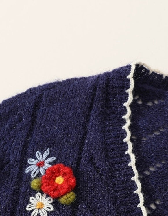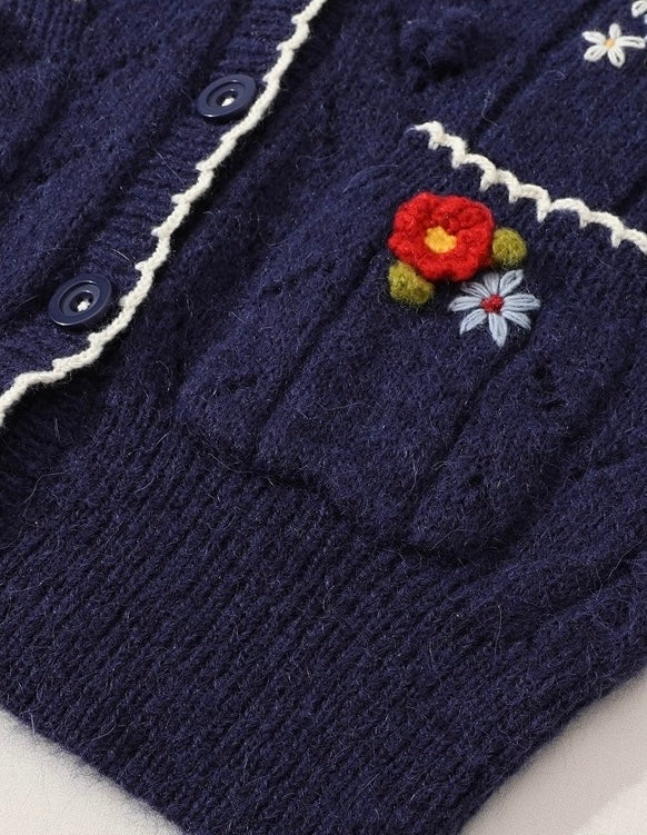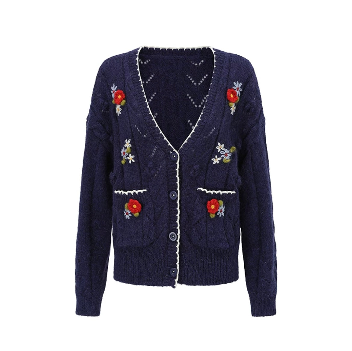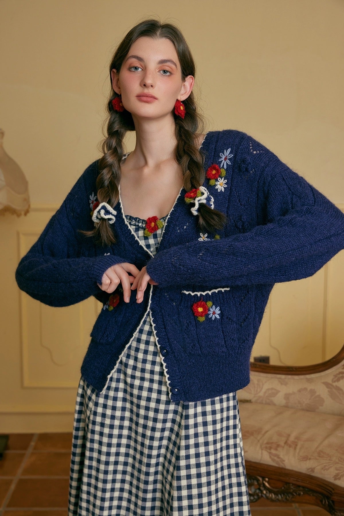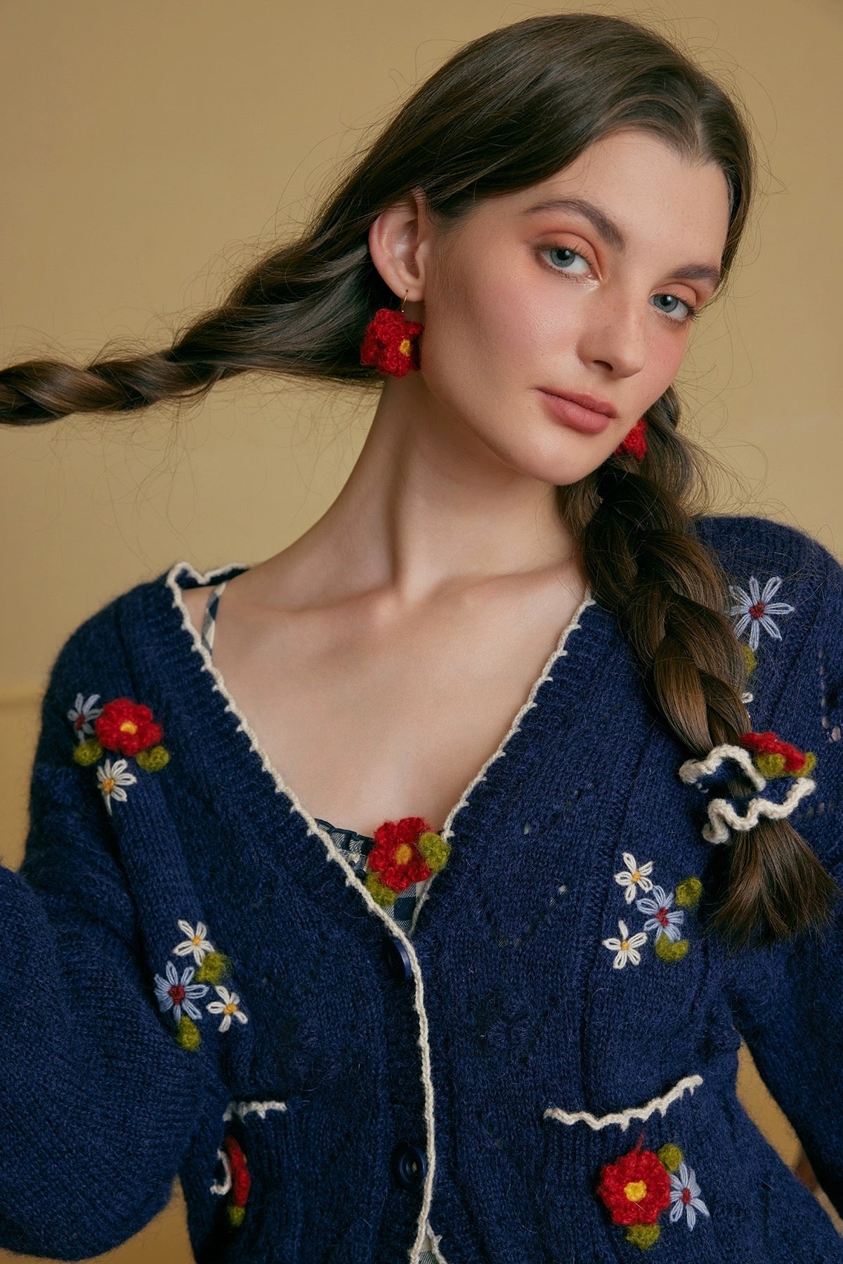 Now let’s talk about the cardigan: with its flattering V-neckline that frames your face beautifully, and hand-crocheted edging that whispers luxury in every stitch. The mix of dimensional crochet and embroidery at the front adds richness and charm, with colors that pop but stay elegant. Finished with resin buttons, two handy patch pockets, and a ribbed hem to keep things chic and cozy all at once.