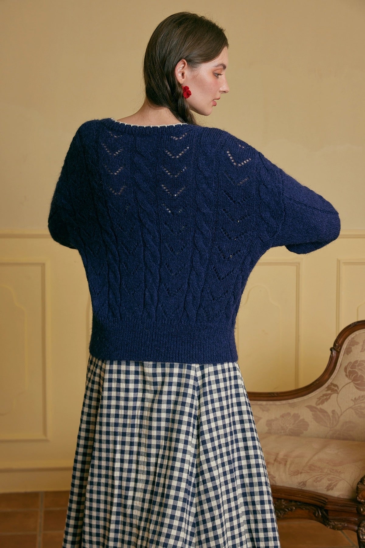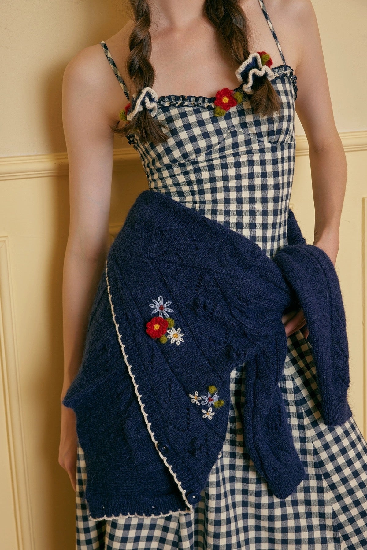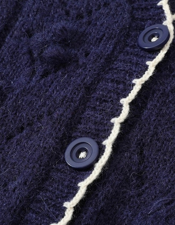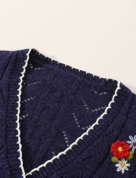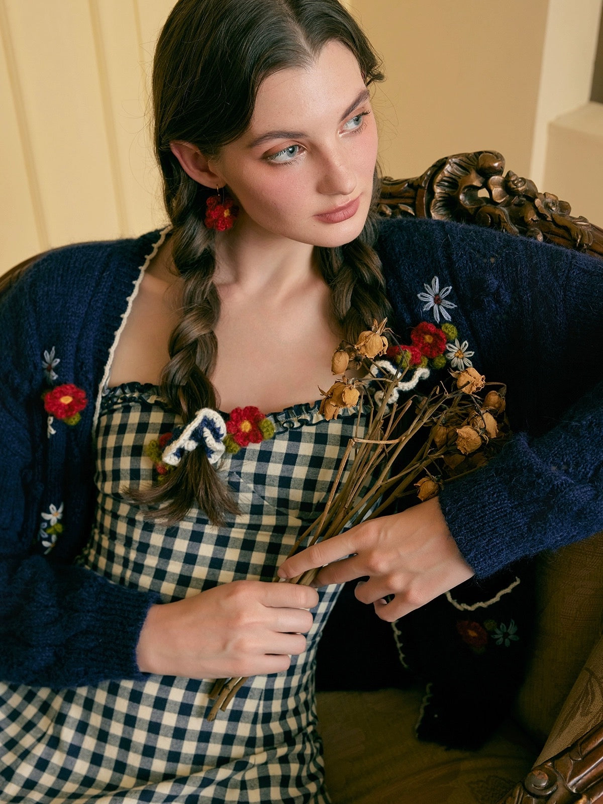 Now let’s talk about the cardigan: with its flattering V-neckline that frames your face beautifully, and hand-crocheted edging that whispers luxury in every stitch. The mix of dimensional crochet and embroidery at the front adds richness and charm, with colors that pop but stay elegant. Finished with resin buttons, two handy patch pockets, and a ribbed hem to keep things chic and cozy all at once.